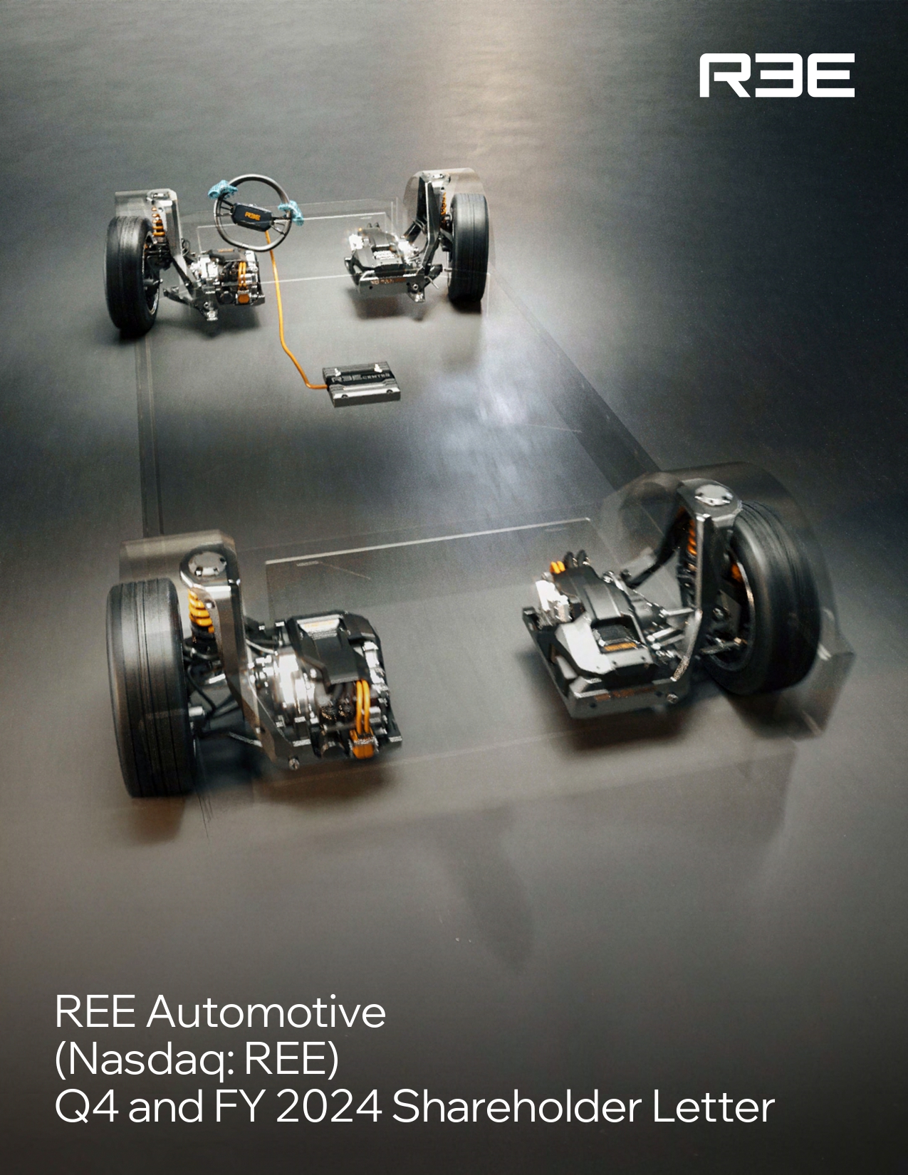 REE Automotive (Nasdaq: REE) Q4 and FY 2024 Shareholder Letter Dear Shareholders, 2024 marked a pivotal year for REE Automotive Ltd. (“REE” or the “Company”). We successfully accelerated our vision of software defined vehicles (SDV) technology from concept to commercial reality in 2024. Most notably, we became the first company to certify a full by - wire SDV for public road use in the U.S., a significant achievement and a testament to our technology and engineering. Building on this foundation, we continue to see growing interest from global OEMs, technology companies, and fleets for our mobility innovations. We believe that demand is being driven not just by the shift to electrification, but also by the wider advantages of SDV architecture — such as modularity, real - time upgradability, autonomy readiness and accelerated time - to - market. Shareholder letter Q4 and full year 2024 © 2025 REE. All rights reserved. 2 PROGRESS AND POSITIONING Our P7 product line achieved key technological and manufacturing milestones this year, showcasing the maturity of our SDV platform.