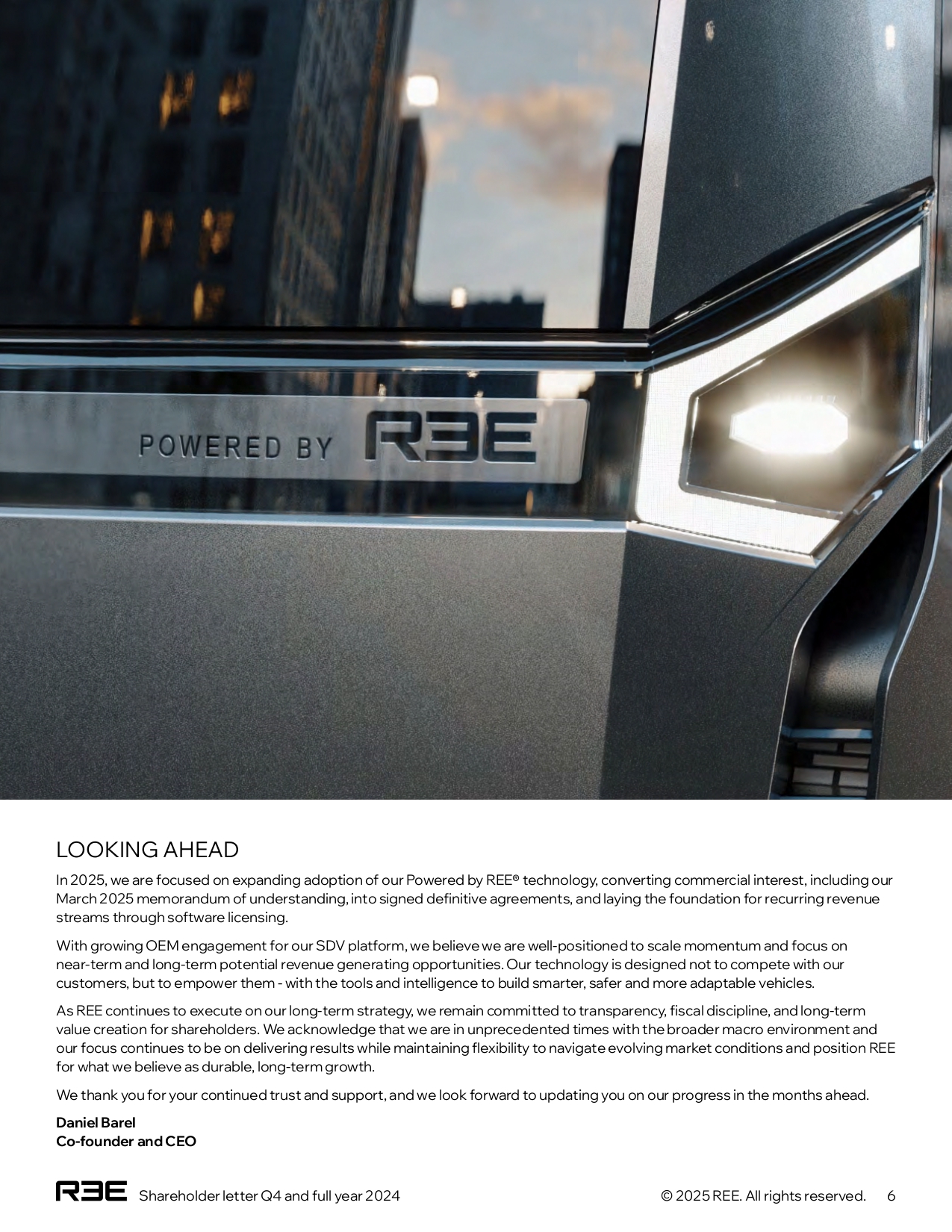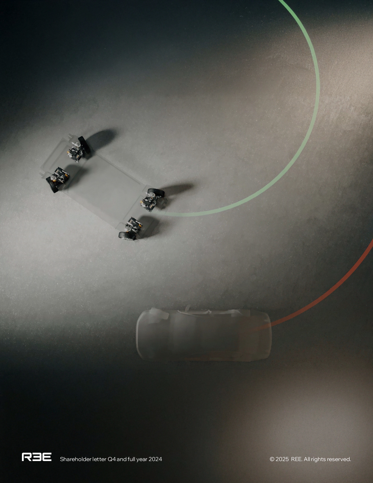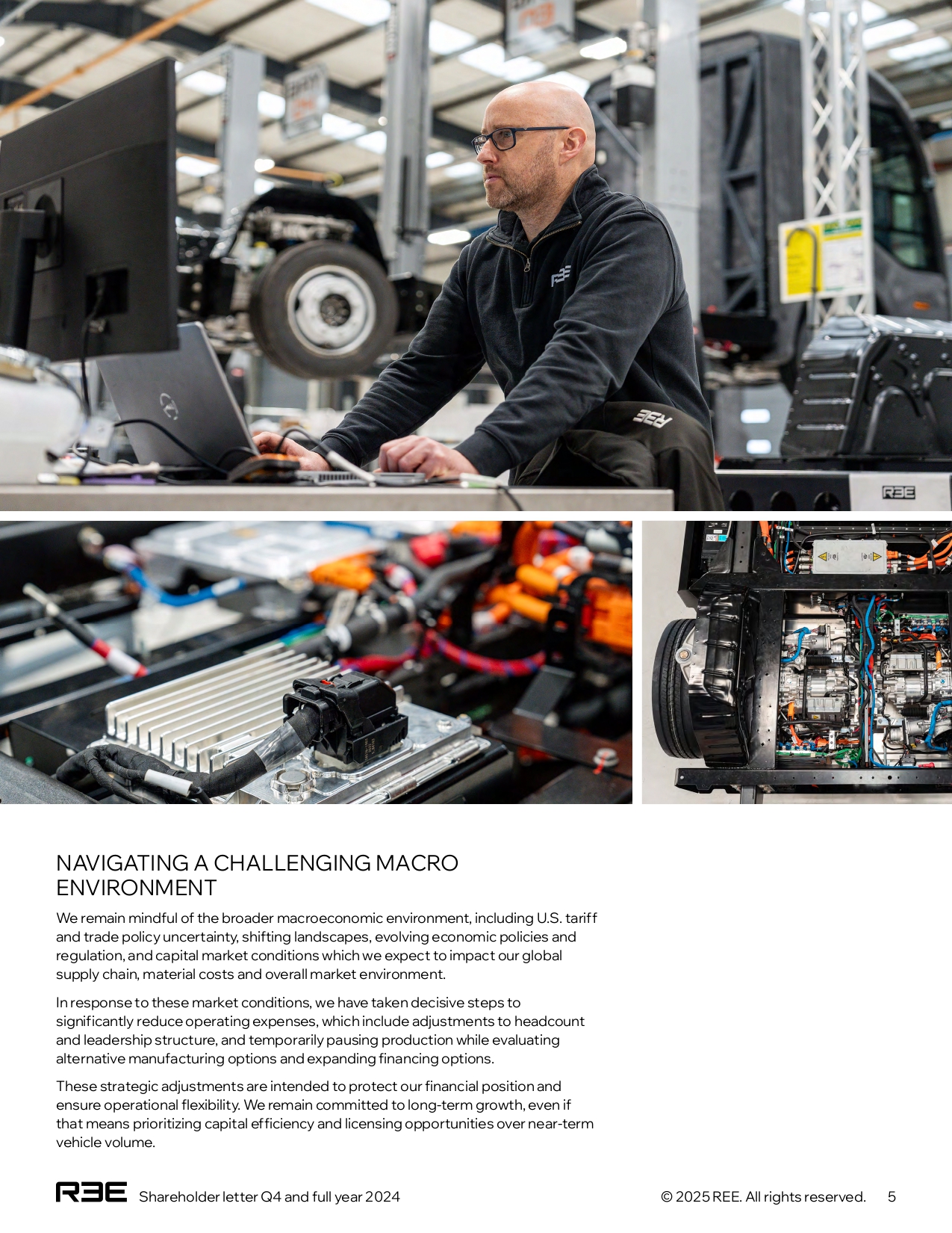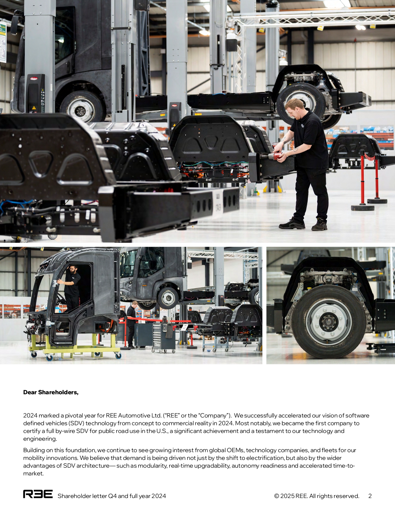 Encouragingly, customers cite superior SDV functionality as the primary driver behind their interest. In addition to our full vehicle reservations, we are in advanced discussions with major OEMs across various vehicle segments about incorporating our software and technology into their product lines. We see our partnership with Motherson Group, a global leader in manufacturing and supply chain management, as a further enhancement of our credibility in the automotive industry. We believe this collaboration will help us meet evolving market demand and reinforce our position as a reliable enabler of SDV innovation. Over the past 12 months, we raised approximately $81 million in gross proceeds led by our strategic investors M&G and Motherson. The capital was used to support production while strengthening market validation through demonstration. While these efforts have improved near - term liquidity, we continue to assess additional financing options to support the execution of our strategy. “REE Automotive’s biggest benefit to its customer is its technologically advanced modular software - defined EV platforms with its proprietary REEcorner technology that can integrate key components into compact modules, as a result optimizing space utilization, increasing overall system efficiency, resulting in lower Total Cost of Ownership (TCO). A major advantage REE Automotive’s customers have is that these platforms are made future - ready with REE’s Unified Architecture (RUA), merging its hardware features and software applications into one seamless operating system.” Marshall Martin , Program Manager, Commercial Mobility, Frost & Sullivan Shareholder letter Q4 and full year 2024 © 2025 REE. All rights reserved. 4 NAVIGATING A CHALLENGING MACRO ENVIRONMENT We remain mindful of the broader macroeconomic environment, including U.S. tariff and trade policy uncertainty, shifting landscapes, evolving economic policies and regulation, and capital market conditions which we expect to impact our global supply chain, material costs and overall market environment. In response to these market conditions, we have taken decisive steps to significantly reduce operating expenses, which include adjustments to headcount and leadership structure, and temporarily pausing production while evaluating alternative manufacturing options and expanding financing options. These strategic adjustments are intended to protect our financial position and ensure operational flexibility. We remain committed to long - term growth, even if that means prioritizing capital efficiency and licensing opportunities over near - term vehicle volume. Shareholder letter Q4 and full year 2024 © 2025 REE. All rights reserved. 5