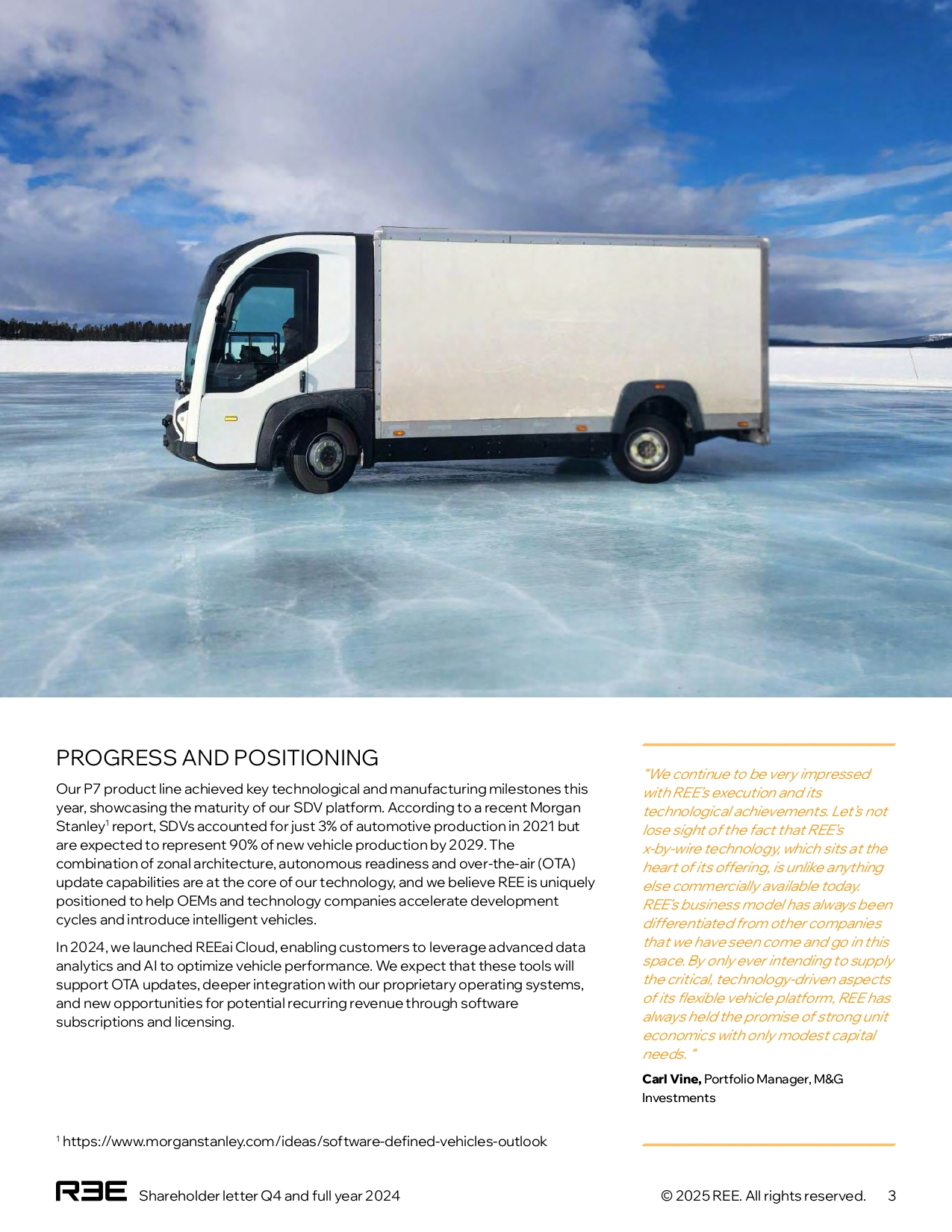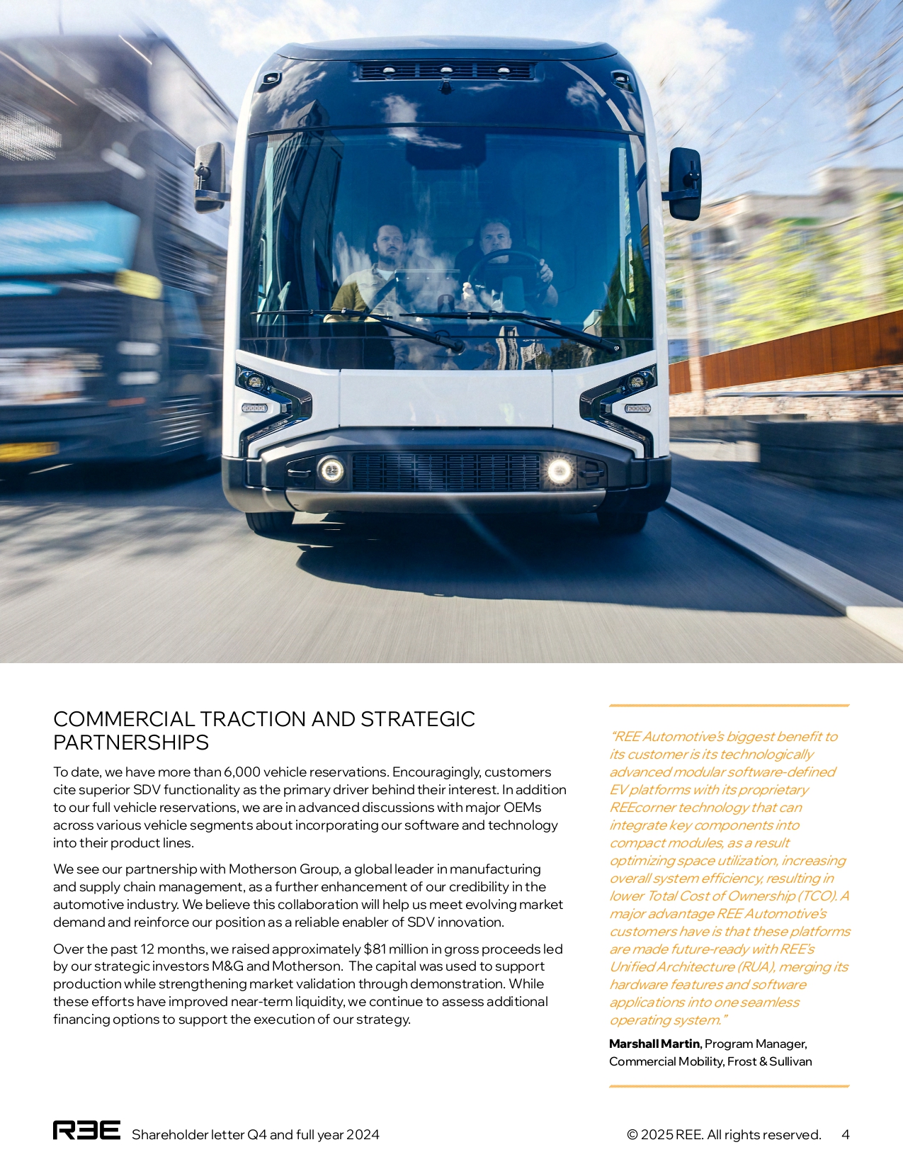 According to a recent Morgan Stanley 1 report, SDVs accounted for just 3% of automotive production in 2021 but are expected to represent 90% of new vehicle production by 2029. The combination of zonal architecture, autonomous readiness and over - the - air (OTA) update capabilities are at the core of our technology, and we believe REE is uniquely positioned to help OEMs and technology companies accelerate development cycles and introduce intelligent vehicles. In 2024, we launched REEai Cloud, enabling customers to leverage advanced data analytics and AI to optimize vehicle performance. We expect that these tools will support OTA updates, deeper integration with our proprietary operating systems, and new opportunities for potential recurring revenue through software subscriptions and licensing. 1 https:// www.morganstanley.com/ideas/software - defined - vehicles - outlook “We continue to be very impressed with REE’s execution and its technological achievements. Let’s not lose sight of the fact that REE’s x - by - wire technology, which sits at the heart of its offering, is unlike anything else commercially available today . REE’s business model has always been differentiated from other companies that we have seen come and go in this space. By only ever intending to supply the critical, technology - driven aspects of its flexible vehicle platform, REE has always held the promise of strong unit economics with only modest capital needs. “ Carl Vine, Portfolio Manager, M&G Investments Shareholder letter Q4 and full year 2024 © 2025 REE. All rights reserved. 3 COMMERCIAL TRACTION AND STRATEGIC PARTNERSHIPS To date, we have more than 6,000 vehicle reservations.