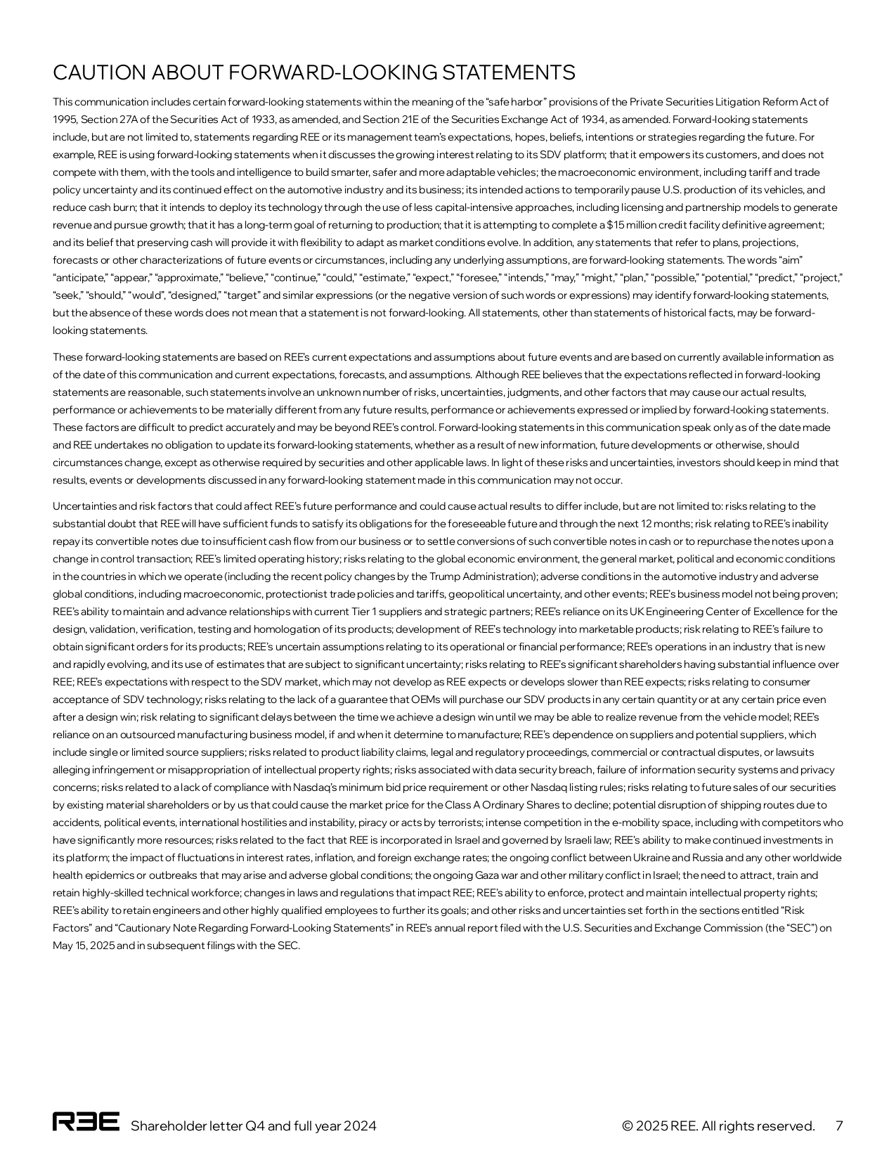 LOOKING AHEAD In 2025, we are focused on expanding adoption of our Powered by REE® technology, converting commercial interest, including our March 2025 memorandum of understanding, into signed definitive agreements, and laying the foundation for recurring revenue streams through software licensing. With growing OEM engagement for our SDV platform, we believe we are well - positioned to scale momentum and focus on near - term and long - term potential revenue generating opportunities . Our technology is designed not to compete with our customers, but to empower them - with the tools and intelligence to build smarter, safer and more adaptable vehicles . As REE continues to execute on our long - term strategy, we remain committed to transparency, fiscal discipline, and long - term value creation for shareholders. We acknowledge that we are in unprecedented times with the broader macro environment and our focus continues to be on delivering results while maintaining flexibility to navigate evolving market conditions and position REE for what we believe as durable, long - term growth. We thank you for your continued trust and support, and we look forward to updating you on our progress in the months ahead. Daniel Barel Co - founder and CEO Shareholder letter Q4 and full year 2024 © 2025 REE. All rights reserved. 6 CAUTION ABOUT FORWARD - LOOKING STATEMENTS This communication includes certain forward - looking statements within the meaning of the “safe harbor” provisions of the Private Securities Litigation Reform Act of 1995, Section 27A of the Securities Act of 1933, as amended, and Section 21E of the Securities Exchange Act of 1934, as amended.