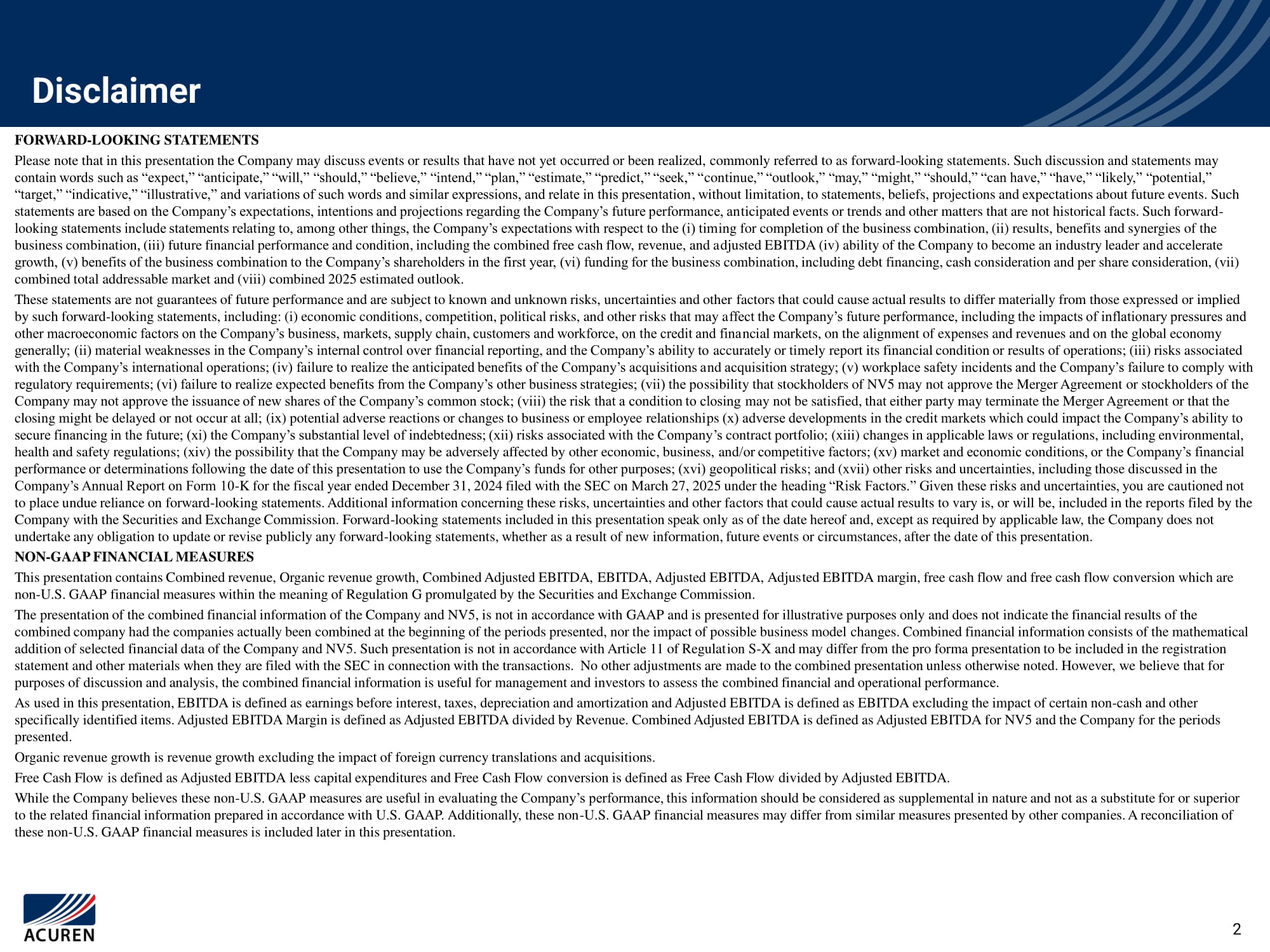 Such discussion and statements may contain words such as “expect,” “anticipate,” “will,” “should,” “believe,” “intend,” “plan,” “estimate,” “predict,” “seek,” “continue,” “outlook,” “may,” “might,” “should,” “can have,” “have,” “likely,” “potential,” “target,” “indicative,” “illustrative,” and variations of such words and similar expressions, and relate in this presentation, without limitation, to statements, beliefs, projections and expectations about future events. Such statements are based on the Company’s expectations, intentions and projections regarding the Company’s future performance, anticipated events or trends and other matters that are not historical facts. Such forward - looking statements include statements relating to, among other things, the Company’s expectations with respect to the (i) timing for completion of the business combination, (ii) results, benefits and synergies of the business combination, (iii) future financial performance and condition, including the combined free cash flow, revenue, and adjusted EBITDA (iv) ability of the Company to become an industry leader and accelerate growth, (v) benefits of the business combination to the Company’s shareholders in the first year, (vi) funding for the business combination, including debt financing, cash consideration and per share consideration, (vii) combined total addressable market and (viii) combined 2025 estimated outlook. These statements are not guarantees of future performance and are subject to known and unknown risks, uncertainties and other factors that could cause actual results to differ materially from those expressed or implied by such forward - looking statements, including: (i) economic conditions, competition, political risks, and other risks that may affect the Company’s future performance, including the impacts of inflationary pressures and other macroeconomic factors on the Company’s business, markets, supply chain, customers and workforce, on the credit and financial markets, on the alignment of expenses and revenues and on the global economy generally; (ii) material weaknesses in the Company’s internal control over financial reporting, and the Company’s ability to accurately or timely report its financial condition or results of operations; (iii) risks associated with the Company’s international operations; (iv) failure to realize the anticipated benefits of the Company’s acquisitions and acquisition strategy; (v) workplace safety incidents and the Company’s failure to comply with regulatory requirements; (vi) failure to realize expected benefits from the Company’s other business strategies; (vii) the possibility that stockholders of NV5 may not approve the Merger Agreement or stockholders of the Company may not approve the issuance of new shares of the Company’s common stock; (viii) the risk that a condition to closing may not be satisfied, that either party may terminate the Merger Agreement or that the closing might be delayed or not occur at all; (ix) potential adverse reactions or changes to business or employee relationships (x) adverse developments in the credit markets which could impact the Company’s ability to secure financing in the future; (xi) the Company’s substantial level of indebtedness; (xii) risks associated with the Company’s contract portfolio; (xiii) changes in applicable laws or regulations, including environmental, health and safety regulations; (xiv) the possibility that the Company may be adversely affected by other economic, business, and/or competitive factors; (xv) market and economic conditions, or the Company’s financial performance or determinations following the date of this presentation to use the Company’s funds for other purposes; (xvi) geopolitical risks; and (xvii) other risks and uncertainties, including those discussed in the Company’s Annual Report on Form 10 - K for the fiscal year ended December 31, 2024 filed with the SEC on March 27, 2025 under the heading “Risk Factors.” Given these risks and uncertainties, you are cautioned not to place undue reliance on forward - looking statements. Additional information concerning these risks, uncertainties and other factors that could cause actual results to vary is, or will be, included in the reports filed by the Company with the Securities and Exchange Commission. Forward - looking statements included in this presentation speak only as of the date hereof and, except as required by applicable law, the Company does not undertake any obligation to update or revise publicly any forward - looking statements, whether as a result of new information, future events or circumstances, after the date of this presentation. NON - GAAP FINANCIAL MEASURES This presentation contains Combined revenue, Organic revenue growth, Combined Adjusted EBITDA, EBITDA, Adjusted EBITDA, Adjusted EBITDA margin, free cash flow and free cash flow conversion which are non - U.S. GAAP financial measures within the meaning of Regulation G promulgated by the Securities and Exchange Commission. The presentation of the combined financial information of the Company and NV5, is not in accordance with GAAP and is presented for illustrative purposes only and does not indicate the financial results of the combined company had the companies actually been combined at the beginning of the periods presented, nor the impact of possible business model changes. Combined financial information consists of the mathematical addition of selected financial data of the Company and NV5. Such presentation is not in accordance with Article 11 of Regulation S - X and may differ from the pro forma presentation to be included in the registration statement and other materials when they are filed with the SEC in connection with the transactions. No other adjustments are made to the combined presentation unless otherwise noted. However, we believe