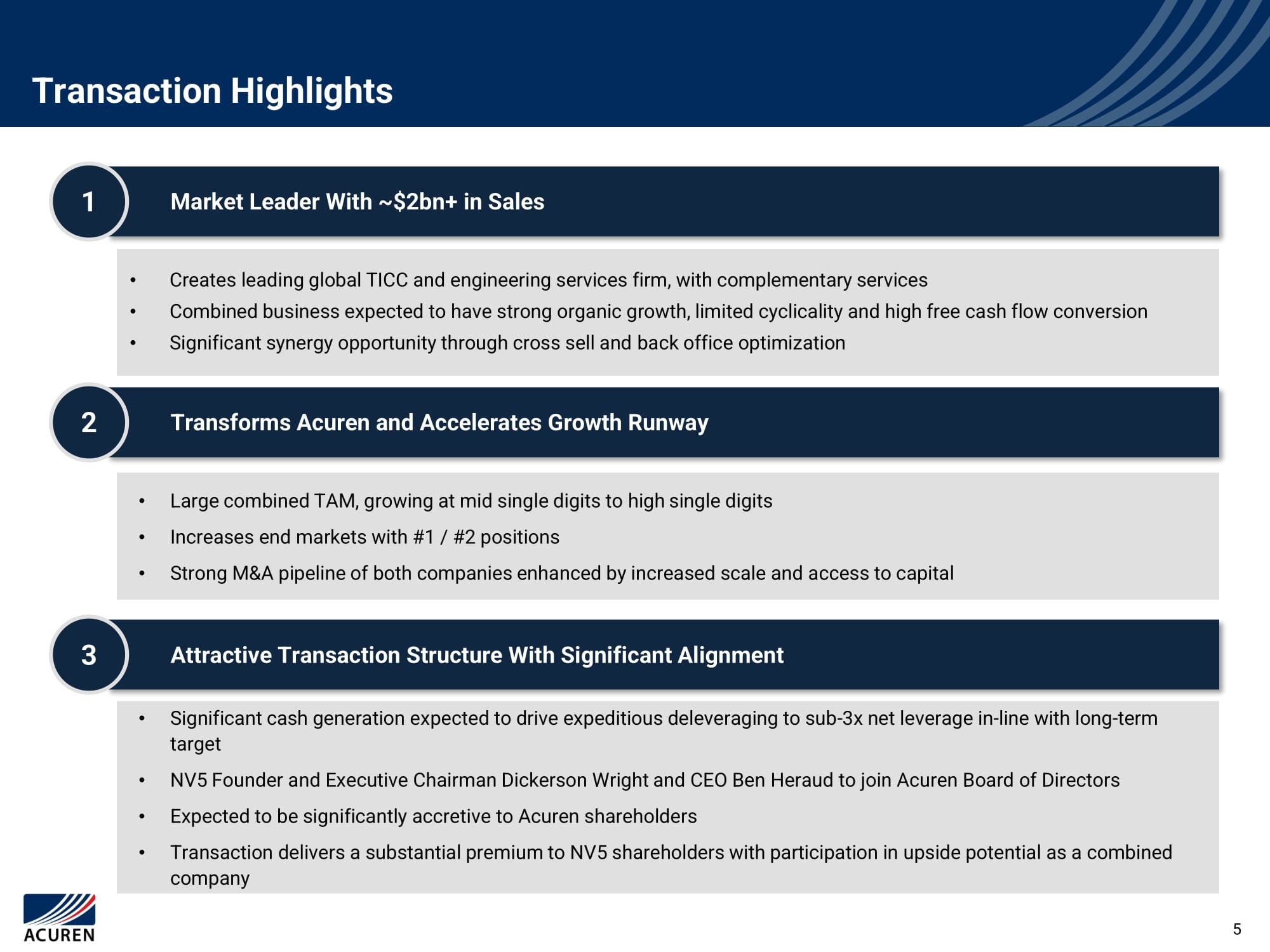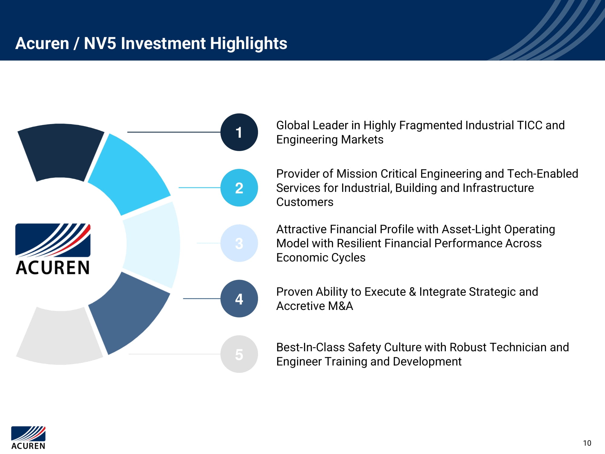 Disclaimer 3 No Offer or Solicitation This presentation does not constitute an offer to sell or the solicitation of an offer to subscribe for or buy any securities or a solicitation of any vote or approval with respect to the Transactions or otherwise, nor shall there be any sale, issuance or transfer of securities in any jurisdiction in which such offer, solicitation or sale would be unlawful prior to registration or qualification under the securities laws of any such jurisdiction. Important Additional Information In connection with the Transactions, NV5 and the Company intend to file materials with the SEC, including the Registration Statement that will include a joint proxy statement/prospectus of NV5 and the Company. After the Registration Statement is declared effective by the SEC, NV5 and the Company intend to mail a definitive proxy statement/prospectus to the stockholders of NV5 and the stockholders of the Company. This communication is not a substitute for the joint proxy statement/prospectus or the Registration Statement or for any other document that NV5 or the Company may file with the SEC and send to NV5’s stockholders and/or the Company’s stockholders in connection with the Transactions. INVESTORS AND SECURITY HOLDERS OF NV5 AND ACUREN ARE URGED TO CAREFULLY AND THOROUGHLY READ THE JOINT PROXY STATEMENT/PROSPECTUS AND THE REGISTRATION STATEMENT, AS EACH MAY BE AMENDED OR SUPPLEMENTED FROM TIME TO TIME, AND OTHER RELEVANT DOCUMENTS FILED BY NV5 AND ACUREN WITH THE SEC, WHEN THEY BECOME AVAILABLE BECAUSE THEY WILL CONTAIN IMPORTANT INFORMATION ABOUT NV5, ACUREN, THE TRANSACTIONS, THE RISKS RELATED THERETO AND RELATED MATTERS. Investors will be able to obtain free copies of the Registration Statement and the joint proxy statement/prospectus, as each may be amended from time to time, and other relevant documents filed by NV5 and the Company with the SEC (when they become available) through the website maintained by the SEC at www.sec.gov. Copies of documents filed with the SEC by NV5 will be available free of charge from NV5’s website at www.nv5.com under the “Investor Relations” tab or by contacting NV5’s Investor Relations Department ir@NV5.com, or by calling (954) 637 - 8048. Copies of documents filed with the SEC by the Company will be available free of charge from the Company’s website at www.acuren.com under the “Investor Relations” tab or by contacting the Company’s Investor Relations Department at IR@acuren.com. Participants in the Solicitation NV5, the Company and their respective directors and certain of their executive officers and other members of management and employees may be deemed, under SEC rules, to be participants in the solicitation of proxies from NV5’s stockholders and the Company’s stockholders in connection with the Transactions. Information regarding the executive officers and directors of the Company is included in its Annual Report on Form 10 - K filed with the SEC on March 27, 2025. Information regarding the executive officers and directors of NV5 is included in its amendment to its Annual Report on Form 10 - K/A filed with the SEC on April 28, 2025. Additional information regarding the persons who may be deemed participants and their direct and indirect interests, by security holdings or otherwise, will be set forth in the Registration Statement and other materials when they are filed with the SEC in connection with the Transactions. Free copies of these documents may be obtained as described in the paragraphs above.