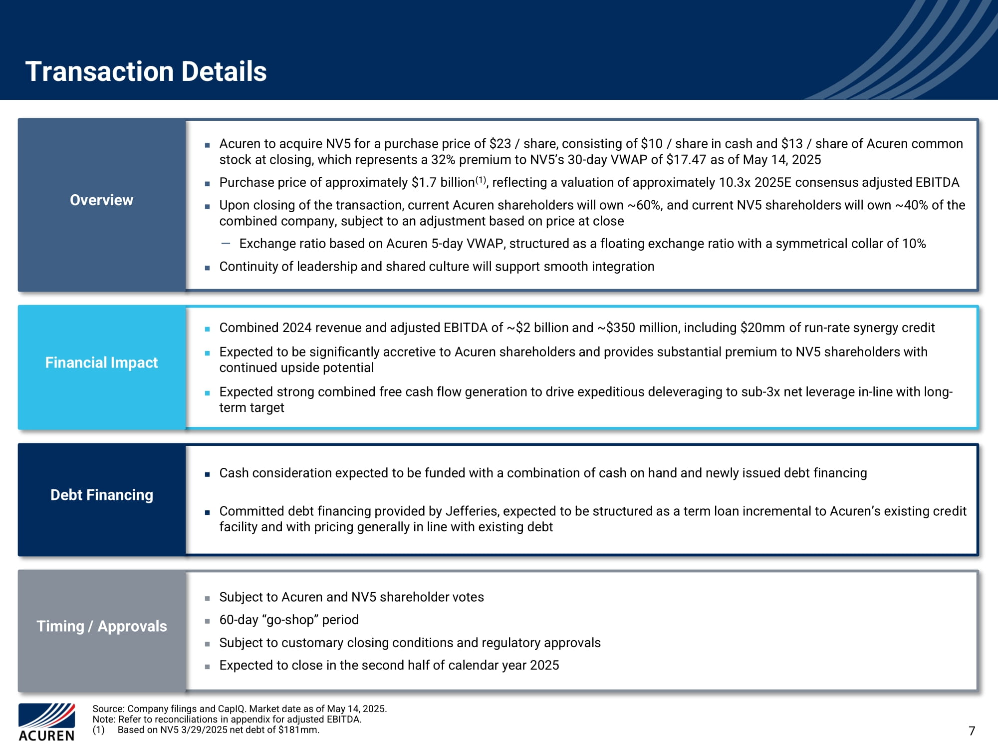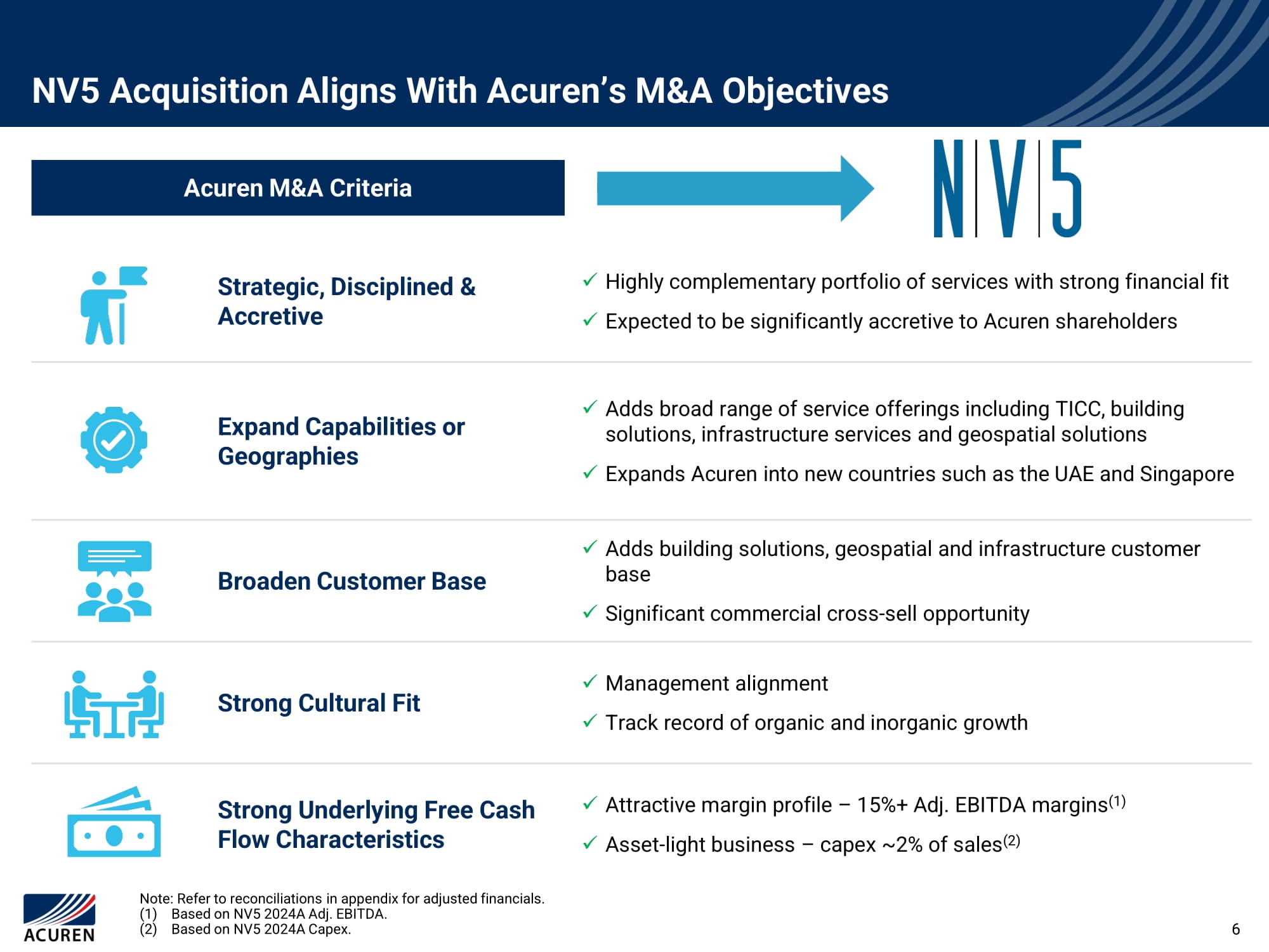 Franklin Co – Chairman Ben Heraud Chief Executive Officer Dickerson Wright Executive Chairman Transaction Highlights 5 Market Leader With ~$2bn+ in Sales 1 Transforms Acuren and Accelerates Growth Runway 2 Attractive Transaction Structure With Significant Alignment 3 • Creates leading global TICC and engineering services firm, with complementary services • Combined business expected to have strong organic growth, limited cyclicality and high free cash flow conversion • Significant synergy opportunity through cross sell and back office optimization • Large combined TAM, growing at mid single digits to high single digits • Increases end markets with 1 / 2 positions • Strong M&A pipeline of both companies enhanced by increased scale and access to capital • Significant cash generation expected to drive expeditious deleveraging to sub - 3x net leverage in - line with long - term target • NV5 Founder and Executive Chairman Dickerson Wright and CEO Ben Heraud to join Acuren Board of Directors • Expected to be significantly accretive to Acuren shareholders • Transaction delivers a substantial premium to NV5 shareholders with participation in upside potential as a combined company x Highly complementary portfolio of services with strong financial fit x Expected to be significantly accretive to Acuren shareholders Strategic, Disciplined & Accretive x Adds broad range of service offerings including TICC, building solutions, infrastructure services and geospatial solutions x Expands Acuren into new countries such as the UAE and Singapore Expand Capabilities or Geographies x Adds building solutions, geospatial and infrastructure customer base x Significant commercial cross - sell opportunity Broaden Customer Base x Management alignment x Track record of organic and inorganic growth Strong Cultural Fit x Attractive margin profile – 15%+ Adj.