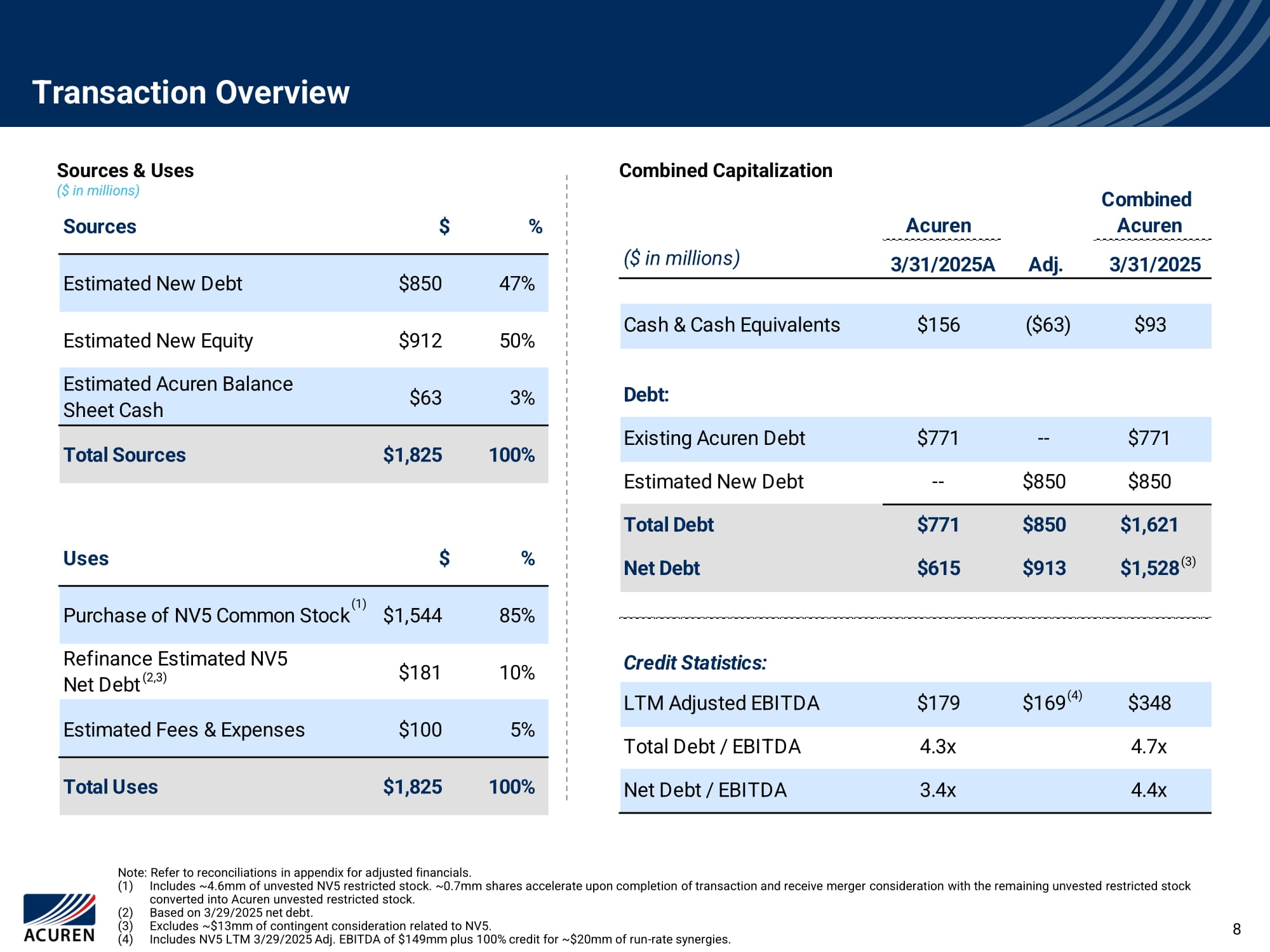 Acuren M&A Criteria 7 Transaction Details Cash consideration expected to be funded with a combination of cash on hand and newly issued debt financing Committed debt financing provided by Jefferies, expected to be structured as a term loan incremental to Acuren’s existing credit facility and with pricing generally in line with existing debt Debt Financing Subject to Acuren and NV5 shareholder votes 60 - day “go - shop” period Subject to customary closing conditions and regulatory approvals Expected to close in the second half of calendar year 2025 Timing / Approvals Combined 2024 revenue and adjusted EBITDA of ~$2 billion and ~$350 million, including $20mm of run - rate synergy credit Expected to be significantly accretive to Acuren shareholders and provides substantial premium to NV5 shareholders with continued upside potential Expected strong combined free cash flow generation to drive expeditious deleveraging to sub - 3x net leverage in - line with long - term target Financial Impact Acuren to acquire NV5 for a purchase price of $23 / share, consisting of $10 / share in cash and $13 / share of Acuren common stock at closing, which represents a 32% premium to NV5’s 30 - day VWAP of $17.47 as of May 14, 2025 Purchase price of approximately $1.7 billion (1) , reflecting a valuation of approximately 10.3x 2025E consensus adjusted EBITDA Upon closing of the transaction, current Acuren shareholders will own ~60%, and current NV5 shareholders will own ~40% of the combined company, subject to an adjustment based on price at close — Exchange ratio based on Acuren 5 - day VWAP, structured as a floating exchange ratio with a symmetrical collar of 10% Continuity of leadership and shared culture will support smooth integration Overview Source: Company filings and CapIQ. Market date as of May 14, 2025. Note: Refer to reconciliations in appendix for adjusted EBITDA. (1) Based on NV5 3/29/2025 net debt of $181mm.