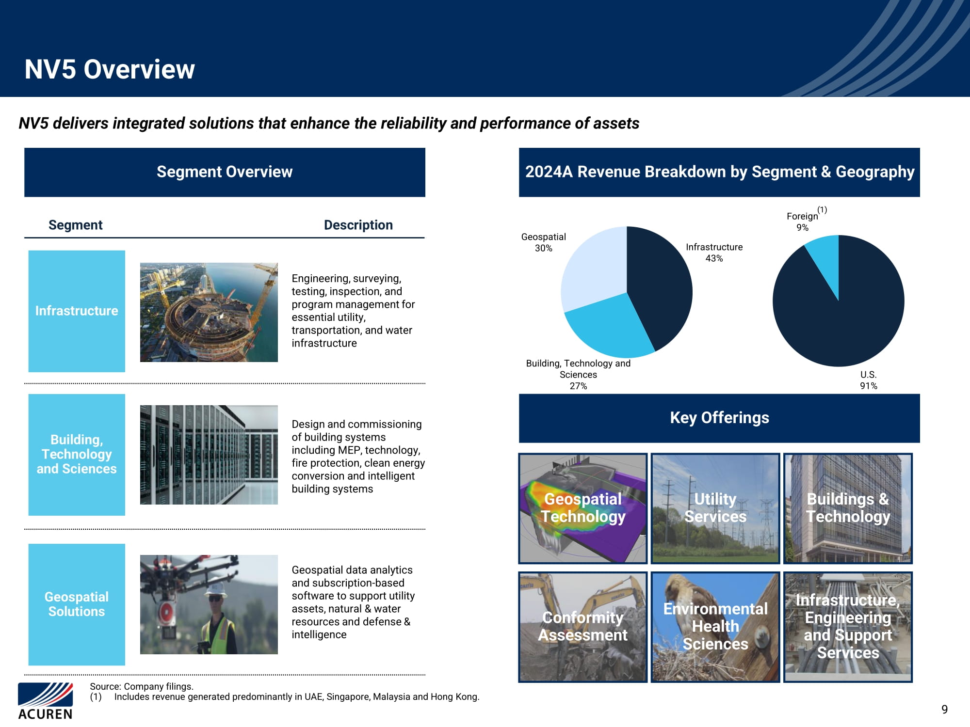 3/31/2025 Adj. 3/31/2025A ($ in millions) $93 ($63) $156 Cash & Cash Equivalents Debt: $771 - - $771 Existing Acuren Debt $850 $850 - - Estimated New Debt $1,621 $850 $771 Total Debt Net Debt $615 $913 $1,528 (3) Credit Statistics: $348 $169 (4) $179 LTM Adjusted EBITDA 4.7x 4.3x Total Debt / EBITDA 4.4x 3.4x Net Debt / EBITDA Acuren Combined Acuren Transaction Overview 8 Sources & Uses ($ in millions) Combined Capitalization 47% $850 Estimated New Debt 50% $912 Estimated New Equity 3% $63 Estimated Acuren Balance Sheet Cash 100% $1,825 Total Sources 85% $1,544 (1) Purchase of NV5 Common Stock 10% $181 Refinance Estimated NV5 Net Debt (2,3) 5% $100 Estimated Fees & Expenses 100% $1,825 Total Uses Sources $ % Uses $ % Note: Refer to reconciliations in appendix for adjusted financials. (1) Includes ~4.6mm of unvested NV5 restricted stock. ~0.7mm shares accelerate upon completion of transaction and receive merger consideration with the remaining unvested restricted stock converted into Acuren unvested restricted stock. (2) Based on 3/29/2025 net debt. (3) Excludes ~$13mm of contingent consideration related to NV5. (4) Includes NV5 LTM 3/29/2025 Adj. EBITDA of $149mm plus 100% credit for ~$20mm of run - rate synergies.