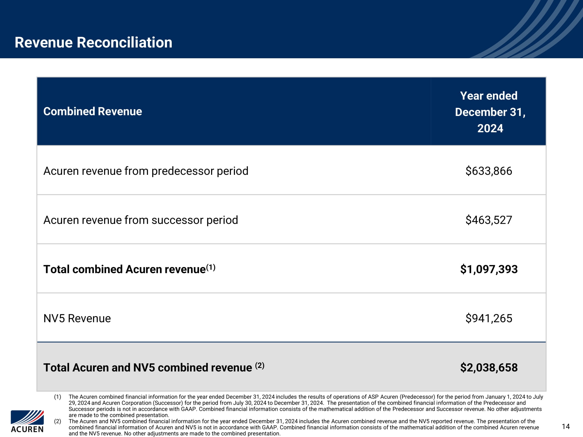 | 2. | The Acuren and NV5 combined financial information for the year ended December 31, 2024 includes the Acuren combined revenue and the NV5 reported revenue. The presentation of the combined financial information of Acuren and NV5 is not in accordance with GAAP. Combined financial information consists of the mathematical addition of the combined Acuren revenue and the NV5 revenue. No other adjustments are made to the combined presentation. |