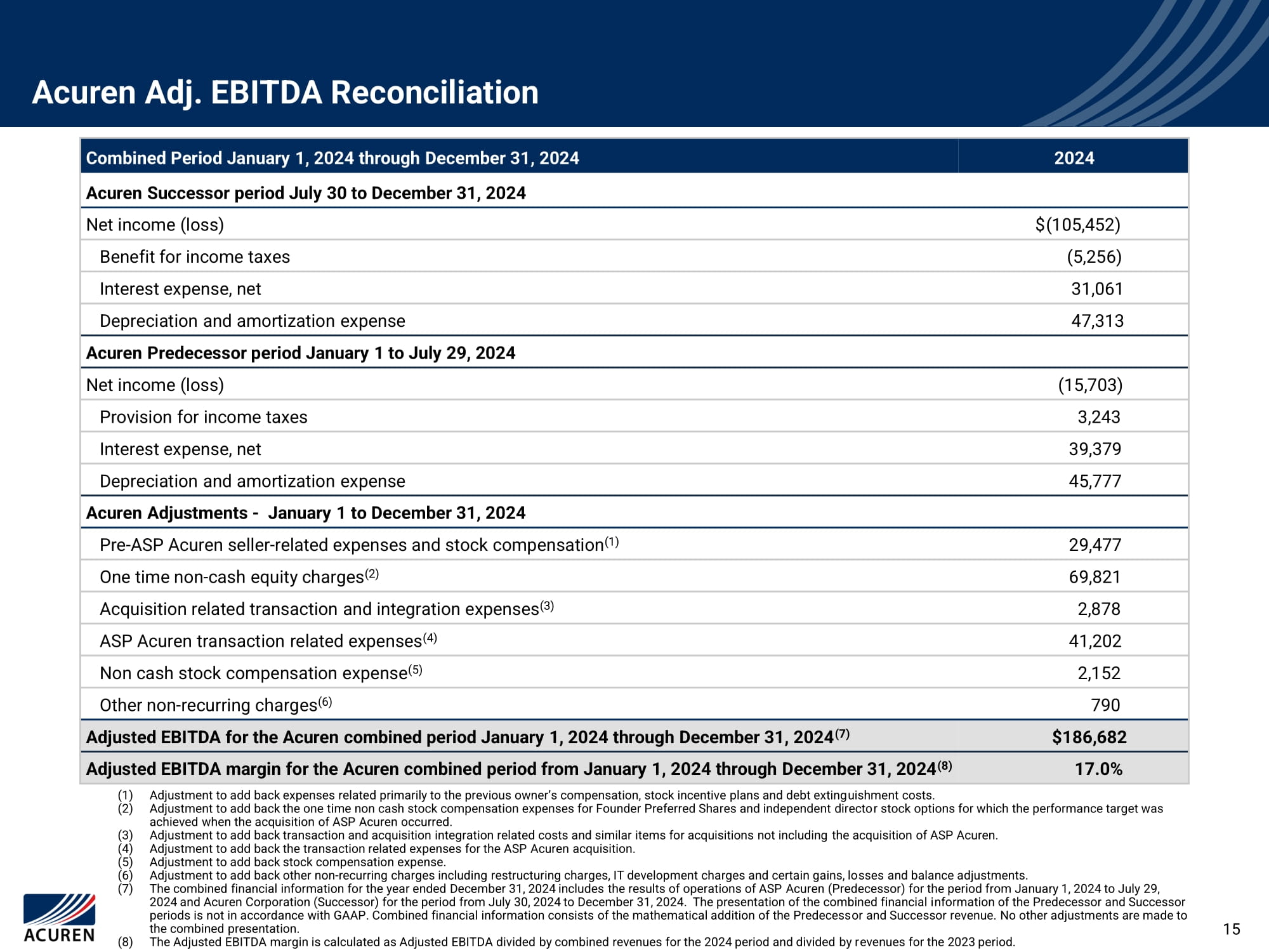 14 Revenue Reconciliation Year ended December 31, 2024 Combined Revenue $633,866 Acuren revenue from predecessor period $463,527 Acuren revenue from successor period $1,097,393 Total combined Acuren revenue (1) $941,265 NV5 Revenue $2,038,658 Total Acuren and NV5 combined revenue (2) (1) The Acuren combined financial information for the year ended December 31, 2024 includes the results of operations of ASP Acuren (Predecessor) for the period from January 1, 2024 to July 29, 2024 and Acuren Corporation (Successor) for the period from July 30, 2024 to December 31, 2024. The presentation of the combined financial information of the Predecessor and Successor periods is not in accordance with GAAP. Combined financial information consists of the mathematical addition of the Predecessor and Successor revenue. No other adjustments are made to the combined presentation. (2) The Acuren and NV5 combined financial information for the year ended December 31, 2024 includes the Acuren combined revenue and the NV5 reported revenue. The presentation of the combined financial information of Acuren and NV5 is not in accordance with GAAP. Combined financial information consists of the mathematical addition of the combined Acuren revenue and the NV5 revenue. No other adjustments are made to the combined presentation.
