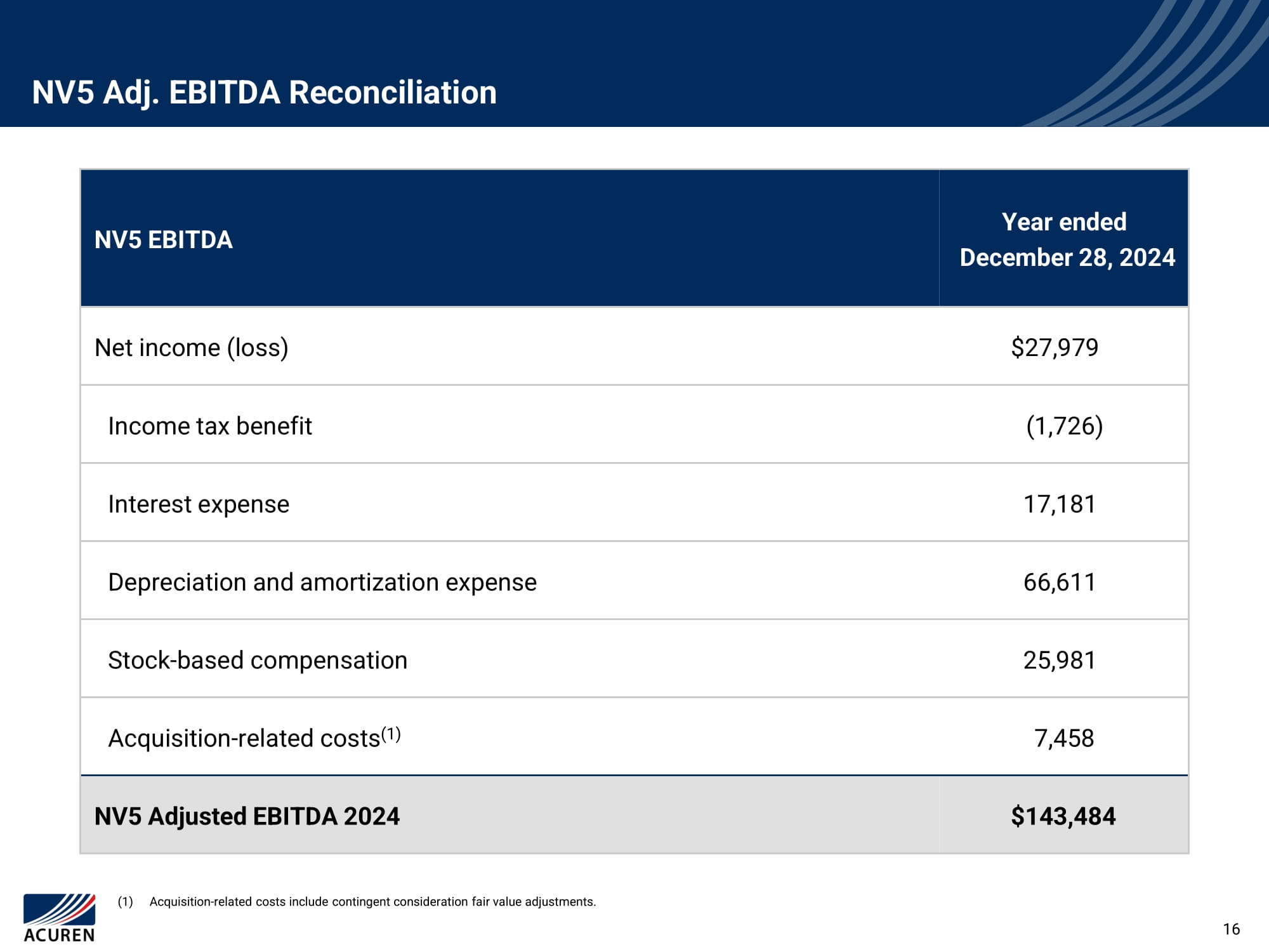 (2) The presentation of the combined financial information of Acuren and NV5 is not in accordance with GAAP. Combined financial information consists of the mathematical addition of the combined Acuren revenue and the NV5 revenue. No other adjustments are made to the combined presentation. Year ended December 31, 2024 Combined EBITDA 186,682 Acuren combined adjusted EBITDA 143,484 NV5 adjusted EBITDA (1) $330,166 Total Acuren and NV5 combined adjusted EBITDA 20,000 Estimated synergies $350,166 Total Acuren and NV5 combined adjusted EBITDA with synergies (2)