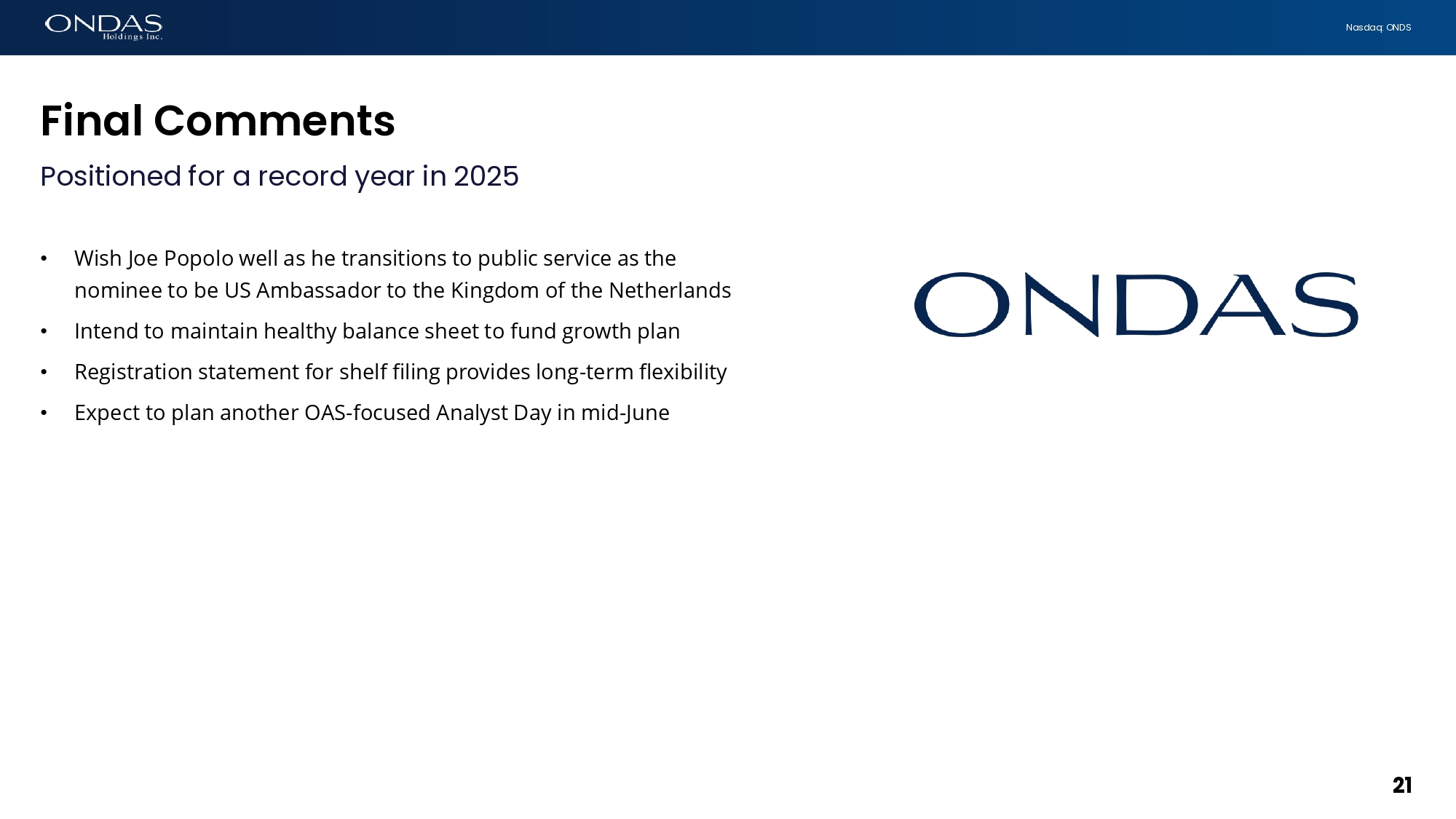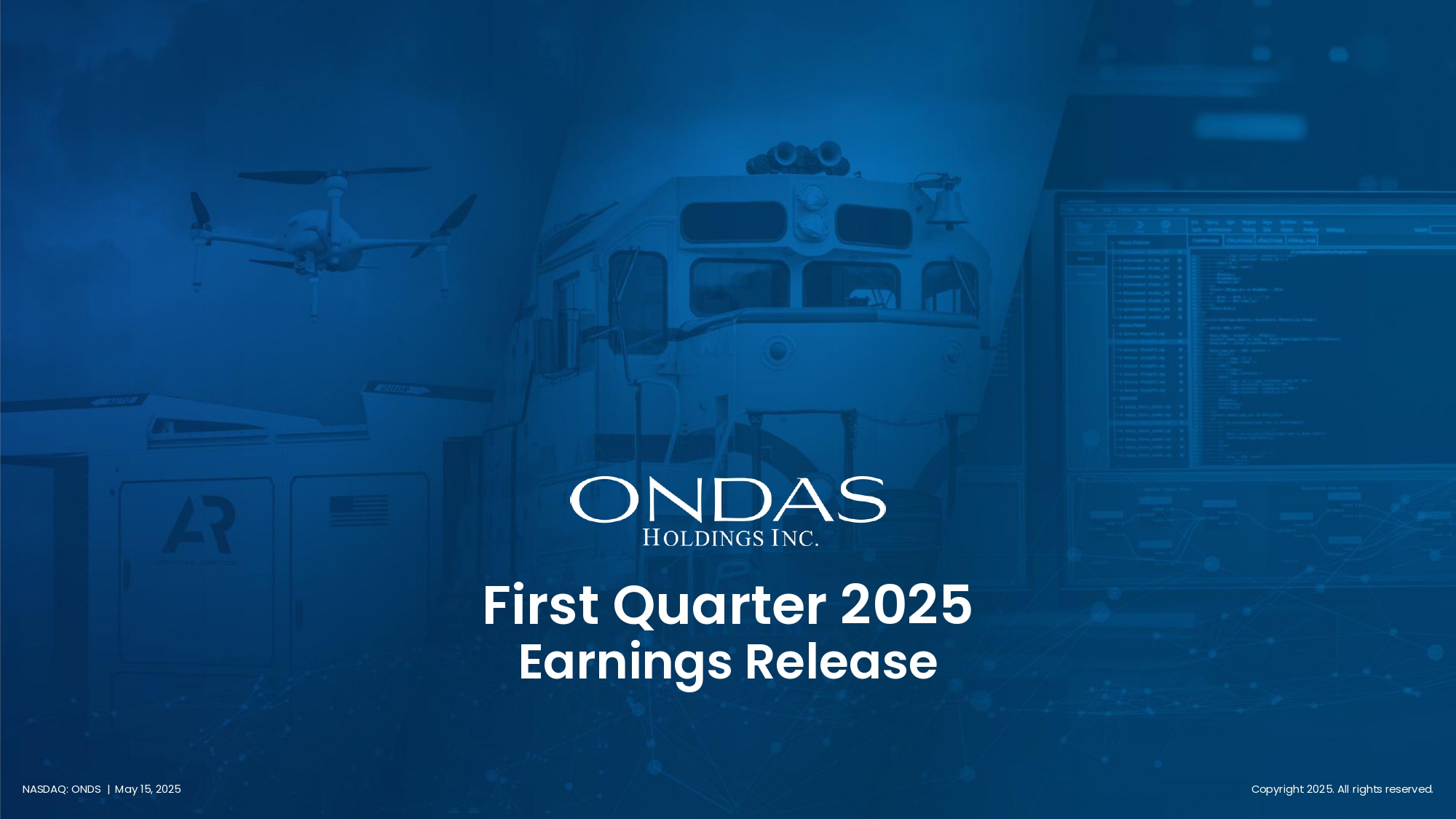 マサチューセッツ州ボストン - 2025年5月15日 - Ondas NetworksおよびOndas Autonomous Systems(OAS)事業部門を通じて、プライベート産業用ワイヤレスネットワーク、商用ドローンおよび自動データソリューションを提供するリーディングプロバイダーであるオンダスホールディングス(Nasdaq: ONDS)(以下「オンダス」または「当社」)は、2025年3月31日に終了した第1四半期の財務および営業成績を発表しました。また、ジョー・ポポロ氏が駐オランダ米国大使候補として公職に就くことに伴い、取締役を退任することを発表した。