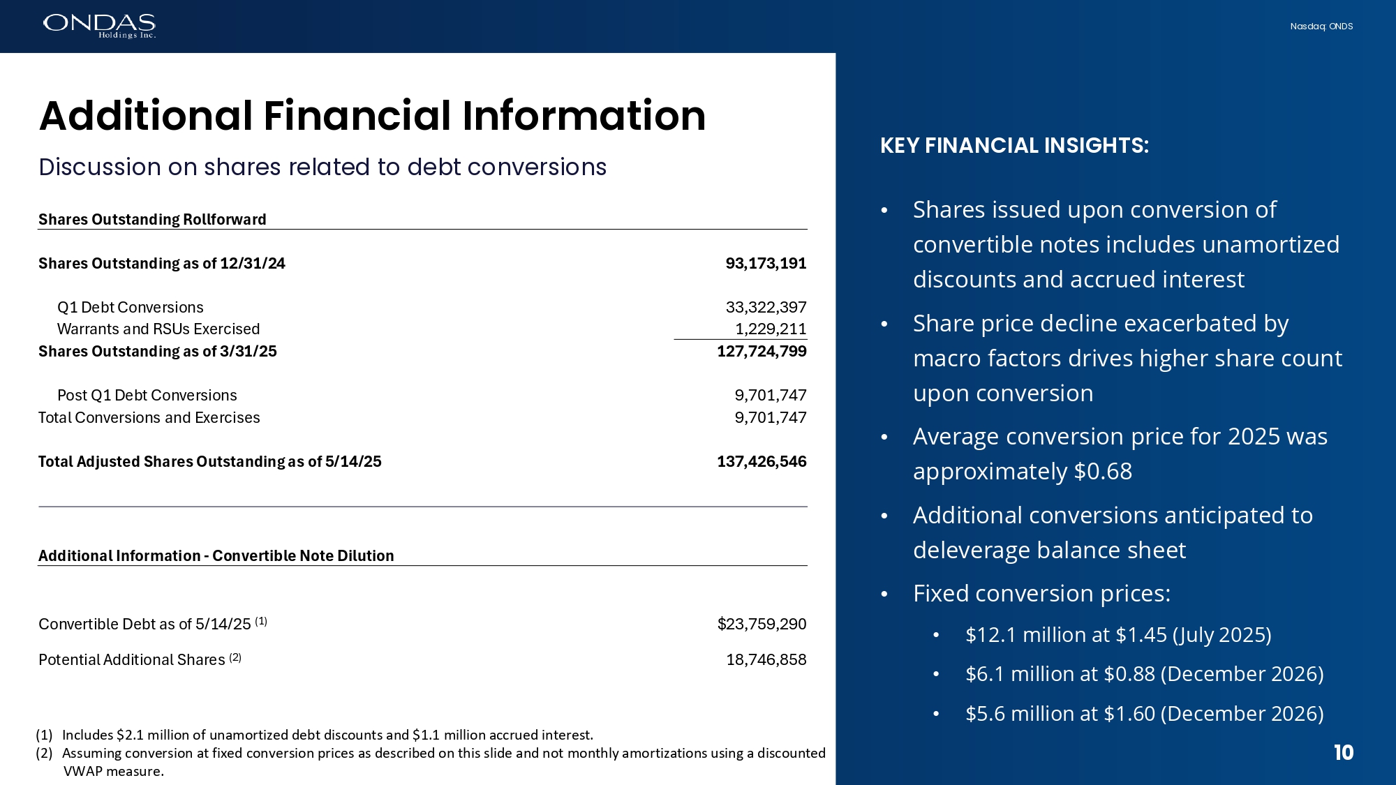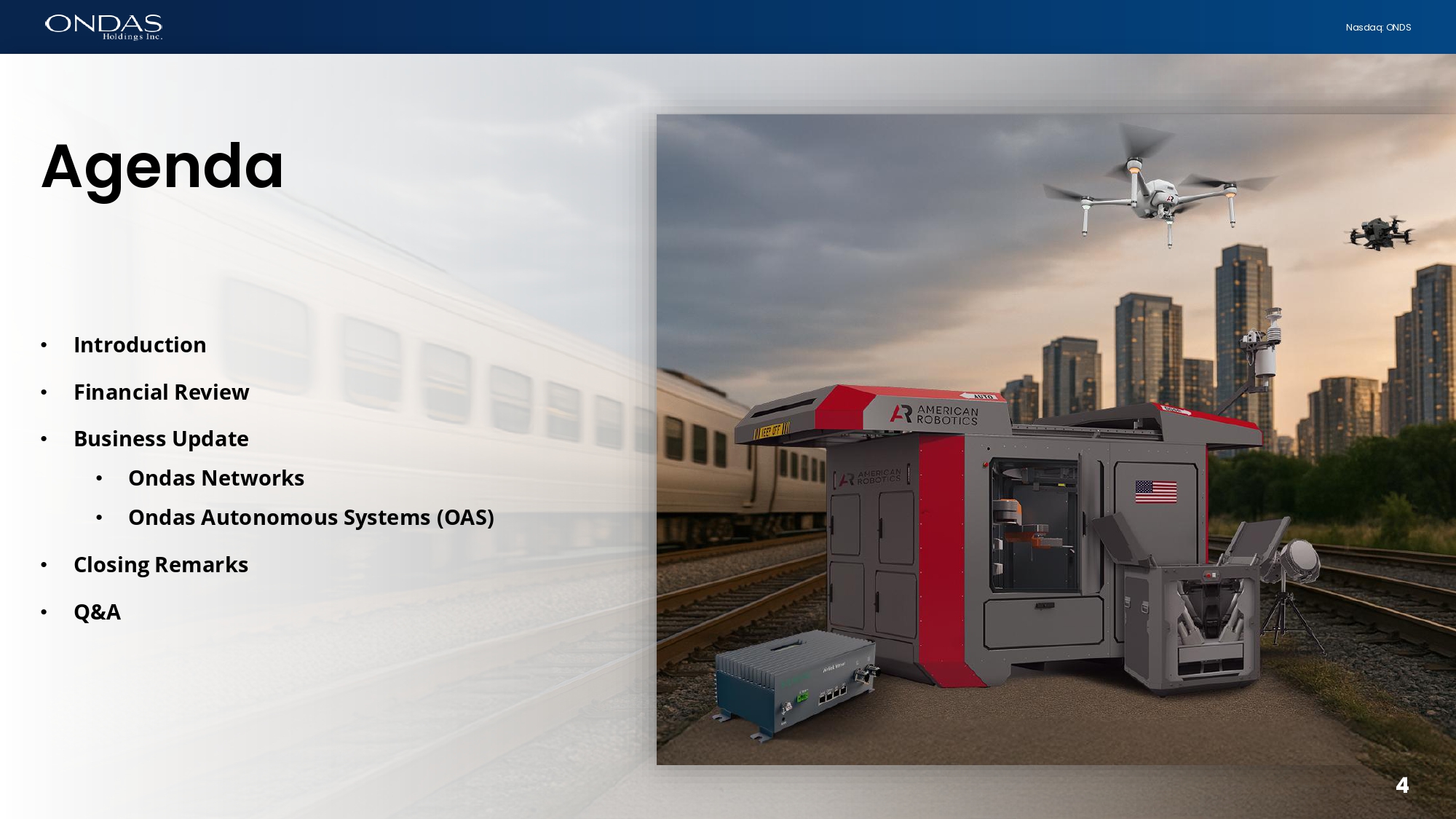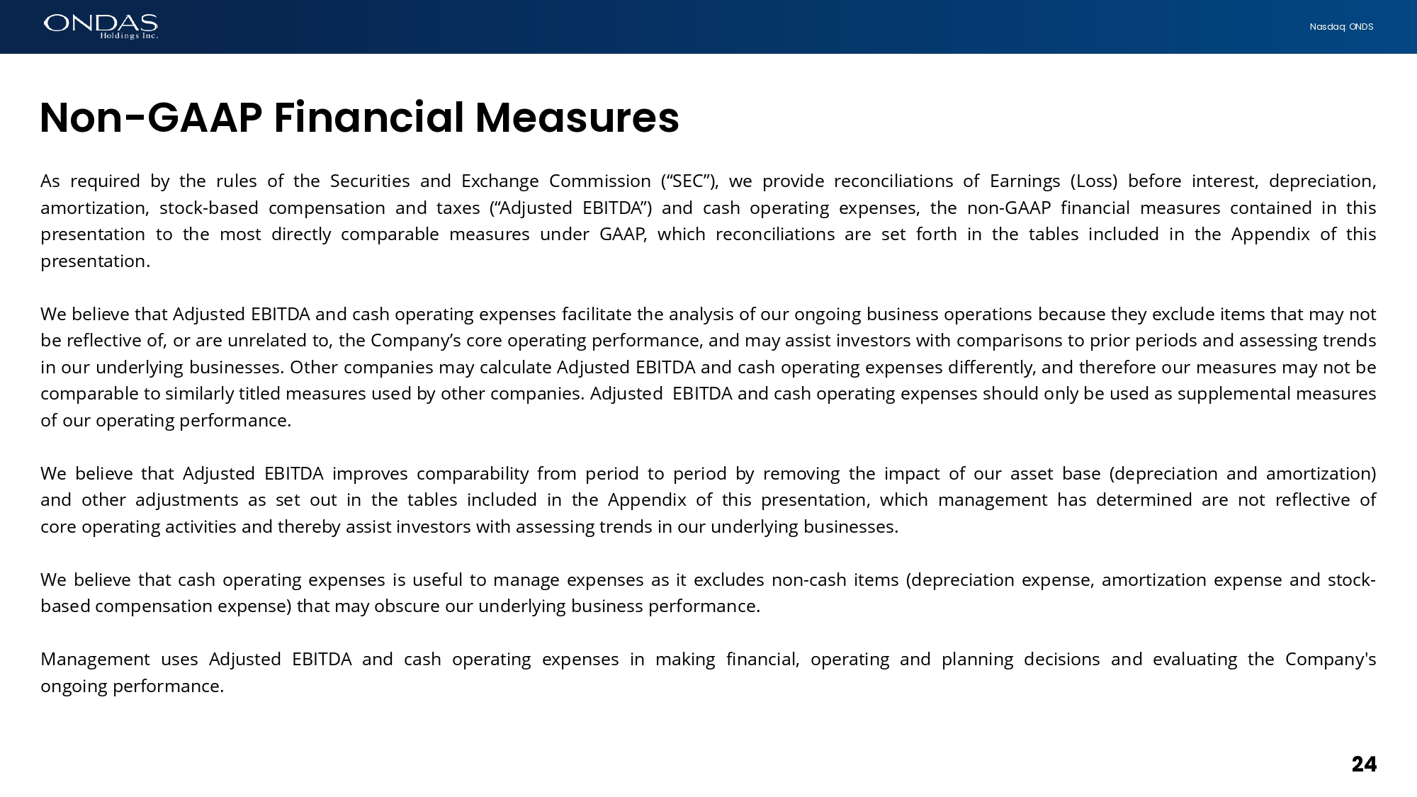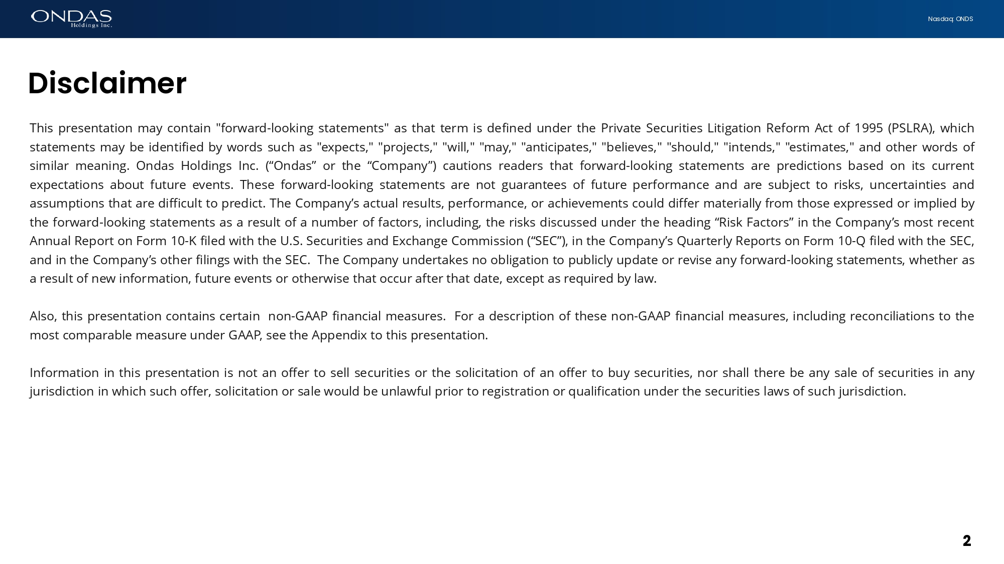 本日2025年5月15日東部時間午前8時30分(太平洋時間午前5時30分)より、決算電話会議を予定しています。カンファレンス・コールはライブ中継されるほか、こちらおよび当社ウェブサイトのIRセクション(ir.ondas.com)からも再生可能です。リプレイはイベント終了後、IRウェブサイトからアクセスできます。
