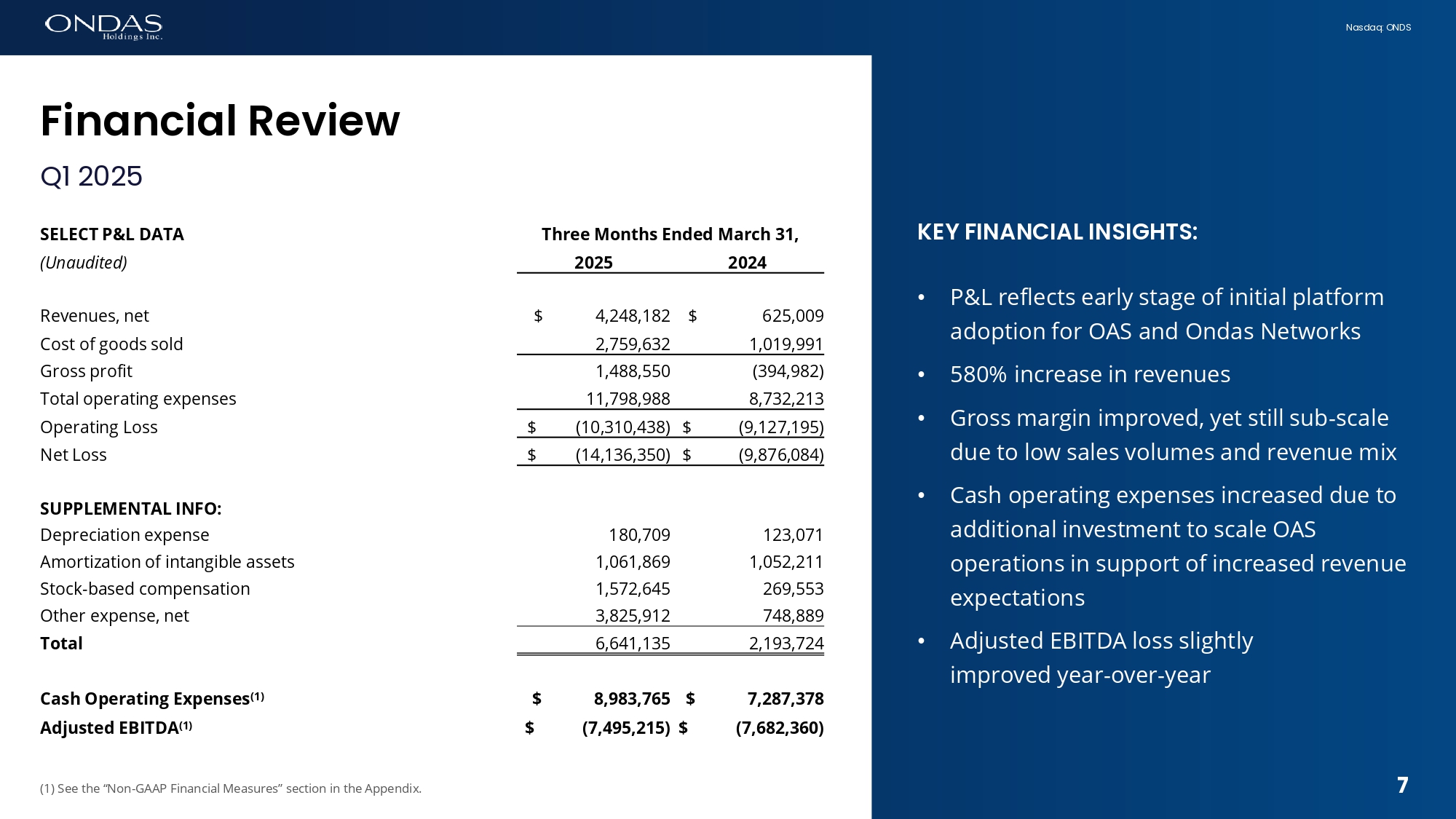 オンダスは2025年3月31日に終了した四半期に420万ドルの収益を計上し、2024年第1四半期の0.6百万ドルから大幅に増加した。この7倍の増収は、2024年および2025年初頭に軍事および公安の顧客と確保した契約に基づくIron DroneおよびOptimusシステムの初期納入によるものである。