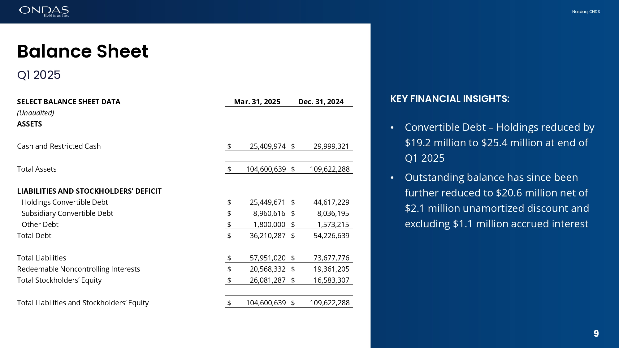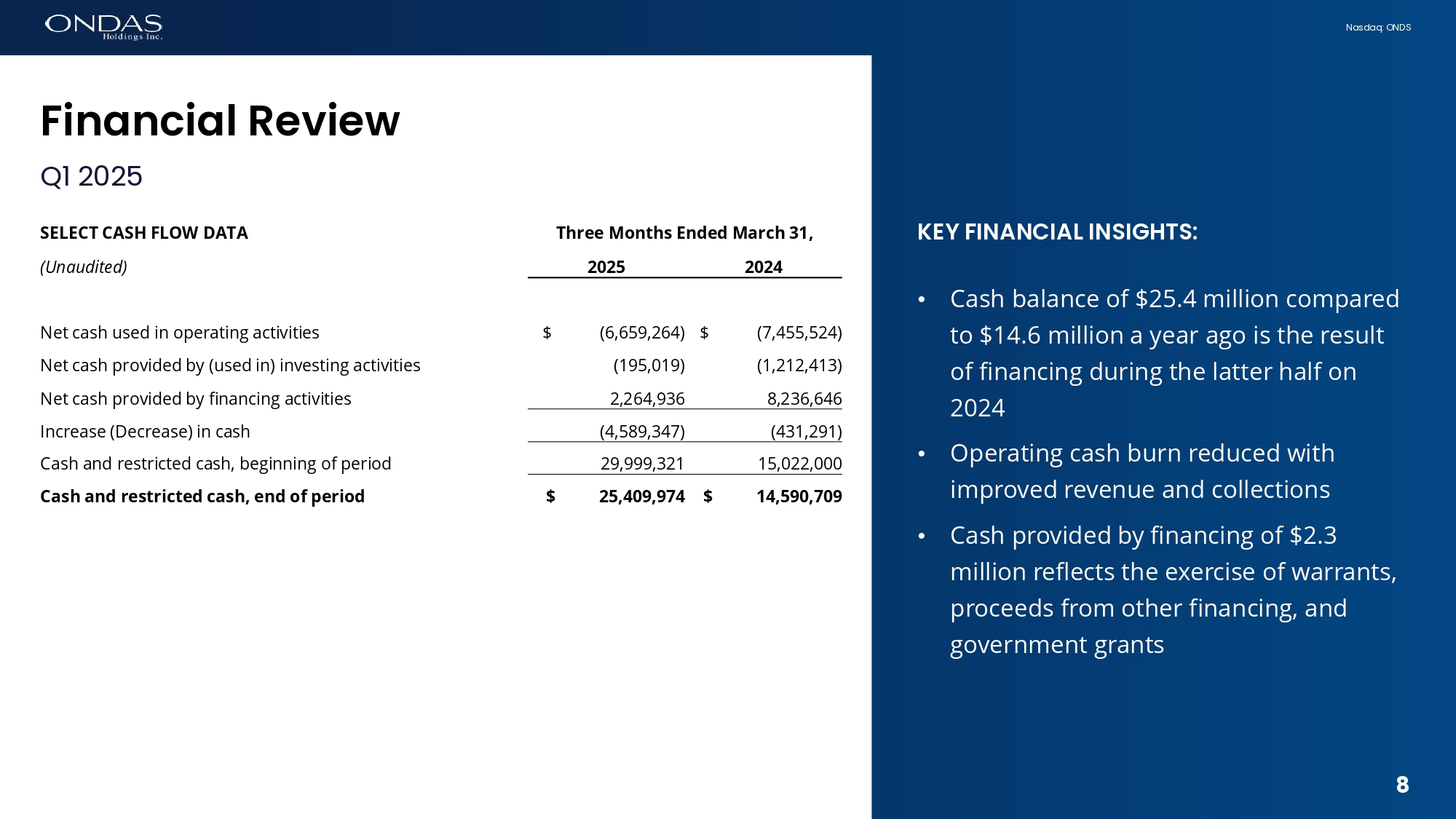 オンダスの現金は、2024年末の3,000万ドルに対し、2,540万ドルで当四半期を終えた。営業に使用した現金は670万ドルと、2024年第1四半期の750万ドルから減少し、ワラント行使、イスラエル政府からの助成金、その他の資金調達により合計230万ドルを調達した。
