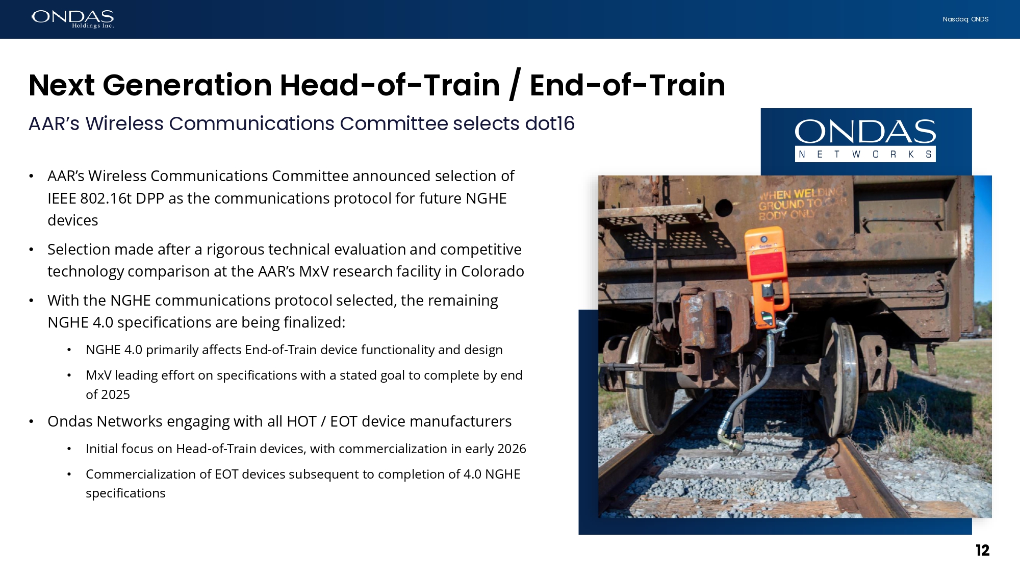 「オンダスネットワークスでは、次世代鉄道通信の主要技術プロバイダーとしての地位を強化し続けています。最近、NGHEシステムに当社のdot16ワイヤレスプロトコルが米国鉄道協会によって採用されたことは、大きなマイルストーンであり、長年にわたる集中的な開発の成果です。dot16は現在、900 MHz、220 MHz、450 MHzのネットワークに配置されており、当社は業界の長期的な近代化計画と戦略的に連携しています。現在の当社の優先課題は、この市場検証を商業的採用に転換し、北米全域の重要インフラ事業者にサービスを提供する、拡張可能で価値の高いビジネスを構築することです」。