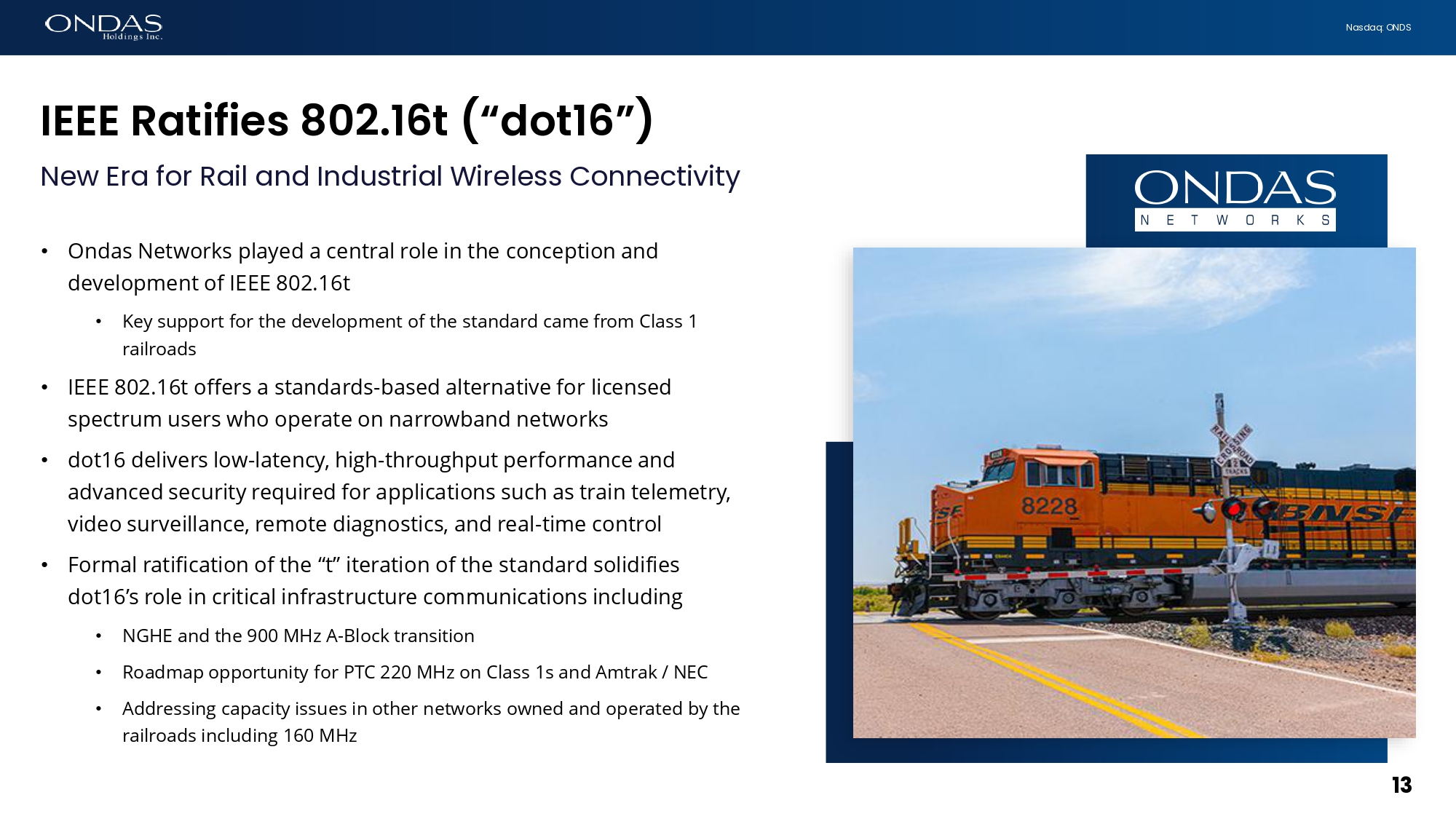 | ● | 4月、米国鉄道協会(AAR)のワイヤレス通信委員会は、次世代頭端式鉄道(NGHE)の新しい通信規格として、オンダスネットワークスのIEEE 802.16t(dot16)Direct-Peer-to-Peer(DPP) プロトコルを選択したことを発表しました。この決定は、すべての貨物鉄道事業者が信頼するNGHE安全クリティカルシステムの近代化における重要なマイルストーンとなる。 |