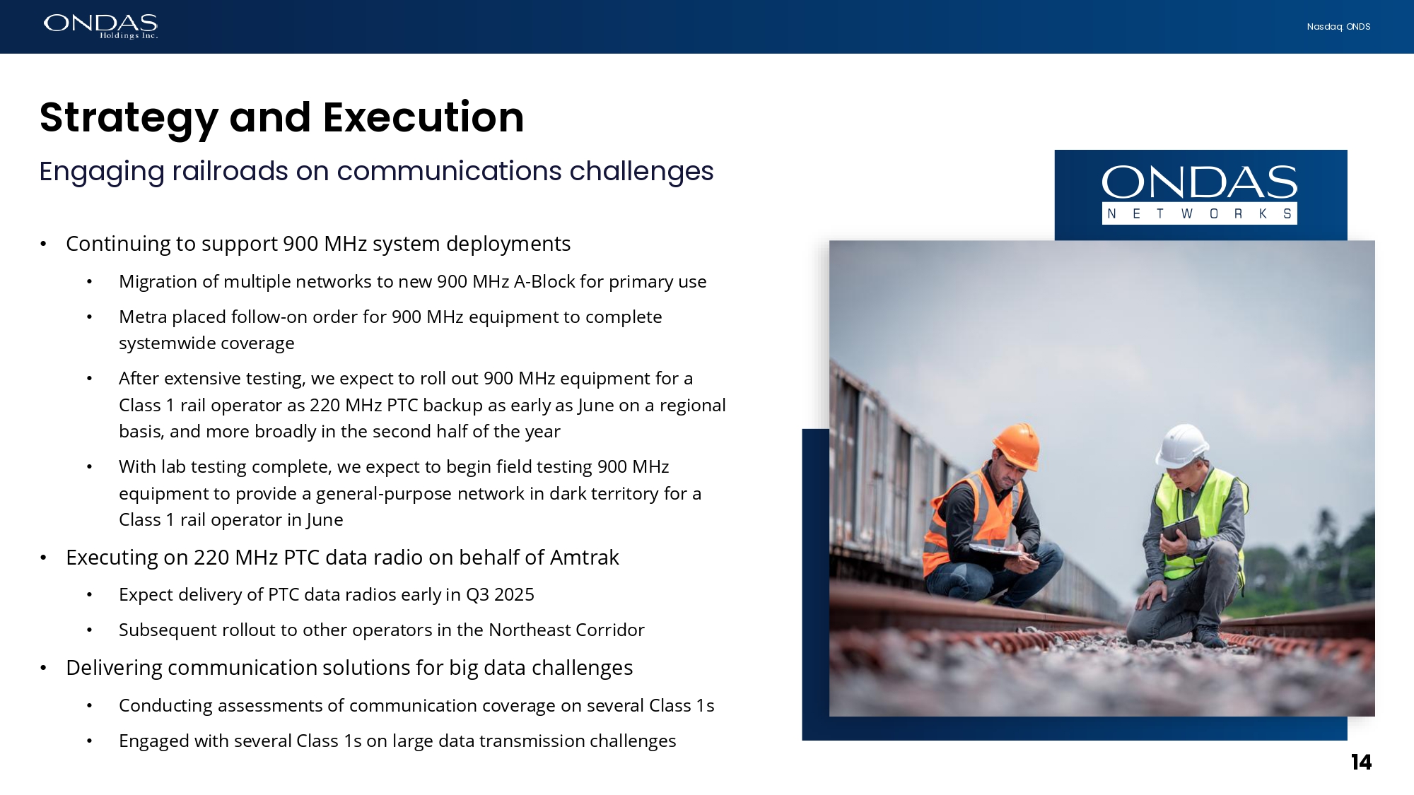 当社は力強い成長を見込んでおり、2025年の売上目標を少なくとも2,500万ドルとしている。これは記録的な年であり、2024年から前年比250%近い成長となる。成長を牽引するのはOAS事業部で、少なくとも2,000万ドルの売上を見込んでいる。この見通しは、2024年からの1000万ドルの受注残と、現在の顧客パイプラインの見通しを考慮し、今年中に確保し、達成する可能性の高い受注について保守的な見方をしていることに支えられています。オンダスネットワークスの現在の収益見通しは、主に既存の開発プログラムおよび期待される開発プログラムに関連するもので、鉄道ネットワークの構築スケジュールに関する確約が現在ないため、システム販売は控えめなものとなっている。