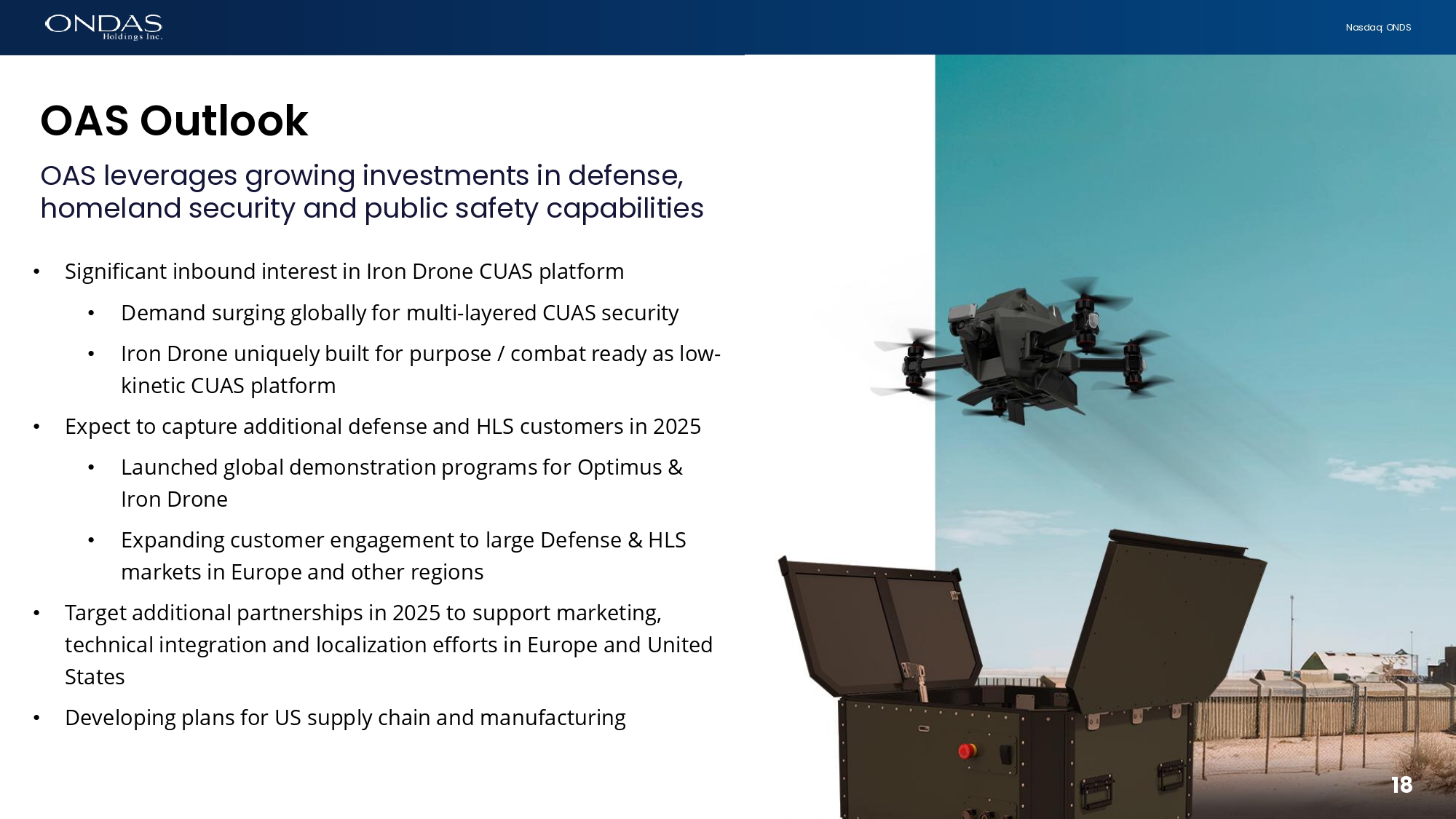 | ● | 2025年1月にオンダスの取締役に就任したアイロボティクスの前会長ロン・スターン氏は、防衛分野におけるOASの成長戦略をサポートするために積極的な役割を果たしている。 |