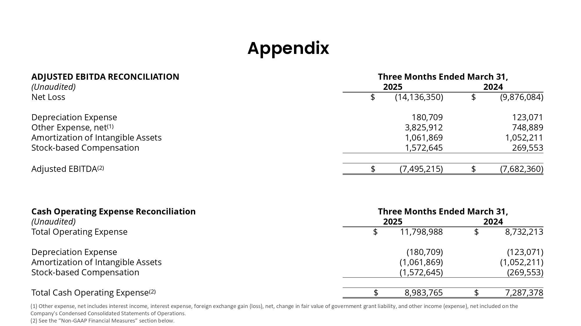 営業費用は前年同期の870万ドルから1,180万ドルに増加し、現金営業費用は730万ドルから900万ドルに増加した。現金営業費用の調整(非GAAP基準)は添付の財務表に記載されている。