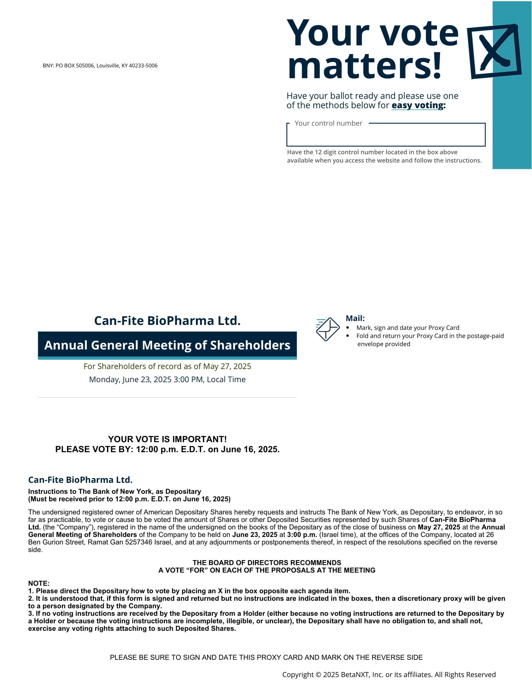 YOUR VOTE IS IMPORTANT! PLEASE VOTE BY: 12:00 p.m. E.D.T. on June 16, 2025. Can - Fite BioPharma Ltd. Instructions to The Bank of New York, as Depositary (Must be received prior to 12:00 p.m. E.D.T. on June 16, 2025) The undersigned registered owner of American Depositary Shares hereby requests and instructs The Bank of New York, as Depositary, to endeavor, in so far as practicable, to vote or cause to be voted the amount of Shares or other Deposited Securities represented by such Shares of Can - Fite BioPharma Ltd. (the “Company”), registered in the name of the undersigned on the books of the Depositary as of the close of business on May 27, 2025 at the Annual General Meeting of Shareholders of the Company to be held on June 23, 2025 at 3:00 p.m. (Israel time), at the offices of the Company, located at 26 Ben Gurion Street, Ramat Gan 5257346 Israel, and at any adjournments or postponements thereof, in respect of the resolutions specified on the reverse side. THE BOARD OF DIRECTORS RECOMMENDS A VOTE “FOR” ON EACH OF THE PROPOSALS AT THE MEETING NOTE: 1. Please direct the Depositary how to vote by placing an X in the box opposite each agenda item. 2. It is understood that, if this form is signed and returned but no instructions are indicated in the boxes, then a discretionary proxy will be given to a person designated by the Company. 3. If no voting instructions are received by the Depositary from a Holder (either because no voting instructions are returned to the Depositary by a Holder or because the voting instructions are incomplete, illegible, or unclear), the Depositary shall have no obligation to, and shall not, exercise any voting rights attaching to such Deposited Shares. PLEASE BE SURE TO SIGN AND DATE THIS PROXY CARD AND MARK ON THE REVERSE SIDE Copyright © 2025 BetaNXT, Inc. or its affiliates. All Rights Reserved Can - Fite BioPharma Ltd. Annual General Meeting of Shareholders For Shareholders of record as of May 27, 2025 Monday, June 23, 2025 3:00 PM, Local Time BNY: PO BOX 505006, Louisville, KY 40233 - 5006 Mail: • Mark, sign and date your Proxy Card • Fold and return your Proxy Card in the postage - paid envelope provided Your vote matters! Have your ballot ready and please use one of the methods below for easy voting : Your control number Have the 12 digit control number located in the box above available when you access the website and follow the instructions.