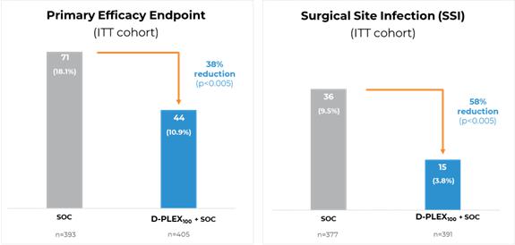 | ● | The primary efficacy endpoint of the study was successfully met, with a significantly lower proportion of primary endpoint events among patients who received D-PLEX100 plus SoC (n=405; 10.9%), compared to SoC alone (n=393; 18.1%), representing a 38% reduction (p<0.005). The primary endpoint is the combination of deep and superficial SSIs, all-cause mortality and surgical reinterventions at the same incision of the original index surgery. |