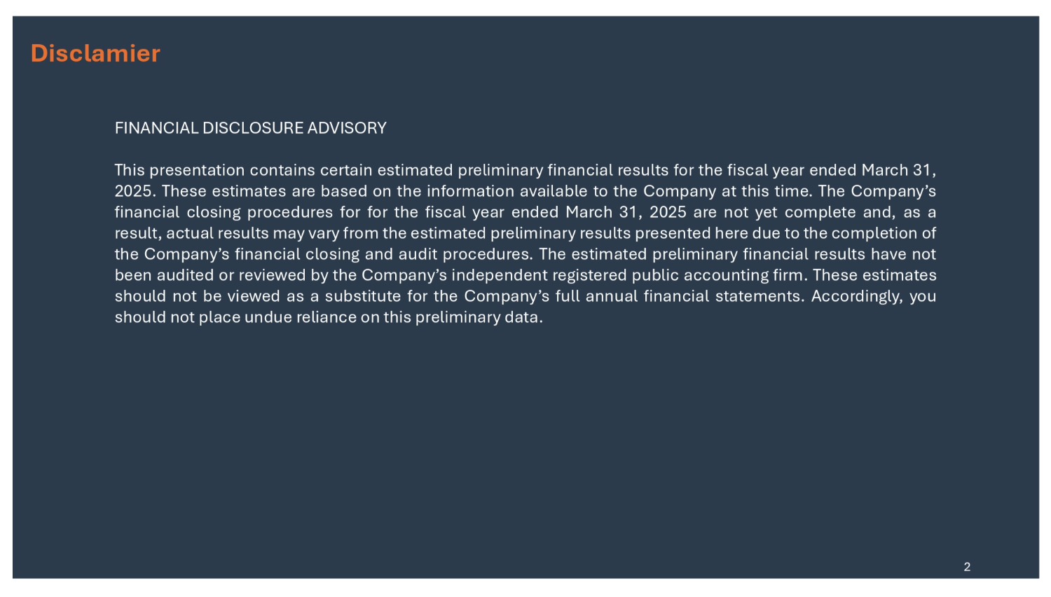 1 Forward - Looking Statements FINANCIAL DISCLOSURE ADVISORY This presentation contains certain estimated preliminary financial results for the fiscal year ended March 31 , 2025 . These estimates are based on the information available to the Company at this time . The Company’s financial closing procedures for for the fiscal year ended March 31 , 2025 are not yet complete and, as a result, actual results may vary from the estimated preliminary results presented here due to the completion of the Company’s financial closing and audit procedures . The estimated preliminary financial results have not been audited or reviewed by the Company’s independent registered public accounting firm . These estimates should not be viewed as a substitute for the Company’s full annual financial statements . Accordingly, you should not place undue reliance on this preliminary data .