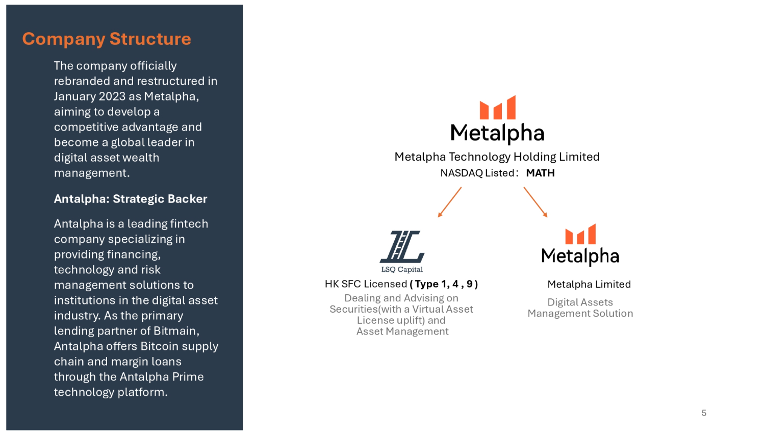 One of Asia's largest crypto assets management A Leading Digital Asset Wealth Management Company 4 Metalpha Technology Holding Limited NASDAQ Listed MATH HK SFC Licensed ( Type 1, 4 , G ) Dealing and Advising on Securities(with a Virtual Asset License uplift) and Asset Management Metalpha Limited Digital Assets Management Solution The company officially rebranded and restructured in January 2023 as Metalpha, aiming to develop a competitive advantage and become a global leader in digital asset wealth management. Antalpha: Strategic Backer Antalpha is a leading fintech company specializing in providing financing, technology and risk management solutions to institutions in the digital asset industry. As the primary lending partner of Bitmain, Antalpha offers Bitcoin supply chain and margin loans through the Antalpha Prime technology platform.
