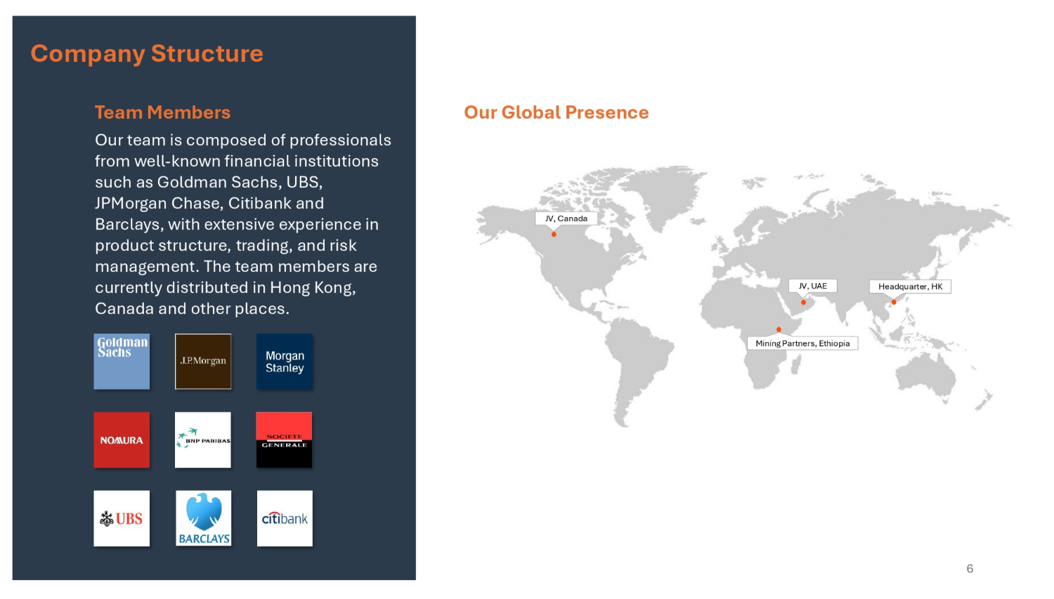 Company Structure Team Members Our team is composed of professionals from well - known financial institutions such as Goldman Sachs, UBS, JPMorgan Chase, Citibank and Barclays, with extensive experience in product structure, trading, and risk management. The team members are currently distributed in Hong Kong, Canada and other places. JV, Canada Headquarter, HK JV, UAE Mining Partners, Ethiopia Company Structure Our Global Presence Dual supervision by SEC and SFC The company is listed in the United States NASDAQ MATH Wholly - owned subsidiary LSQ Capital licenses are issued by HK SFC(No.