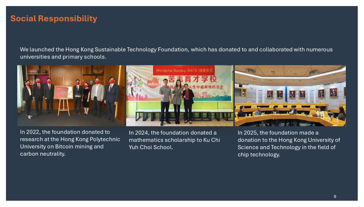 9 In 2022, the foundation donated to research at the Hong Kong Polytechnic University on Bitcoin mining and carbon neutrality. In 2024, the foundation donated a mathematics scholarship to Ku Chi Yuh Choi School. In 2025, the foundation made a donation to the Hong Kong University of Science and Technology in the field of chip technology.