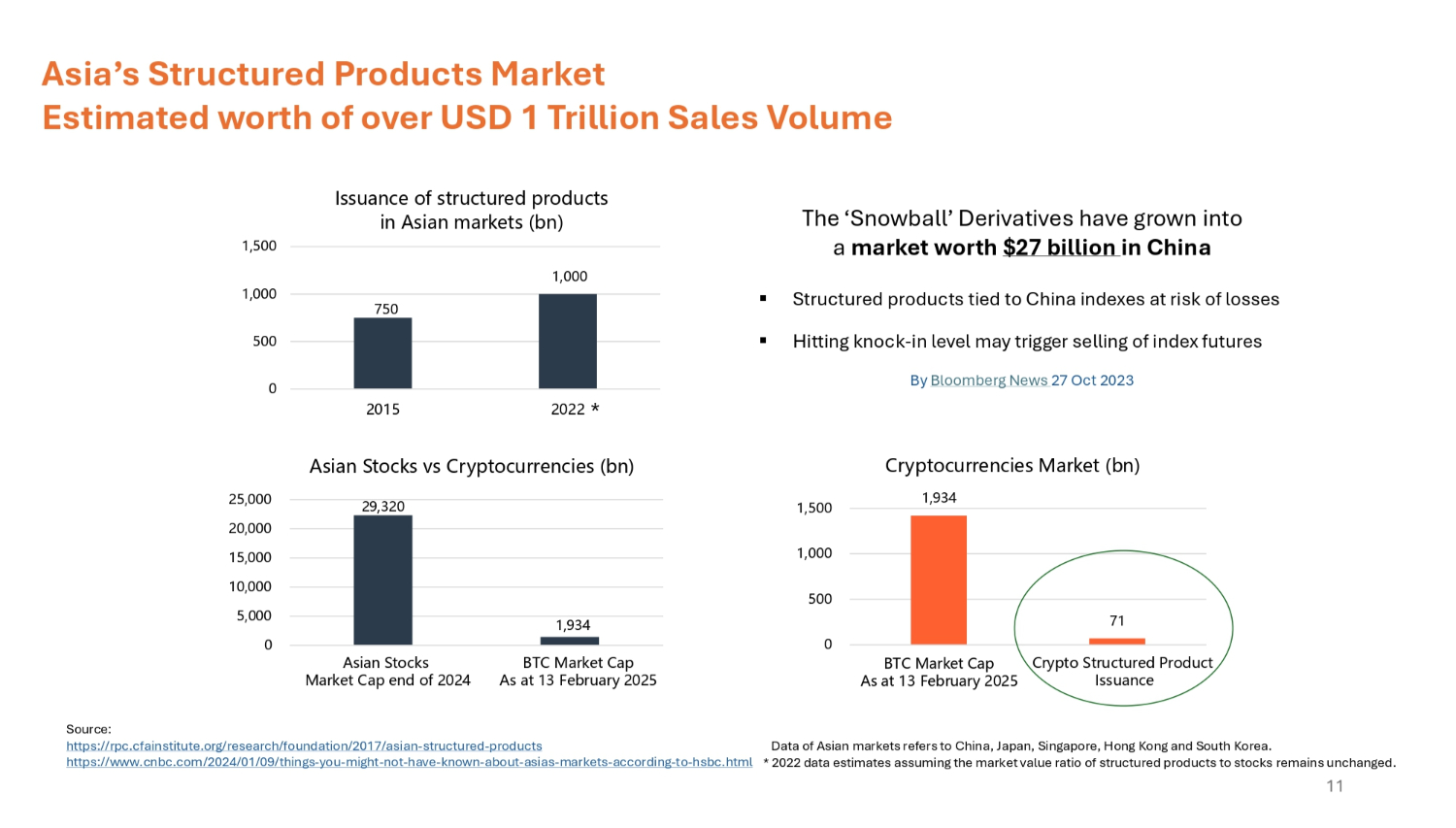 As of 2/12/2025 $2.2 Tn $73 Bn Gold Market US$ 19.46 tn Equity Market US$ 131.9 tn Bond Market USD 144.3 tn Crypto Market US$ 3.28 tn Derivatives Market $729.8 tn Potential Market Growth Daily Trading Volume of BTC C ETH 10 750 1,000 0 500 1,000 1,500 2015 2022 * Issuance of structured products in Asian markets (bn) 1,934 71 0 500 1,000 1,500 Ԇإૄ٠ۈ١қ ৈߣԗфսՇ੧ Cryptocurrencies Market (bn) BTC Market Cap As at 13 February 2025 Crypto Structured Product Issuance 1,934 Asian Stocks vs Cryptocurrencies (bn) 29,320 25,000 20,000 15,000 10,000 5,000 0 оࡳਁॕۈ١қ Ԇإૄ٠ۈ١қ Asian Stocks Market Cap end of 2024 BTC Market Cap As at 13 February 2025 The ‘Snowball’ Derivatives have grown into a market worth $27 billion in China ▪ Structured products tied to China indexes at risk of losses ▪ Hitting knock - in level may trigger selling of index futures By Bloomberg News 27 Oct 2023 Source: https://rpc.cfainstitute.org/research/foundation/2017/asian - structured - products Data of Asian markets refers to China, Japan, Singapore, Hong Kong and South Korea. https://www.cnbc.com/2024/01/09/things - you - might - not - have - known - about - asias - markets - according - to - hsbc.html * 2022 data estimates assuming the market value ratio of structured products to stocks remains unchanged.
