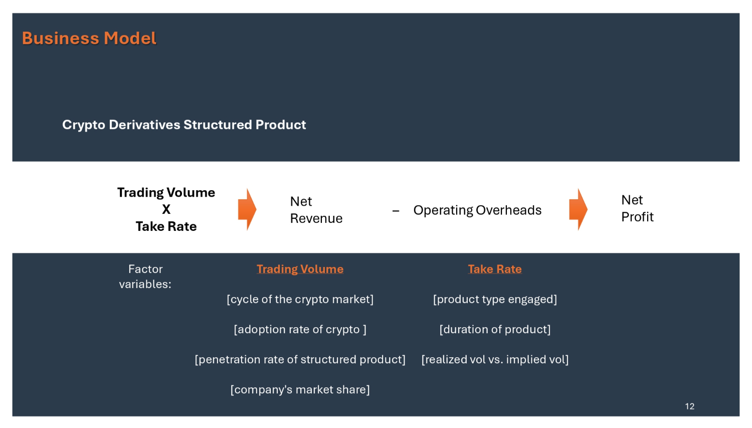 Asia’s Structured Products Market Estimated worth of over USD 1 Trillion Sales Volume 11 Crypto Derivatives Structured Product Trading Volume X Take Rate Net Revenue 12 – Operating Overheads Net Profit Factor variables: Take Rate [product type engaged] [duration of product] [realized vol vs.