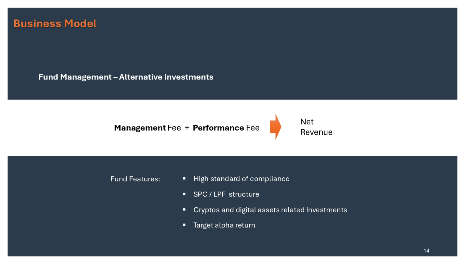 implied vol] Trading Volume [cycle of the crypto market] [adoption rate of crypto ] [penetration rate of structured product] [company's market share] Business Model Peak Trough Recovery Sell at premium Sell Call Decumulator Short and hedge Long put Collar - loan Yield generation from volatility Reverse snowball Buy at discount Sell put Accumulator Down - in - call Yield generation from volatility Snowball Accumulating with some protection Airbag Into Bull Market Hold for appreciation Dual - coin ETH/BTC Decumulating and profit lock - in Collar - loan Buy at discount Accumulator Accumulating with some protection Airbag Into Bear Market Accumulating with some protection Airbag Accumulator 13 Yield generation from volatility Snowball Buy with efficiency Double 80 Yield generation from volatility Snowball Short and hedge Long put Collar - loan Buy at discount Accumulator The Metalpha Wave – Using Different Products Across The Cycle Fund Management – Alternative Investments Net Revenue 14 ▪ High standard of compliance ▪ SPC / LPF structure ▪ Cryptos and digital assets related Investments ▪ Target alpha return Management Fee + Performance Fee Fund Features: Business Model