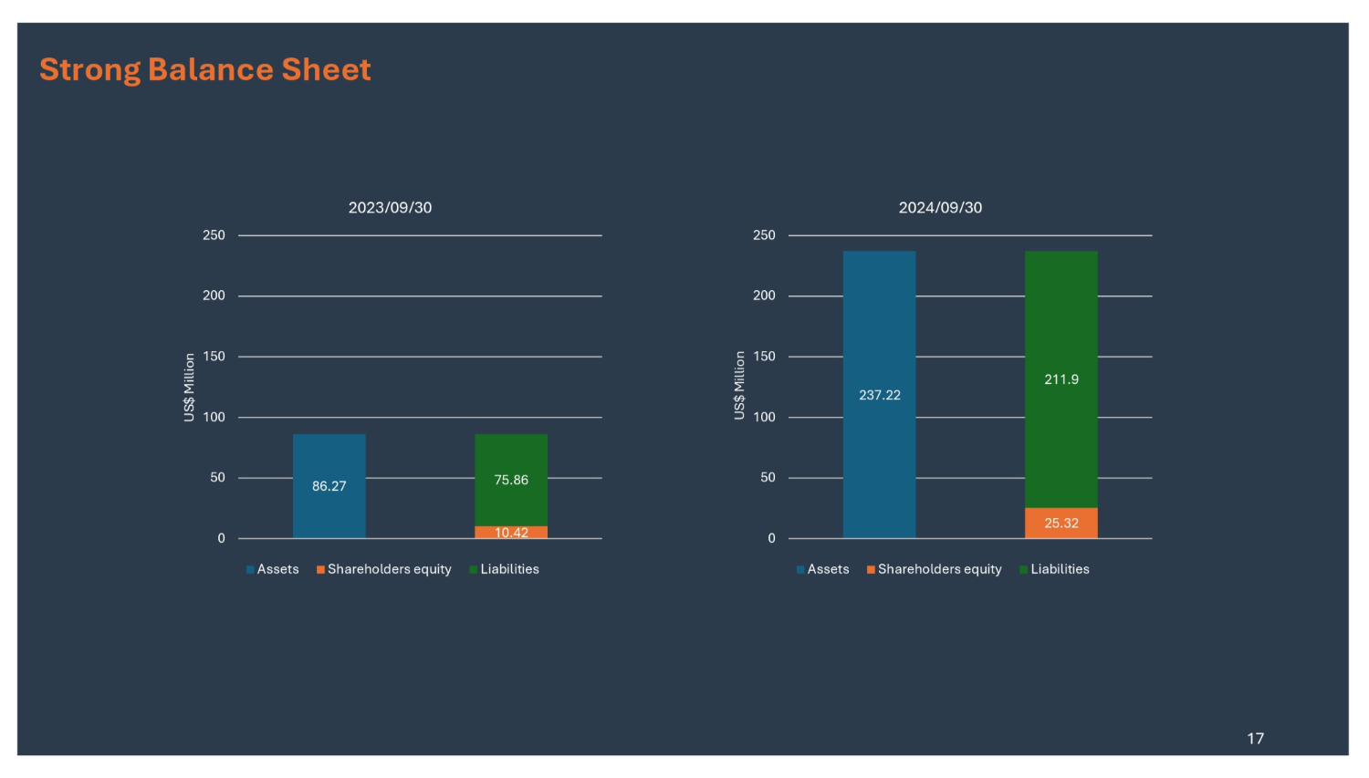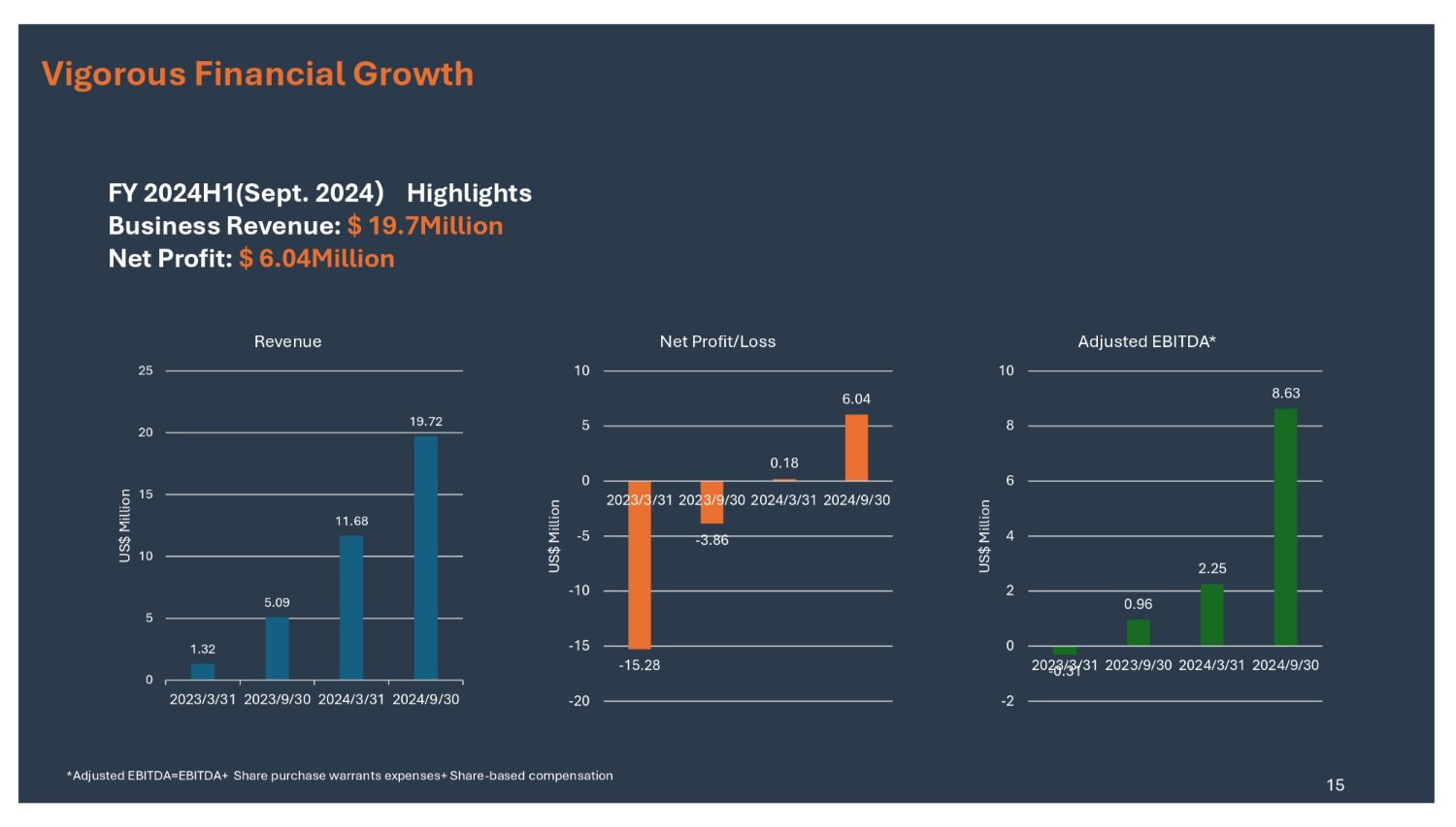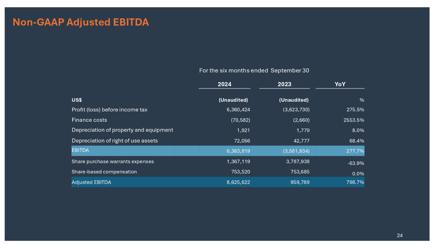For the six months ended September 30 YoY 2023 2024 % (Unaudited) (Unaudited) US$ 275.5% (3,623,730) 6,360,424 Profit (loss) before income tax 2553.5% (2,660) (70,582) Finance costs 8.0% 1,779 1,921 Depreciation of property and equipment 68.4% 42,777 72,056 Depreciation of right of use assets 277.7% (3,581,834) 6,363,819 EBITDA - 63.9% 3,787,938 1,367,119 Share purchase warrants expenses 0.0% 753,685 753,520 Share - based compensation 798.7% 959,789 8,625,622 Adjusted EBITDA 24 Non - GAAP Adjusted EBITDA