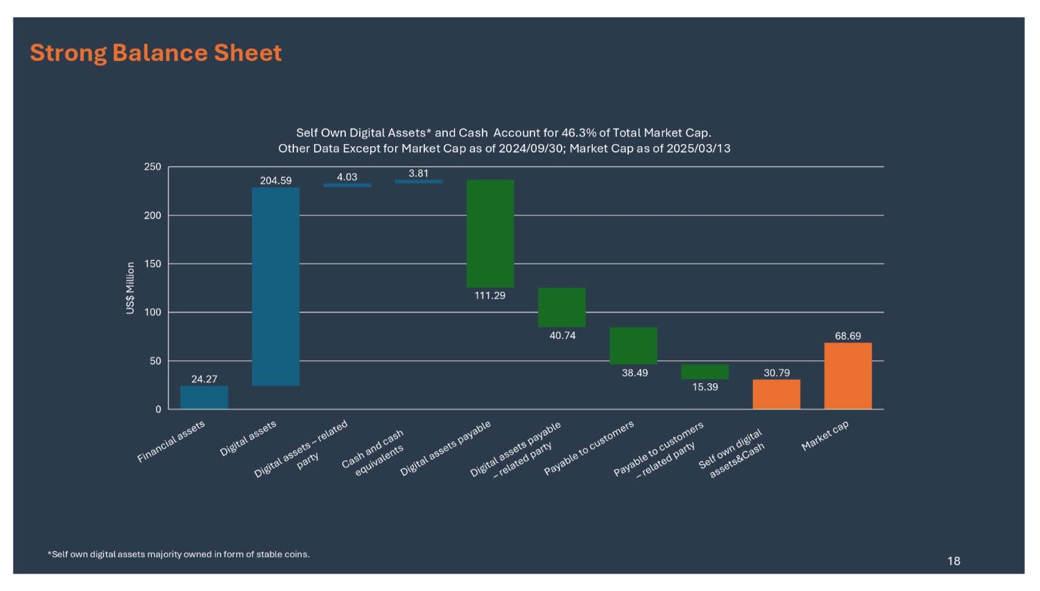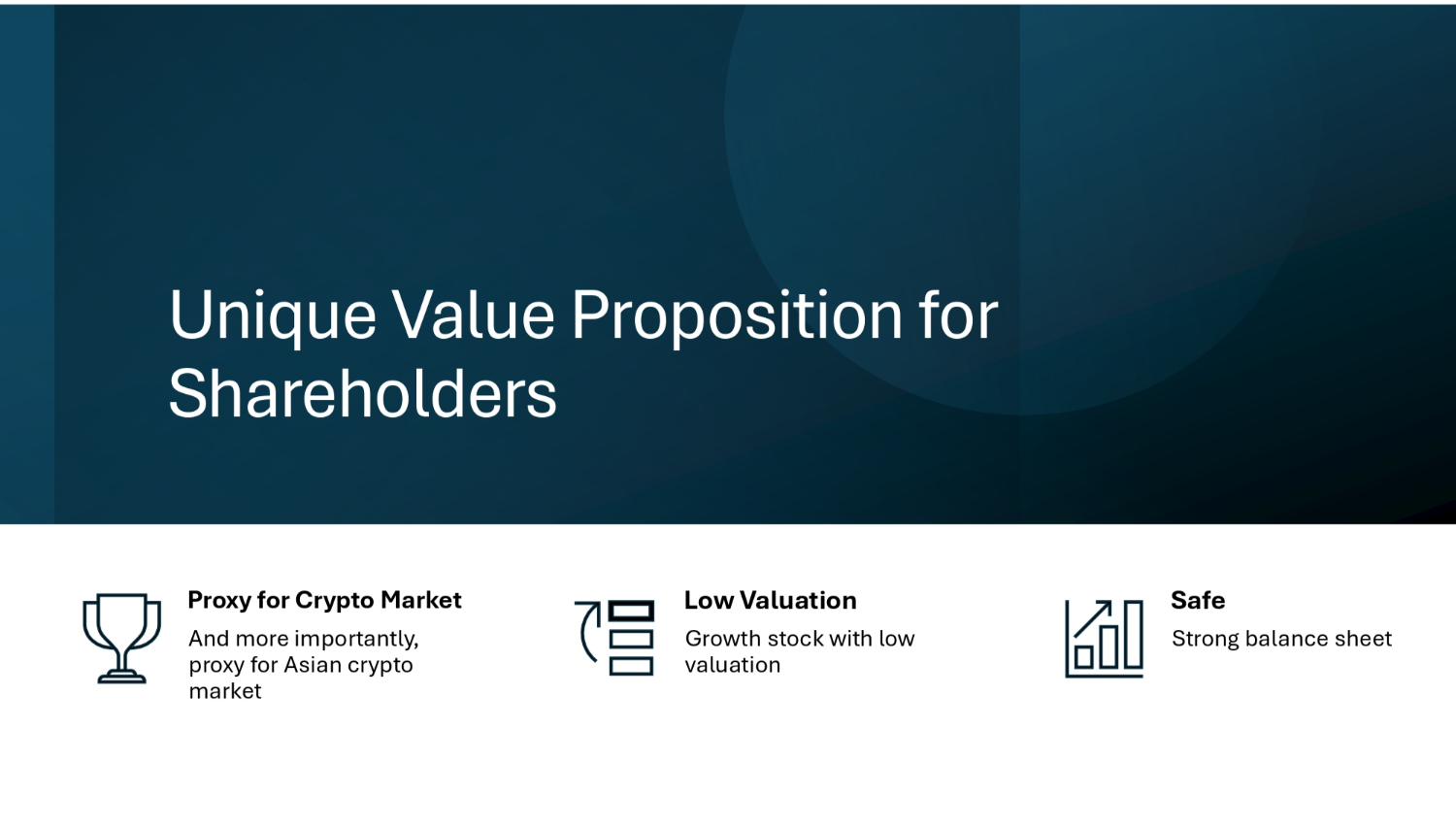 - 15.28 0.18 6.04 - 20 - 15 - 10 - 5 0 5 10 /31 2023/9/30 2024/3/31 2024/9/30 3/3 202 - 3.86 US$ Million Net Profit/Loss 0.96 2.25 8.63 - 2 0 2 4 6 8 10 2 0 2 - 0 3 . / 3 3 1 /31 2023/9/30 2024/3/31 2024/9/30 US$ Million Adjusted EBITDA* FY 2024H1(Sept. 2024 ͤ Highlights Business Revenue: $ 1G.7Million Net Profit: $ 6.04Million Vigorous Financial Growth *Adjusted EBITDA=EBITDA+ Share purchase warrants expenses+ Share - based compensation 1.32 5.09 11.68 19.72 0 5 10 15 20 25 2023/3/31 2023/9/30 2024/3/31 2024/9/30 US$ Million Revenue 15 Unique Value Proposition for Shareholders Proxy for Crypto Market And more importantly, proxy for Asian crypto market Low Valuation Growth stock with low valuation Safe Strong balance sheet