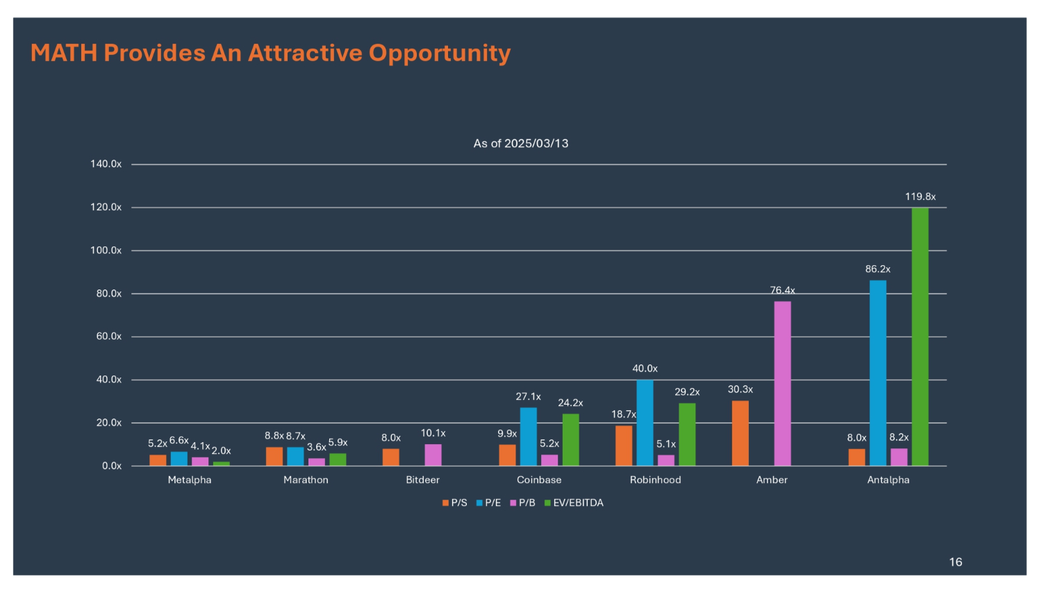 8.0x 9.9x 18.7x 30.3x 8.0x 8.8x 8.7x 27.1x 40.0x 86.2x 5.2x 6.6x 4.1x 3.6x 10.1x 5.2x 5.1x 76.4x 8.2x 2.0x 5.9x 24.2x 29.2x 119.8x 0.0x 20.0x 40.0x 60.0x 80.0x 120.0x 100.0x 140.0x Metalpha Marathon Bitdeer Robinhood Amber Antalpha As of 2025/03/13 Coinbase P/S P/E P/B EV/EBITDA 16 MATH Provides An Attractive Opportunity 86.27 10.42 75.86 0 50 100 150 200 250 US$ Million 2023/09/30 Assets Shareholders equity Liabilities 237.22 25.32 211.9 0 50 100 150 200 250 US$ Million 2024/09/30 Assets Shareholders equity Liabilities 17 Strong Balance Sheet