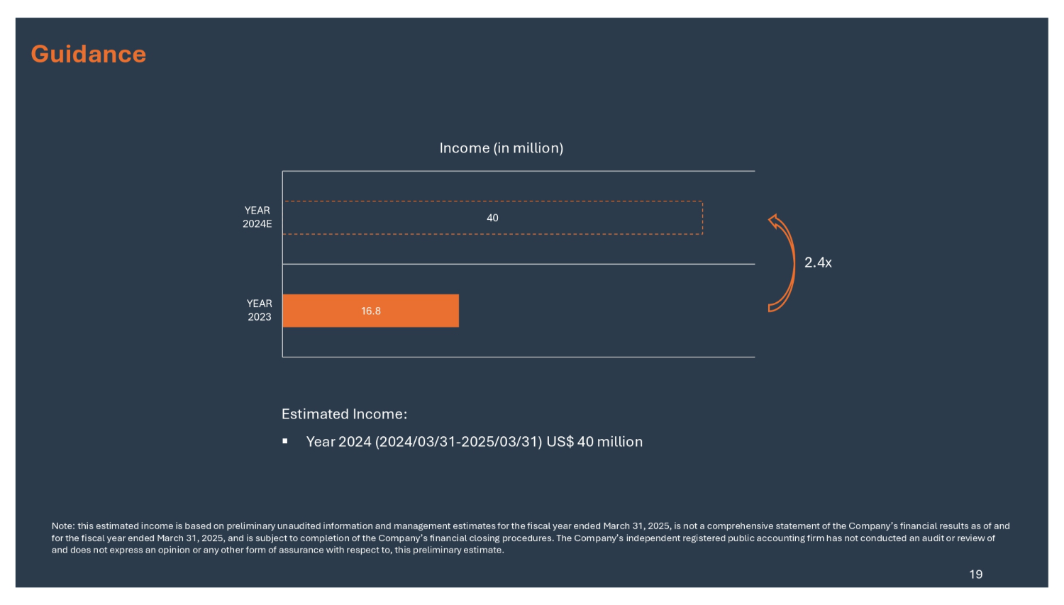 Other Data Except for Market Cap as of 2024/09/30; Market Cap as of 2025/03/13 40.74 38.49 15.39 Estimated Income: ▪ Year 2024 (2024/03/31 - 2025/03/31) US$ 40 million 40 16.8 YEAR 2023 YEAR 2024E Income (in million) Guidance 2.4x 19 Note: this estimated income is based on preliminary unaudited information and management estimates for the fiscal year ended March 31, 2025, is not a comprehensive statement of the Company’s financial results as of and for the fiscal year ended March 31, 2025, and is subject to completion of the Company’s financial closing procedures. The Company’s independent registered public accounting firm has not conducted an audit or review of and does not express an opinion or any other form of assurance with respect to, this preliminary estimate.