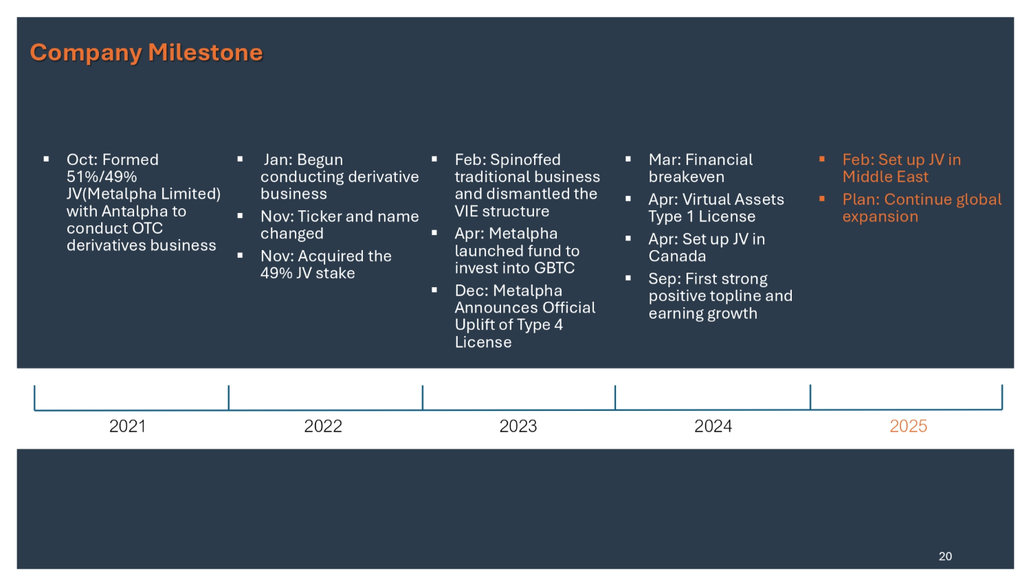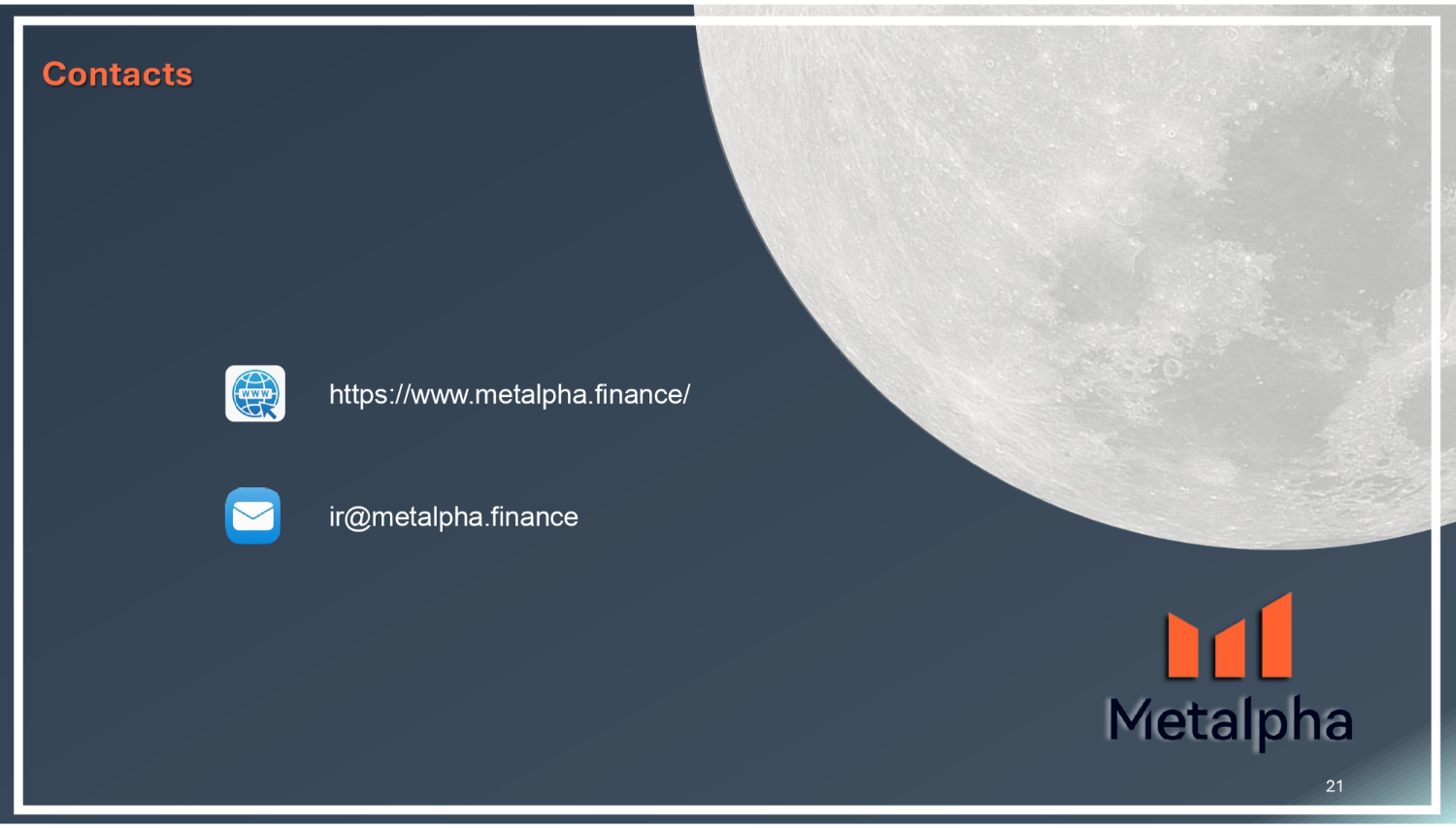 ▪ Oct: Formed 51%/49% JV(Metalpha Limited) with Antalpha to conduct OTC derivatives business 2021 2022 2023 2024 ▪ Jan: Begun conducting derivative business ▪ Nov: Ticker and name changed ▪ Nov: Acquired the 49% JV stake ▪ Mar: Financial breakeven ▪ Apr: Virtual Assets Type 1 License ▪ Apr: Set up JV in Canada ▪ Sep: First strong positive topline and earning growth ▪ Feb: Set up JV in Middle East ▪ Plan: Continue global expansion 2025 20 ▪ Feb: Spinoffed traditional business and dismantled the VIE structure ▪ Apr: Metalpha launched fund to invest into GBTC ▪ Dec: Metalpha Announces Official Uplift of Type 4 License Company Milestone ir@metalpha.finance https:// www.metalpha.finance/ 21 Contacts