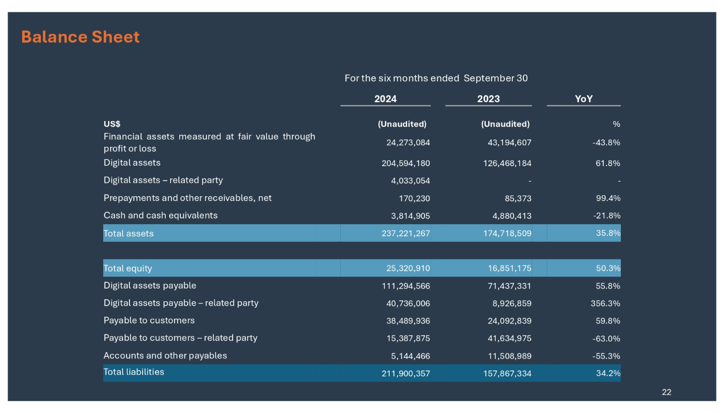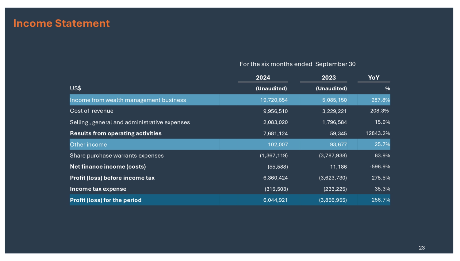 For the six months ended September 30 YoY 2023 2024 % (Unaudited) (Unaudited) US$ - 43.8% 43,194,607 24,273,084 Financial assets measured at fair value through profit or loss 61.8% 126,468,184 204,594,180 Digital assets - - 4,033,054 Digital assets – related party 99.4% 85,373 170,230 Prepayments and other receivables, net - 21.8% 4,880,413 3,814,905 Cash and cash equivalents 35.8% 174,718,509 237,221,267 Total assets 50.3% 16,851,175 25,320,910 Total equity 55.8% 71,437,331 111,294,566 Digital assets payable 356.3% 8,926,859 40,736,006 Digital assets payable – related party 59.8% 24,092,839 38,489,936 Payable to customers - 63.0% 41,634,975 15,387,875 Payable to customers – related party - 55.3% 11,508,989 5,144,466 Accounts and other payables 34.2% 157,867,334 211,900,357 Total liabilities 22 Balance Sheet For the six months ended September 30 YoY 2023 2024 % (Unaudited) (Unaudited) US$ 287.8% 5,085,150 19,720,654 Income from wealth management business 208.3% 3,229,221 9,956,510 Cost of revenue 15.9% 1,796,584 2,083,020 Selling , general and administrative expenses 12843.2% 59,345 7,681,124 Results from operating activities 25.7% 93,677 102,007 Other income 63.9% (3,787,938) (1,367,119) Share purchase warrants expenses - 596.9% 11,186 (55,588) Net finance income (costs) 275.5% (3,623,730) 6,360,424 Profit (loss) before income tax 35.3% (233,225) (315,503) Income tax expense 256.7% (3,856,955) 6,044,921 Profit (loss) for the period 23 Income Statement