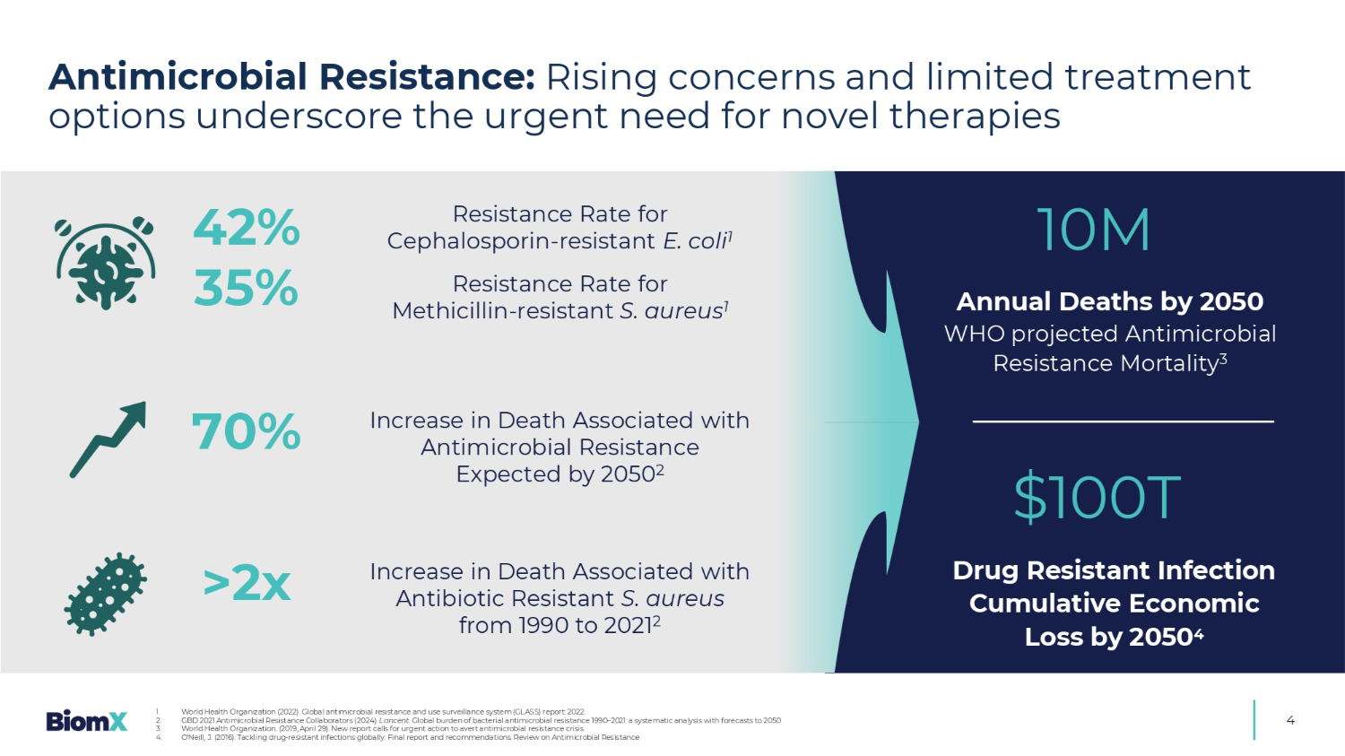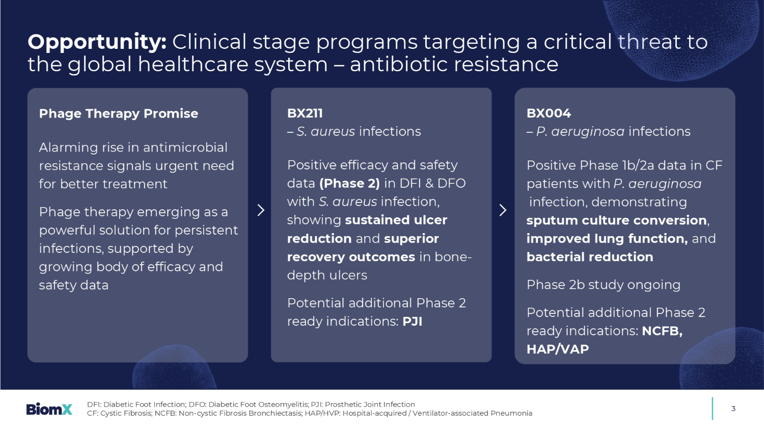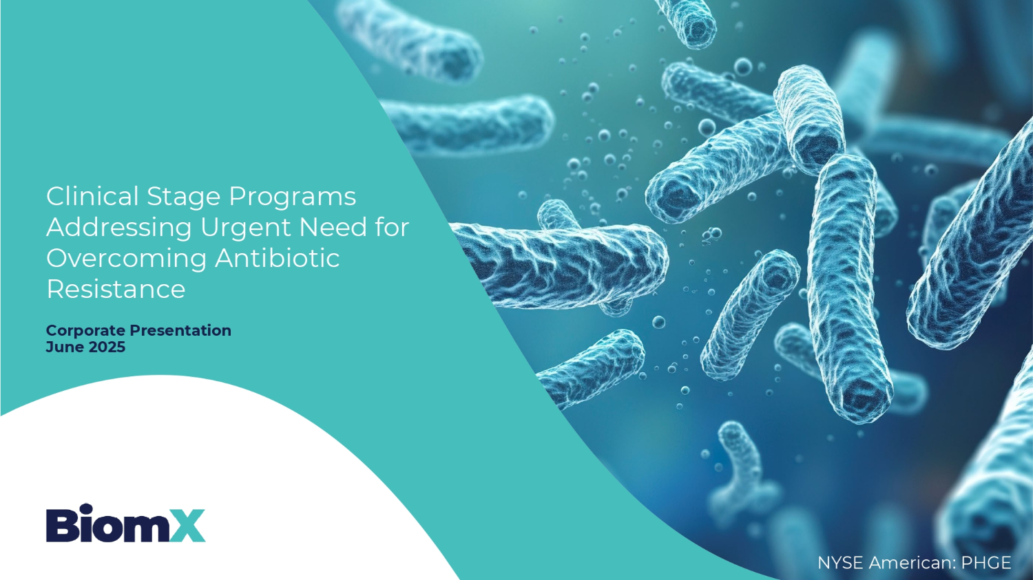 Corporate Presentation June 2025 Clinical Stage Programs Addressing Urgent Need for Overcoming Antibiotic Resistance NYSE American: PHGE SAFE HARBOR STATEMENT About this Presentation The information contained in this presentation has been prepared by BiomX Inc. and its subsidiaries (collectively, the “Company” or “ BiomX ”) and contains information pertaining to the business and operations of the Company. The information contained in this presentation is current only as of the date on its cover. For an y t ime after the cover date of this presentation, the information, including information concerning our business, financial condition, results of operations and prospects, may have changed. The delivery of this presentation shall not, under any circumstances, create any implication that there have been no changes in our affairs after the date of this presentation. We have not authorized any pe rso n to give any information or to make any representations about us in connection with this presentation that is not contained herein. If any information has been or is given or any representation s h ave been or are made to you outside of this presentation, such information or representations should not be relied upon as having been authorized by us. Forward - Looking Statements This presentation contains certain “forward - looking statements” within the meaning of the “safe harbor” provisions of the U.S. P rivate Securities Litigation Reform Act of 1995. Forward - looking statements can be identified by words such as: “target,” “believe,” “expect,” “will,” “may,” “anticipate,” “estimate,” “would ,” “positioned,” “future,” and other similar expressions that predict or indicate future events or trends or that are not statements of historical matters. Forward - looking statements are neither historical fact s nor assurances of future performance. Instead, they are based only on BiomX management’s current beliefs, expectations and assumptions. For example, when we discuss future potential clinical trials, in cl uding their design, objectives, costs, endpoints, potential benefits and timing thereof, the potential outcomes of discussions that we may have with the U.S. Food and Drug Administration (“FDA”) an d foreign regulatory agencies, including timing thereof, the use of Real World Evidence and potential to obtain accelerated approval, among others, potential commercial opportunities, the poten tia l to use our product candidates for new indications, our financial needs to fund future clinical trials, forecasted expenses and our ability to protect our intellectual property assets in the fut ure we are making forward - looking statements. In addition, past and current pre - clinical and clinical results, as well as compassionate use, are not indicative and do not guarantee future success of BiomX clinical trials. Because forward - looking statements relate to the future, they are subject to inherent uncertainties, risks and changes in circumstances that are difficult to predict and many of whic h a re outside of our control. Actual results and outcomes may differ materially from those indicated in the forward - looking statements. Therefore, you should not rely on any of these forward - lookin g statements. You should review additional disclosures we make in our filings with the Securities and Exchange Commission (the “SEC”), which are available on the SEC’s website at www.sec.gov. Exc ept as required by law, we are under no duty to (and expressly disclaim any such obligation to) update or revise any of the forward - looking statements, whether as a result of new information, future e vents or otherwise. No Offer or Solicitation This presentation is for informational purposes only. Nothing in this presentation constitutes an offer to buy or sell or a s oli citation of an offer to buy or sell investments, loans, securities, partnership interests, commodities or any other financial instruments. This presentation and any oral statements made in connection with thi s presentation do not constitute and may not be used for or in connection with, an offer or solicitation by anyone in any state or jurisdiction in which such an offer or solicitation is no t a uthorized or permitted, or to any person to whom it is unlawful to make such offer or solicitation. Trademarks and Service Marks The trademarks and service marks included herein are the property of the owners thereof and are used for reference purposes o nly . Such use should not be construed as an endorsement of such products. FDA This presentation concerns certain products that are under clinical investigation and which have not yet been cleared for mar ket ing by the FDA. These products are currently limited by federal law to investigational use, and no representation is made as to the safety or effectiveness of these products for the purposes for w hic h they are being investigated.