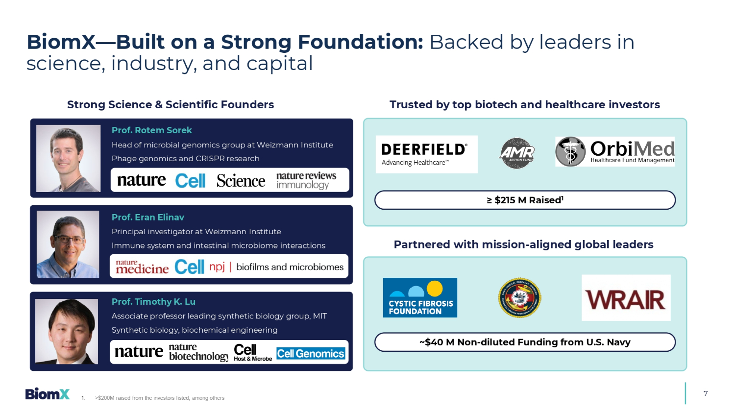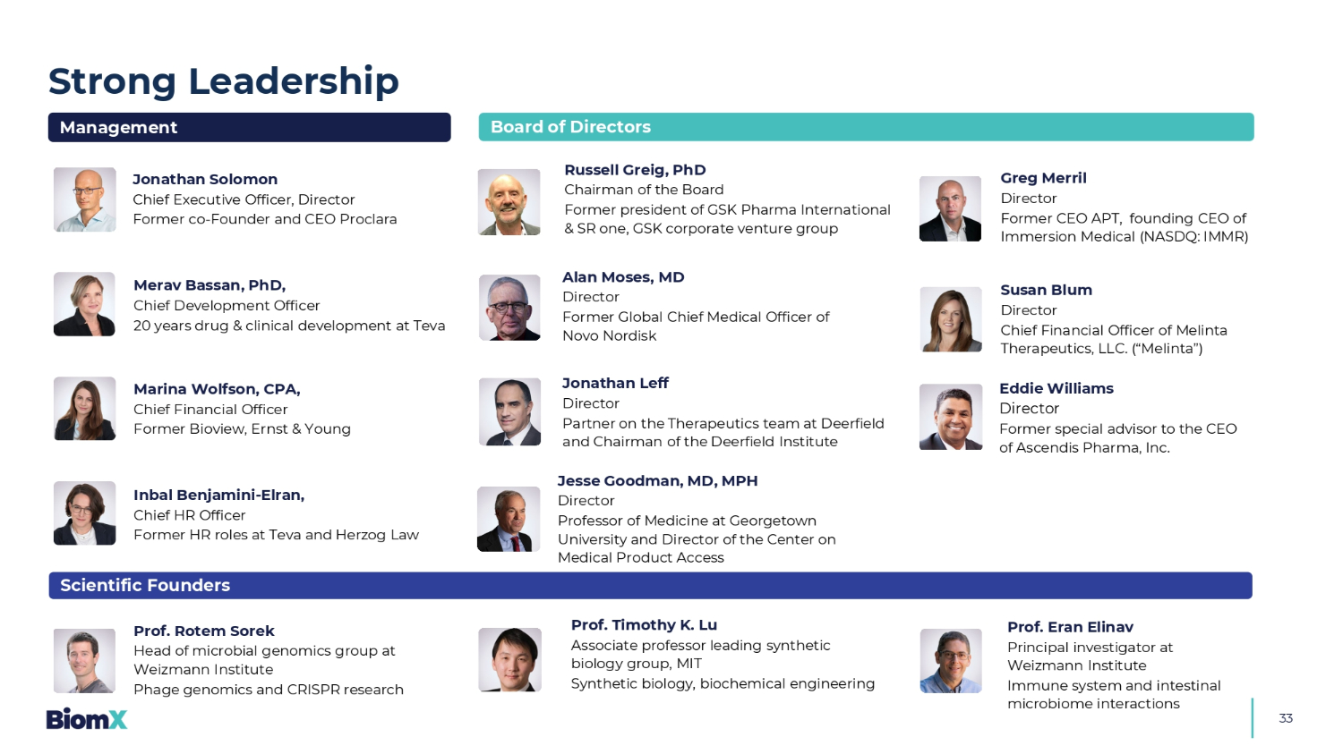Rotem Sorek Head of microbial genomics group at Weizmann Institute Phage genomics and CRISPR research Prof. Eran Elinav Principal investigator at Weizmann Institute Immune system and intestinal microbiome interactions Prof. Timothy K. Lu Associate professor leading synthetic biology group, MIT Synthetic biology, biochemical engineering Trusted by top biotech and healthcare investors ≥ $200 M Raised 1 Partnered with mission - aligned global leaders ~$40 M Non - diluted Funding from U.S. Navy BiomX — Built on a Strong Foundation: Backed by leaders in science, industry, and capital 1.