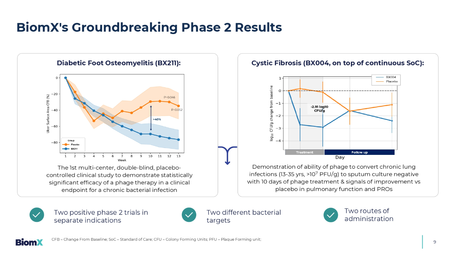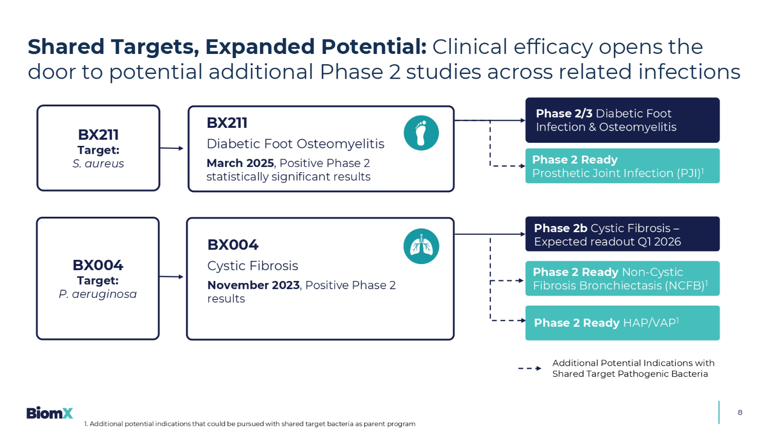 >$200M raised form the investors listed, among others 8 Additional Potential Indications with Shared Target Pathogenic Bacteria BX004 Cystic Fibrosis November 2023 , Positive Phase 2 results BX211 Diabetic Foot Osteomyelitis March 2025 , Positive Phase 2 statistically significate results BX211 Target: S. aureus BX004 Target: P. aeruginosa Phase 2b Cystic Fibrosis – Expected readout Q1 2026 Phase 2 Ready Non - Cystic Fibrosis Bronchiectasis (NCFB) 1 Phase 2 Ready HAP/VAP 1 Phase 2/3 Diabetic Foot Infection & Osteomyelitis Phase 2 Ready Prosthetic Joint Infection (PJI) 1 Shared Targets, Expanded Potential: Clinical efficacy opens the door to potential additional Phase 2 studies across related infections 1.