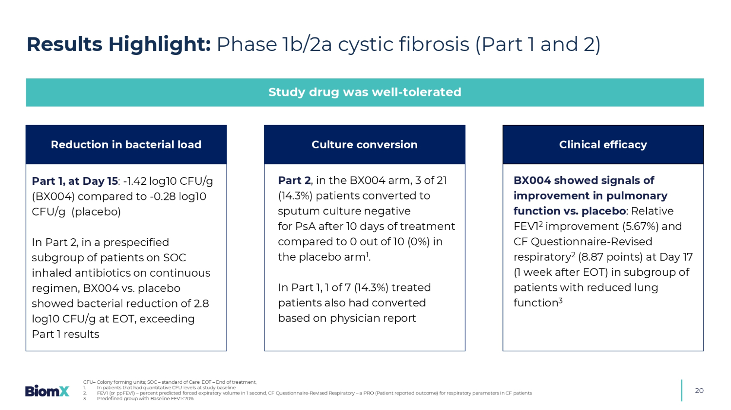 CFF Annual Data Report 2019, ECFS patient registry report, 2020 Airway with CF Thickened Mucus 19 E nrollment : 43 CF patients with chronic PsA infections Standard of care antibiotic, no restriction on CFTR modulators Treated – 7 subjects Control – 2 subjects Treated – 23 subjects Control – 11 subjects Part 1 1 7 days - Single ascending dose followed by multiple doses 2 Part 2 10 days of same dose, twice daily Phase 1b/2a Study Design: Multicentered, double blind, placebo - controlled study to assess safety, reduction of PsA burden and improvement in clinical outcomes CFTR - cystic fibrosis transmembrane conductance regulator; Image of phage product is intended as an illustration only, and may not represent the number of phages administered 1. Study design informed by input from the CF Foundation 2.