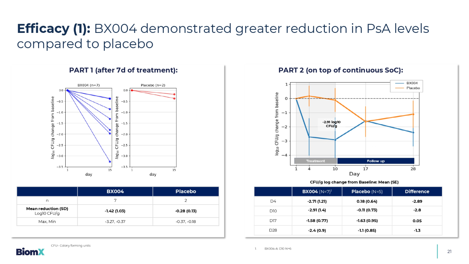 7 days duration - 3 ascending, 4 multiple dosing Topline results from Part 1 and 2 available • Safety and tolerability • Decrease in PsA burden • FEV1 (forced expiratory volume) • CFQ - R (CF Questionnaire - Revised) and CRISS Key Endpoints: BX004 Intervention: Nebulized dose 20 Results Highlight: Phase 1b/2a cystic fibrosis (Part 1 and 2) Study drug was well - tolerated Part 1, at Day 15 : - 1.42 log10 CFU/g (BX004) compared to - 0.28 log10 CFU/g (placebo) In Part 2, i n a prespecified subgroup of patients on SOC inhaled antibiotics on continuous regimen, BX004 vs. placebo showed bacterial reduction of 2.8 log10 CFU/g at EOT, exceeding Part 1 results BX004 showed signals of improvement in pulmonary function vs. placebo : Relative FEV1 2 improvement (5.67%) and CF Questionnaire - Revised respiratory 2 (8.87 points) at Day 17 (1 week after EOT) in subgroup of patients with reduced lung function 3 Part 2 , in the BX004 arm, 3 of 21 (14.3%) patients converted to sputum culture negative for PsA after 10 days of treatment compared to 0 out of 10 (0%) in the placebo arm 1 . In Part 1, 1 of 7 (14.3%) treated patients also had converted based on physician report Reduction in bacterial load Culture conversion Clinical efficacy CFU – Colony forming units; SOC – standard of Care: EOT – End of treatment, 1. In patients that had quantitative CFU levels at study baseline 2. FEV1 (or ppFEV1) – percent predicted forced expiratory volume in 1 second, CF Questionnaire - Revised Respiratory – a PRO (Patient reported outcome) for respiratory parameters in CF patients 3.