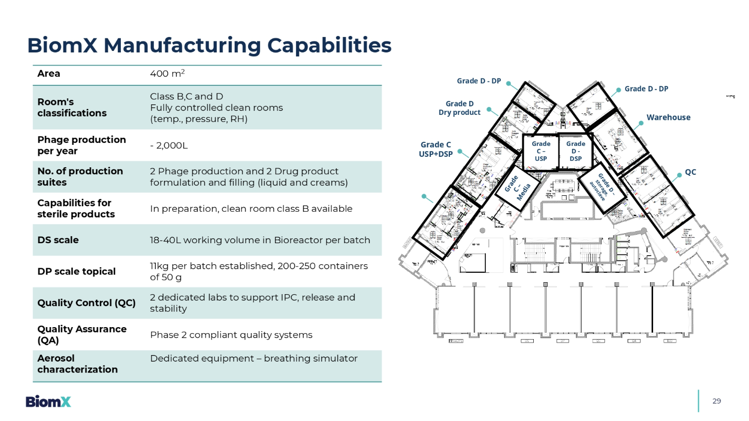 al, JME, Apr 2024 Image source: Cleveland Clinic: Bronchiectasis >1 M A chronic progressive inflammatory lung disease with: 0 Diagnosed patients (US, EU5, Japan) 1 Approved treatments Non - Cystic Fibrosis Bronchiectasis (NCFB) Worse Clinical Symptoms and More Inpatient / Outpatient Encounters Associated with PsA Infections 2 2.6 1.3 1.0 1.2 0.5 0.3 Any Admission* Readmission* ICU Stay* 1.1 20.6 13.6 8.1 0.9 11.0 4.1 5.4 Outpatient* Hospital Office Visit* Home* Healthcare Other Inpatient Admissions per Pt (1 yr) Out patient Admissions per Pt (1 yr) Bacteria linked to CF and NCFB are largely the same — highlighting strong scientific rationale and disease overlap that support pursuing NCFB * P < 0.05 PsA+ PsA - PsA+ PsA -28 GMP Production Experience Internal GMP Facility (BiomX): x 10 drug substance (DS) batches at 4 – 20 L scale x Clinical - scale master phage seed (MPS) manufacturing (~ 300 vials) x DP cream/gel manufacturing (up to 11 kg batches in 50 g containers) x Sterile drug product (DP) manufacturing (up to 900 vials/batch) External CMO Partnerships (Supplemental Capacity): x 10 MPS and corresponding production banks ( 300 – 500 vials each) x Multi - phage DS production at 4 – 50 L scale x Sterile DP manufacturing (up to 3,000 vials/batch) Regulatory Experience x Successfully engaged in 4 pre - IND interactions across diverse routes of administration: oral, systemic, topical, and inhaled x Multiple active INDs and IMPDs supporting early - and mid - stage clinical development x Demonstrated regulatory alignment for first - in - human (FIH) and Phase 2 trials x Experience with regulatory submissions in both the U.S. and EU , including oral, inhaled, and topical phage delivery formats Integrated model provides flexibility and scalability to support clinical and development - stage programs 29 400 m 2 Area Class B,C and D Fully controlled clean rooms (temp., pressure, RH) Room's classifications - 2,000L Phage production per year 2 Phage production and 2 Drug product formulation and filling (liquid and creams) No.