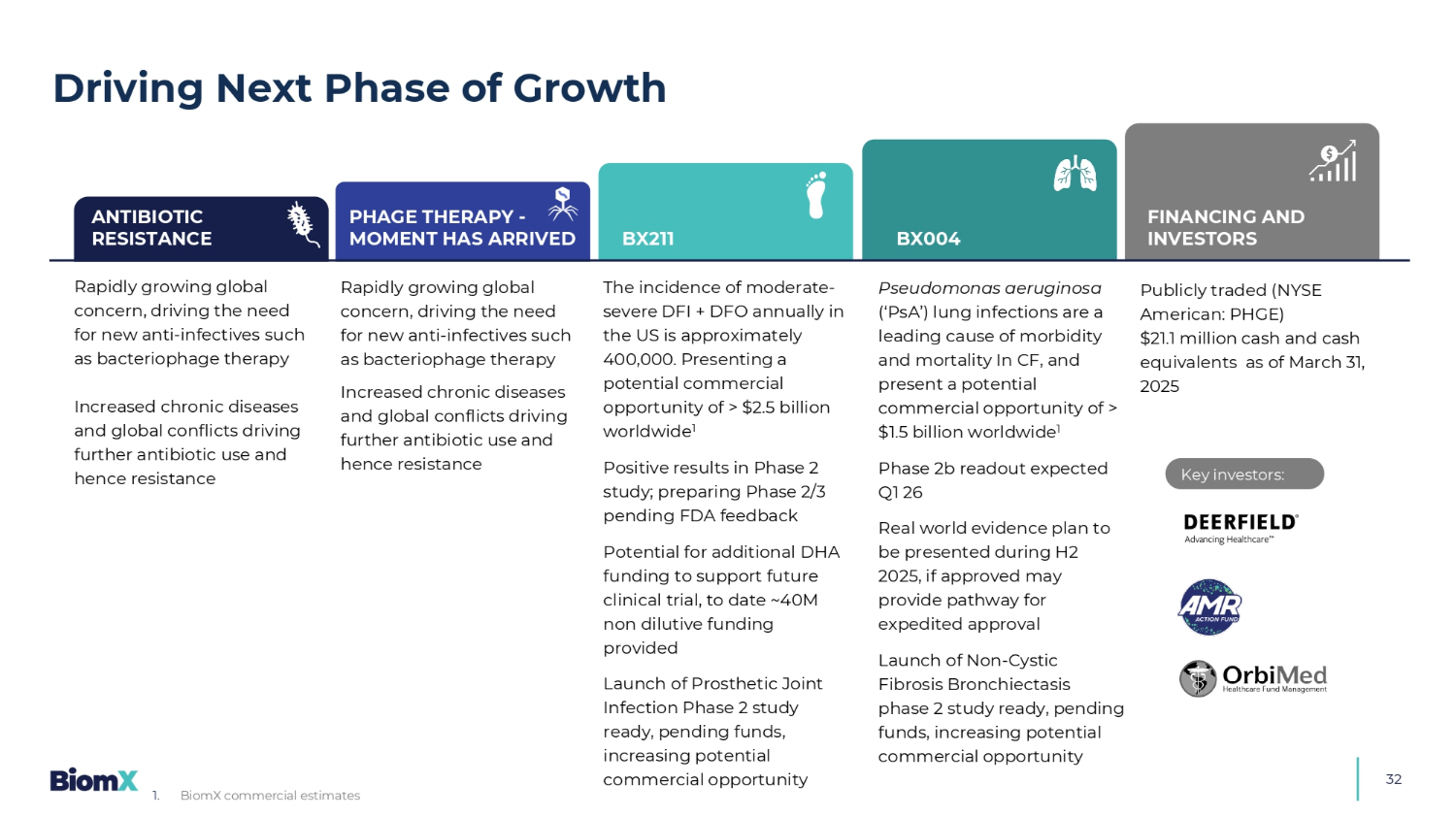 of production suites In preparation, clean room class B available Capabilities for sterile products 18 - 40L working volume in Bioreactor per batch DS scale 11kg per batch established, 200 - 250 containers of 50 g DP scale topical 2 dedicated labs to support IPC, release and stability Quality Control (QC) Phase 2 compliant quality systems Quality Assurance (QA) Dedicated equipment – breathing simulator Aerosol characterization BiomX Manufacturing Capabilities Grade C USP+DSP Grade D Dry product Grade D - DP Grade D - DP Grade D - DSP Grade C – USP Warehouse QC 30 • 3 patent families with expirations through 2045, covering key aspects of phage discovery, formulation, and application • 2 families in national phase (USA, Europe, Japan, Australia, Canada, China) and 1 in pre - PCT stage , ensuring global protection • Comprehensive IP coverage includes: • Therapeutic phage cocktails (e.g., Staphylococcus, Pseudomonas) • Broad phage combination strategies • Claims on phage synergy to suppress resistance/mutant escape • Genetic sequence variants and engineering strategies • Synthetic phages with heterologous sequences • Use of phages in combination with antibiotics Freedom - to - operate strategy in major markets Claims designed to support both clinical assets and future pipeline expansion Ongoing IP filings to expand coverage of novel phage constructs and production methods Robust IP Portfolio Protecting Core Phage Assets Through 2045 Rapidly growing global concern, driving the need for new anti - infectives such as bacteriophage therapy Increased chronic diseases and global conflicts driving further antibiotic use and hence resistance The incidence of moderate - severe DFI + DFO annually in the US is approximately 400,000 . Presenting a potential commercial opportunity of > $2.5 billion worldwide 1 Positive results in P hase 2 study; preparing Phase 2/3 pending FDA feedback Potential for additional DHA funding to support future clinical trial, to date ~40M non dilutive funding provided Launch of Prosthetic Joint Infection Phase 2 study ready, pending funds, increasing potential commercial opportunity Pseudomonas aeruginosa ( ‘ PsA ’ ) lung infections are a leading cause of morbidity and mortality In CF, and present a potential commercial opportunity of > $ 1.5 billion worldwide 1 Phase 2 b readout expected Q 1 26 Real world evidence plan to be presented during H 2 2025 , if approved may provide pathway for expedited approval Launch of Non - Cystic Fibrosis Bronchiectasis phase 2 study ready, pending funds, increasing potential commercial opportunity Publicly traded ( NYSE American: PHGE ) $ 21.2 million cash and cash equivalents as of M arch 31 , 2025 ANTIBIOTIC RESISTANCE PHAGE THERAPY - MOMENT HAS ARRIVED Rapidly growing global concern, driving the need for new anti - infectives such as bacteriophage therapy Increased chronic diseases and global conflicts driving further antibiotic use and hence resistance BX 2 11 BX004 FINANCING AND INVESTORS Key investors: Driving Next Phase of Growth 32 1. BiomX commercial estimates