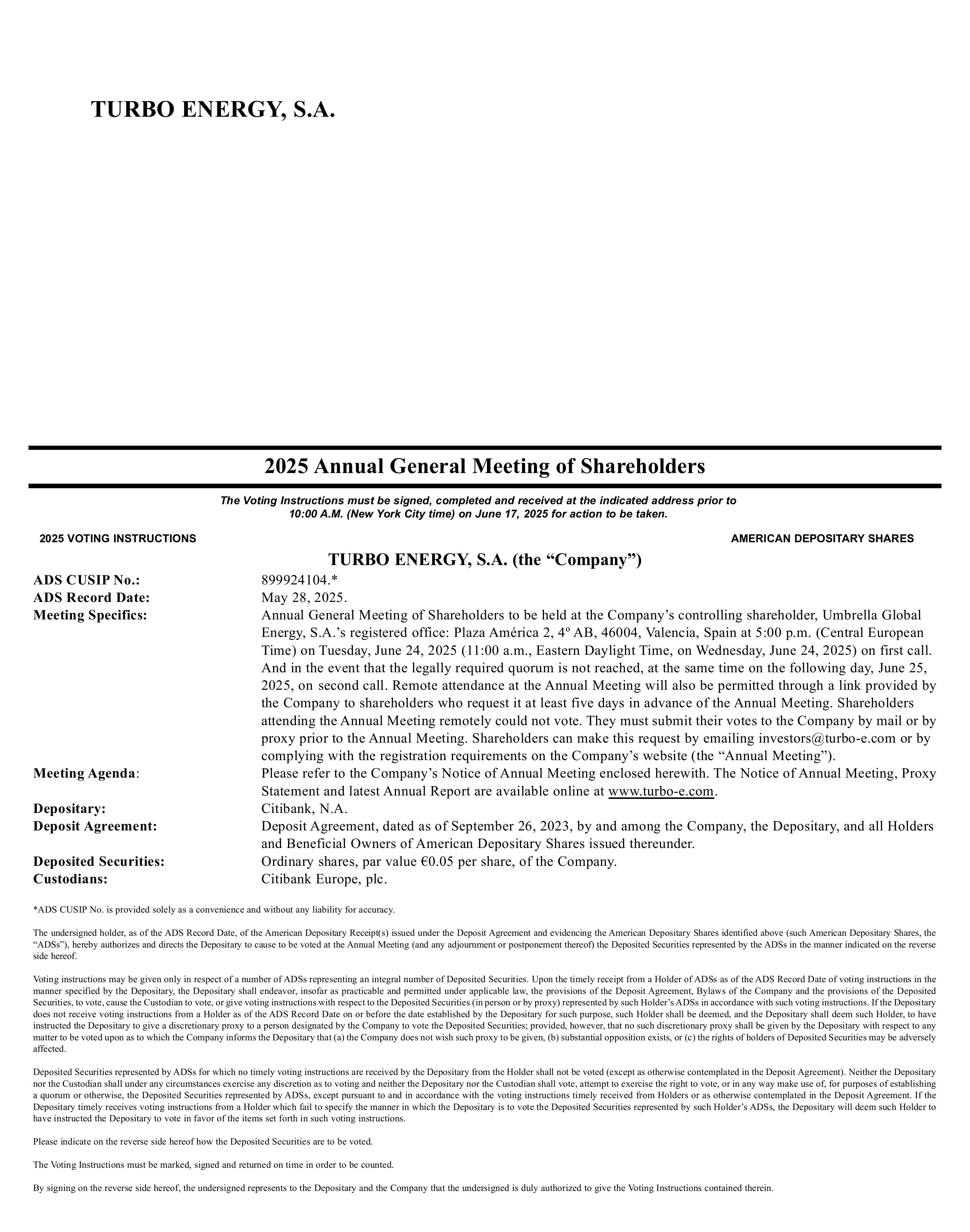 Notice is hereby given that the 2025 Annual General Meeting of Shareholders (the “Annual Meeting”) of Turbo Energy, S.A., a corporation with limited liability organized under the laws of the Kingdom of Spain (the “Company,” “we,” “us” or “our”) will be held at the Company’s controlling shareholder Umbrella Global Energy, S.A.’s registered office located at Plaza América 2, 4º AB, 46004, Valencia, Spain at 5:00 P.M. (Central European Time) on Tuesday, June 24, 2025 (11:00 A.M., Eastern Daylight Time, on Wednesday, June 24, 2025) on first call. And in the event that the legally required quorum is not reached, at the same time on the following day, June 25, 2025, on second call. Remote attendance at the Annual Meeting will also be permitted through a link provided by the Company to shareholders who request it at least five days in advance of the Annual Meeting. Shareholders attending the Annual Meeting remotely can not vote. They must submit their votes to the Company by mail or by proxy prior to the Annual Meeting. Shareholders can make this request by emailing investors@turbo-e.com or by complying with the registration requirements on the Company’s website.