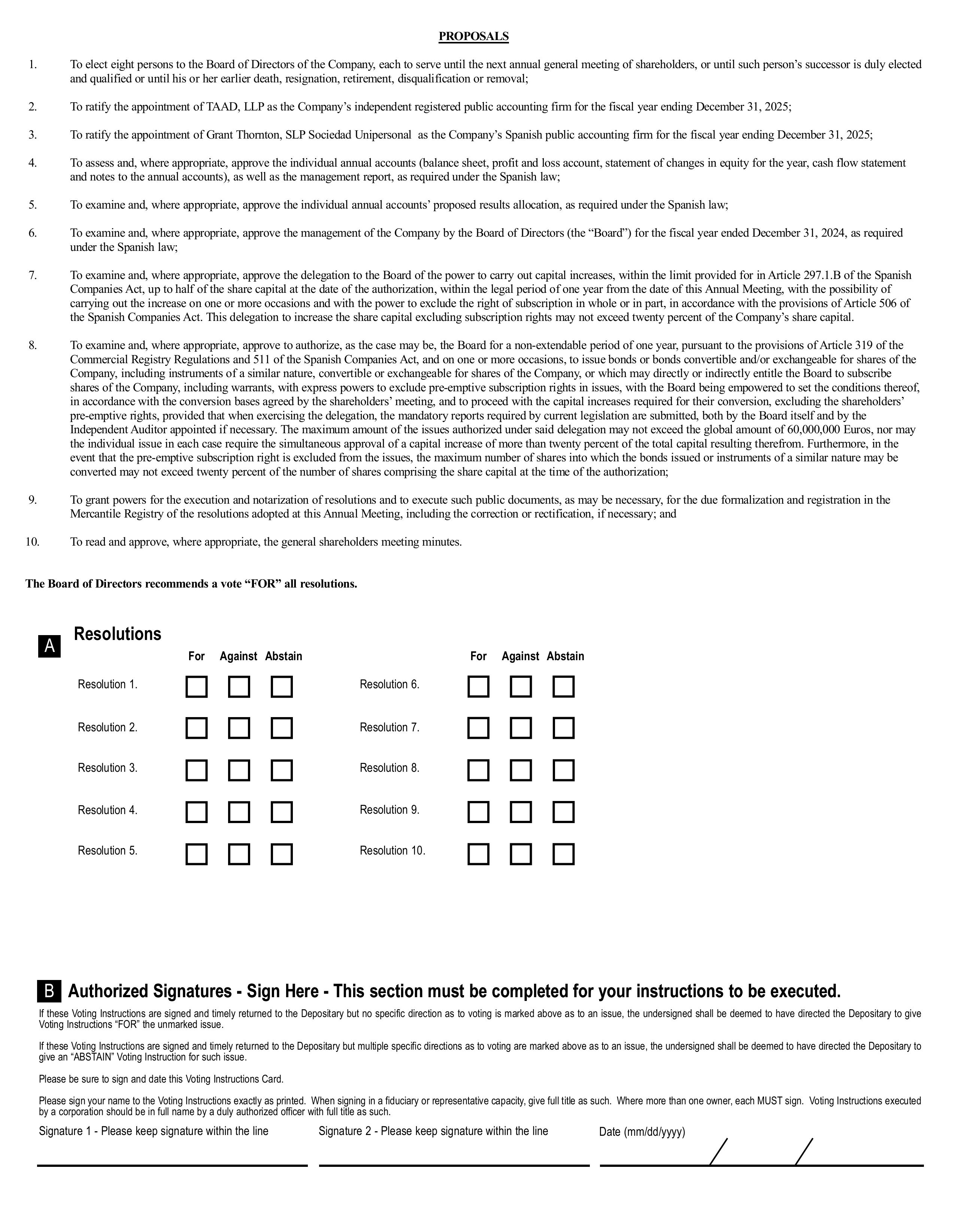3. To ratify the appointment of Grant Thornton, SLP Sociedad Unipersonal as the Company’s Spanish public accounting firm for the fiscal year ending December 31, 2025;