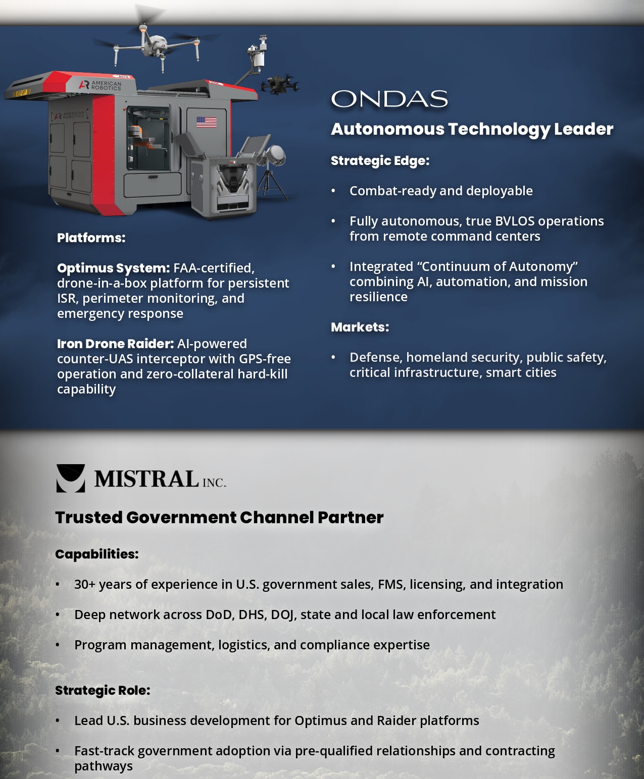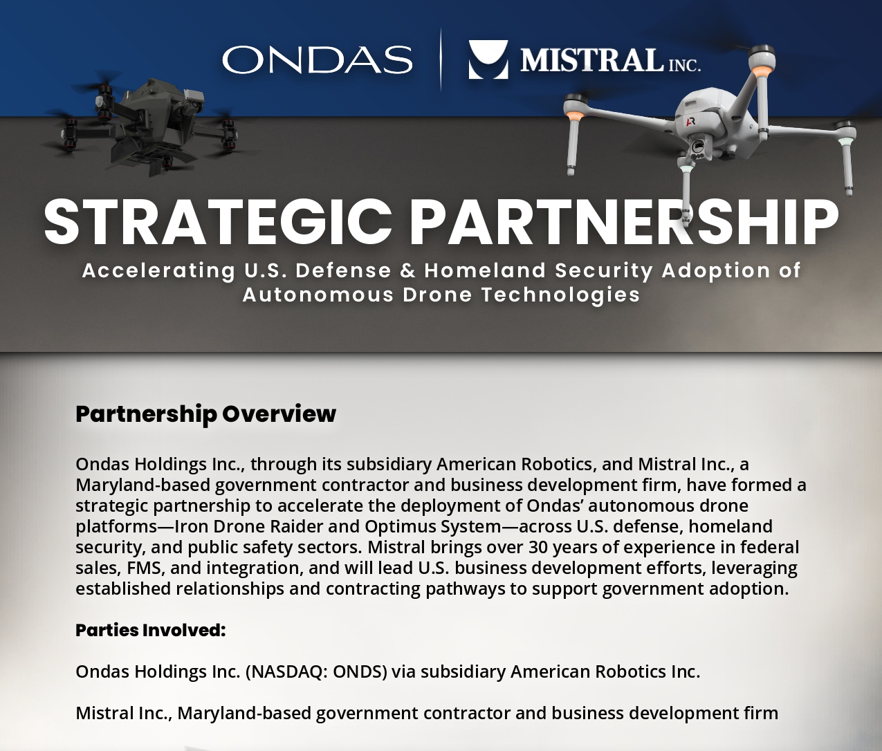 STRATEGIC PARTNERSHIP Accelerating U.S. Defense & Homeland Security Adoption of Autonomous Drone Technologies Partnership Overview Ondas Holdings Inc., through its subsidiary American Robotics, and Mistral Inc., a Maryland-based government contractor and business development firm, have formed a strategic partnership to accelerate the deployment of Ondas’ autonomous drone platforms—Iron Drone Raider and Optimus System—across U.S. defense, homeland security, and public safety sectors. Mistral brings over 30 years of experience in federal sales, FMS, and integration, and will lead U.S. business development efforts, leveraging established relationships and contracting pathways to support government adoption. Parties Involved: Ondas Holdings Inc. (NASDAQ: ONDS) via subsidiary American Robotics Inc. Mistral Inc., Maryland-based government contractor and business development firm