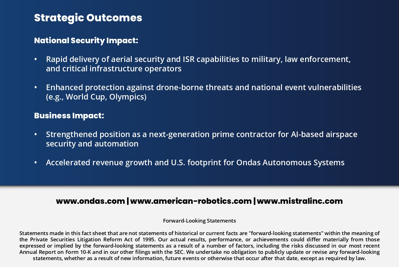 Strategic Outcomes National Security Impact: • Rapid delivery of aerial security and ISR capabilities to military, law enforcement, and critical infrastructure operators • Enhanced protection against drone-borne threats and national event vulnerabilities (e.g., World Cup, Olympics) Business Impact: • Strengthened position as a next-generation prime contractor for AI-based airspace security and automation • Accelerated revenue growth and U.S. footprint for Ondas Autonomous Systems www.ondas.com | www.american-robotics.com | www.mistralinc.com Forward-Looking Statements Statements made in this fact sheet that are not statements of historical or current facts are "forward-looking statements" within the meaning of the Private Securities Litigation Reform Act of 1995. Our actual results, performance, or achievements could differ materially from those expressed or implied by the forward-looking statements as a result of a number of factors, including the risks discussed in our most recent Annual Report on Form 10-K and in our other filings with the SEC. We undertake no obligation to publicly update or revise any forward-looking statements, whether as a result of new information, future events or otherwise that occur after that date, except as required by law.