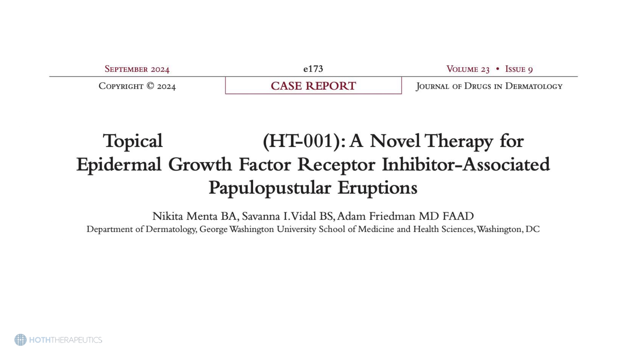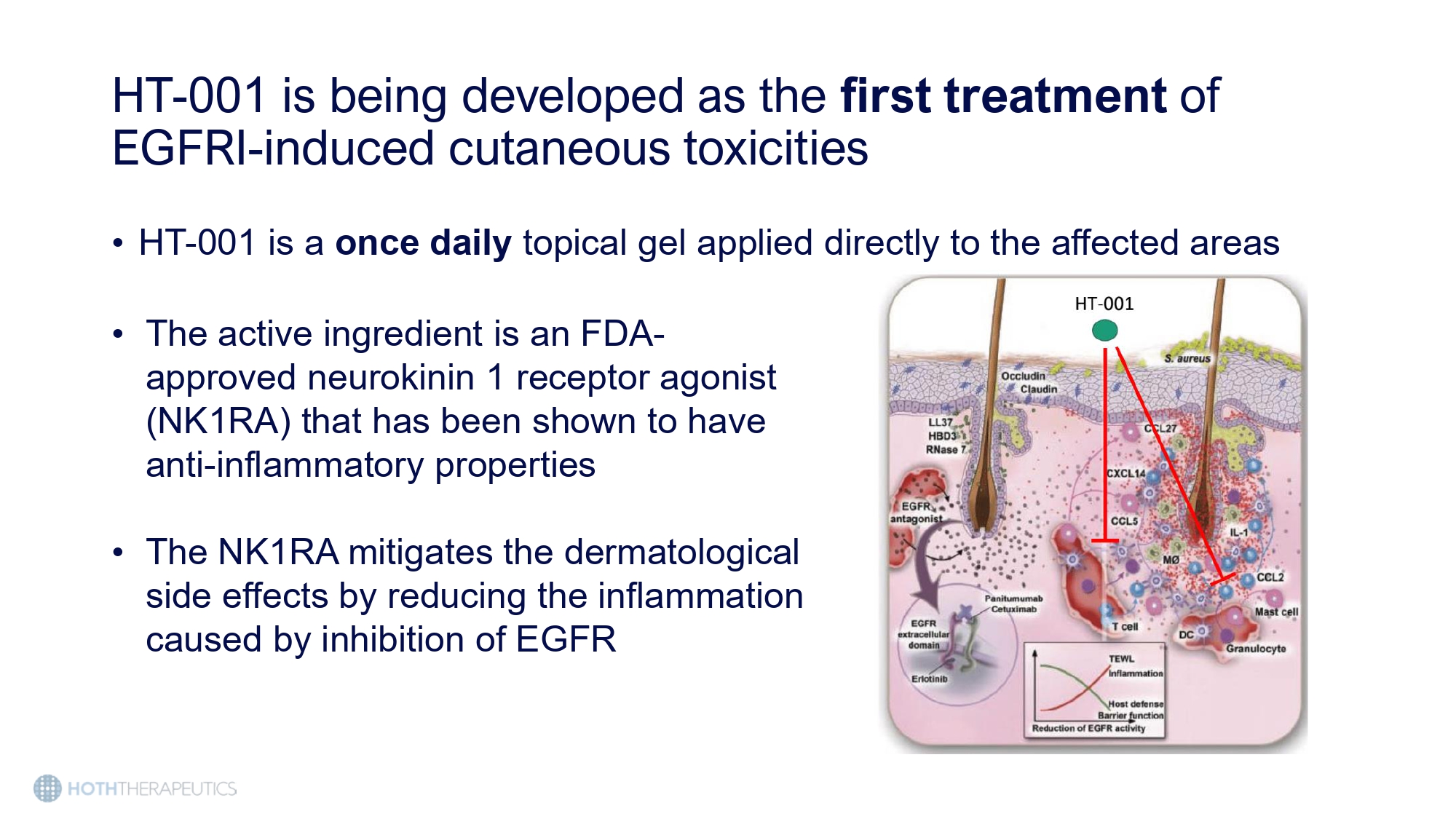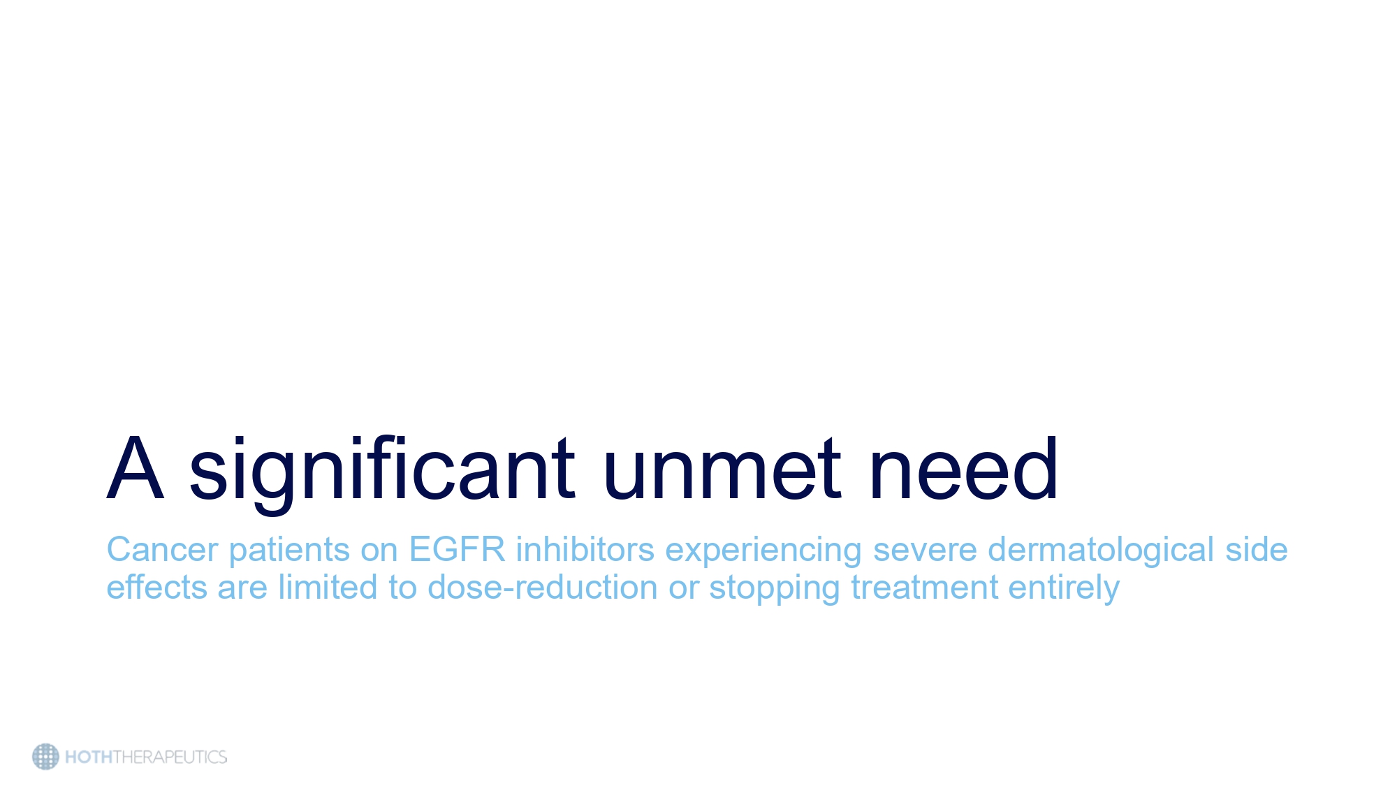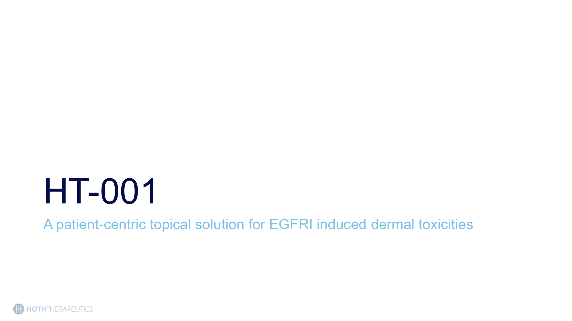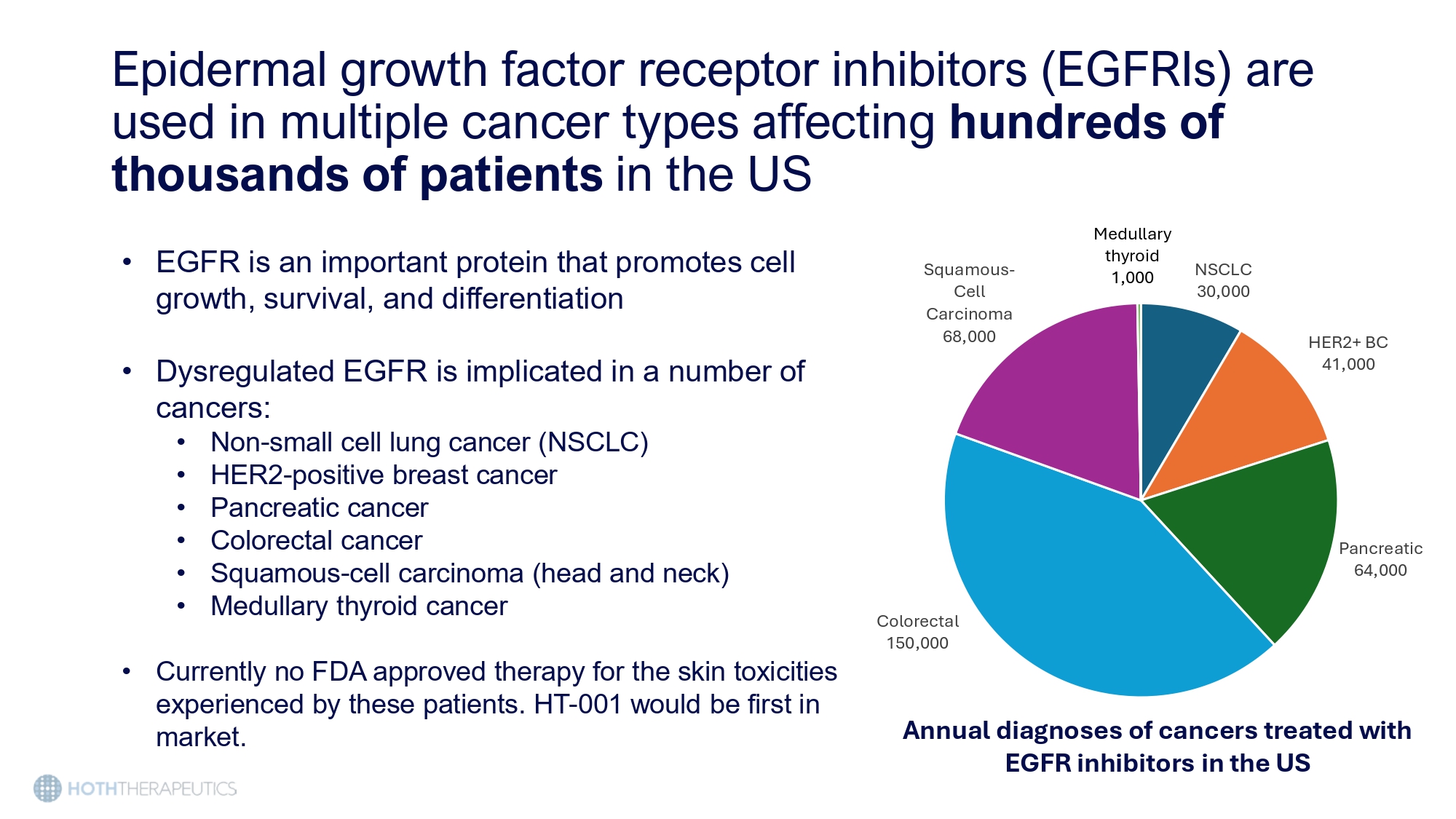 Epidermal growth factor receptor inhibitors (EGFRIs) are used in multiple cancer types affecting hundreds of thousands of patients in the US • EGFR is an important protein that promotes cell growth, survival, and differentiation • Dysregulated EGFR is implicated in a number of cancers: • Non - small cell lung cancer (NSCLC) • HER2 - positive breast cancer • Pancreatic cancer • Colorectal cancer • Squamous - cell carcinoma (head and neck) • Medullary thyroid cancer • Currently no FDA approved therapy for the skin toxicities experienced by these patients. HT - 001 would be first in market.