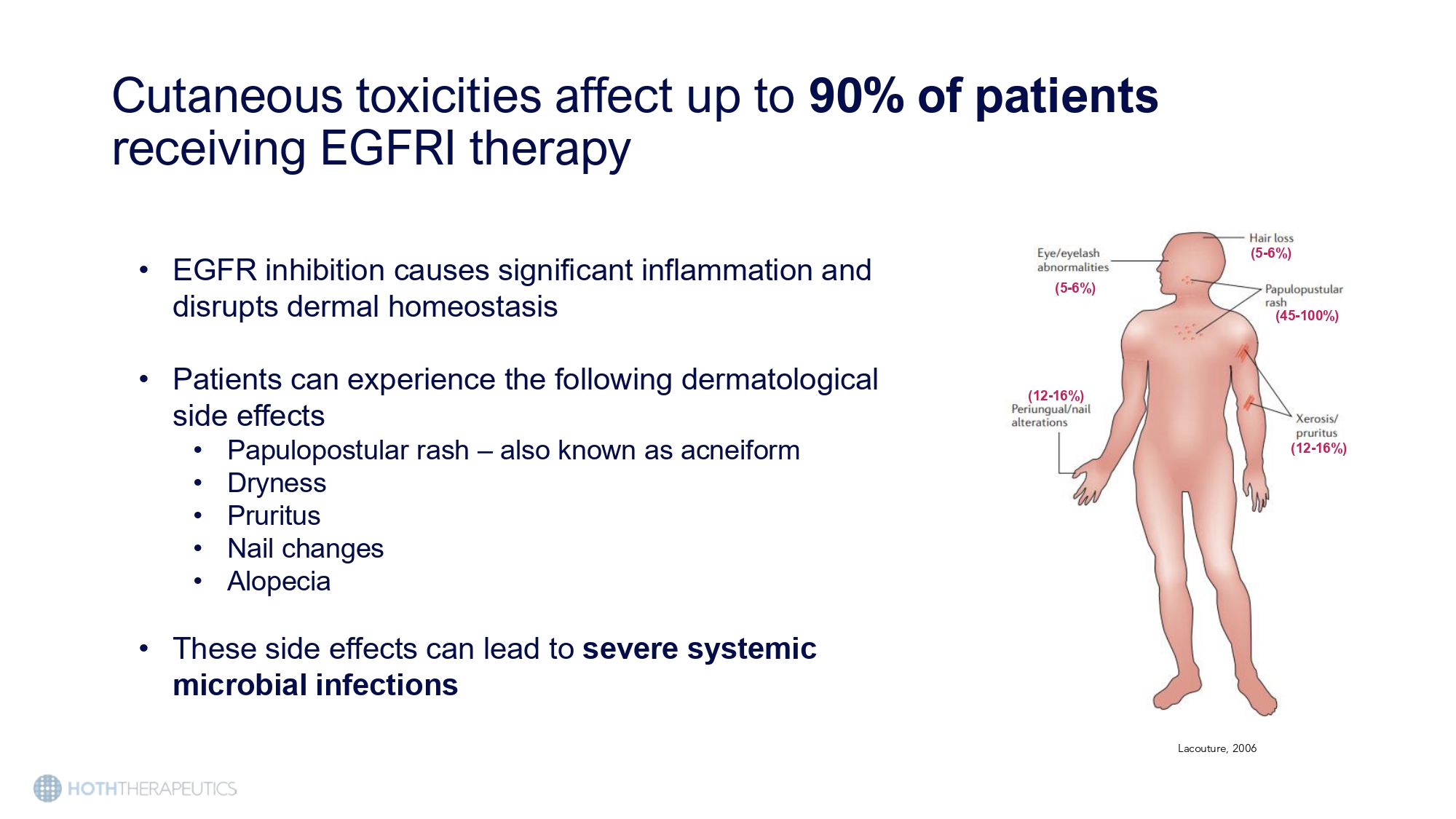 NSCLC 30,000 HER2+ BC 41,000 Pancreatic 64,000 Colorectal 150,000 Squamous - Cell Carcinoma 68,000 Medullary thyroid 1,000 Annual diagnoses of cancers treated with EGFR inhibitors in the US Cutaneous toxicities affect up to 90% of patients receiving EGFRI therapy Lacouture, 2006 • EGFR inhibition causes significant inflammation and disrupts dermal homeostasis • Patients can experience the following dermatological side effects • Papulopostular rash – also known as acneiform • Dryness • Pruritus • Nail changes • Alopecia • These side effects can lead to severe systemic microbial infections (45 - 100%) (12 - 16%) (12 - 16%) (5 - 6%) (5 - 6%)