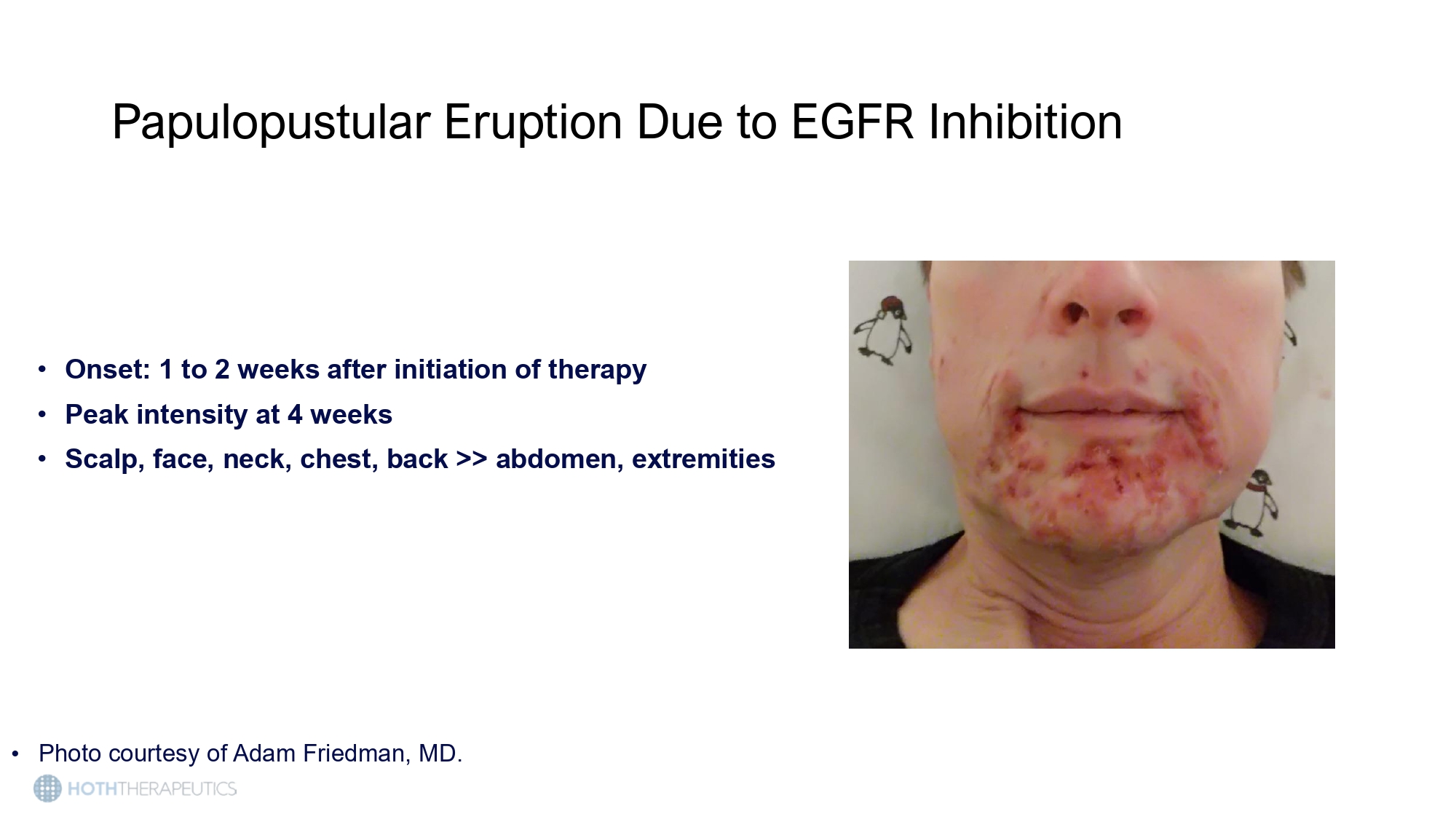 • GFR, epidermal growth factor receptor. 1. Li T, et al. Target Oncol. 2009;4:107 - 119; 2. Photos courtesy of Adam Friedman Papulopustular Eruption Due to EGFR Inhibition Papulopustular Eruption Due to EGFR Inhibition • Onset: 1 to 2 weeks after initiation of therapy • Peak intensity at 4 weeks • Scalp, face, neck, chest, back >> abdomen, extremities • Photo courtesy of Adam Friedman, MD.